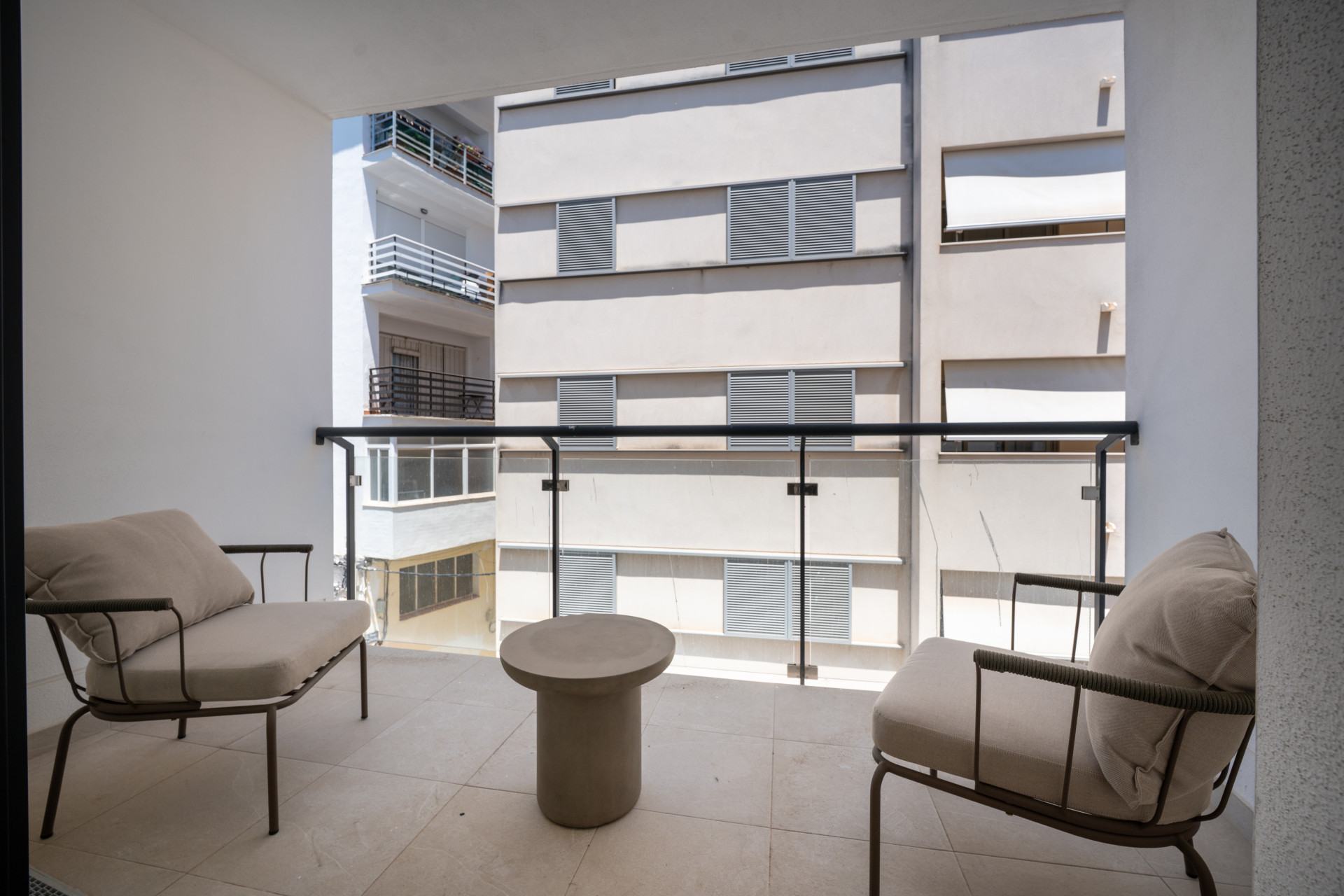 The apartment features a spacious master bedroom with a king-size bed and a second bedroom with two twin beds, perfect for families or small groups. The bright open-plan living and dining area opens onto a private balcony, where you can enjoy your morning coffee or a quiet evening drink. A sleek, fully equipped kitchen and a modern bathroom complete the space, designed with both style and functionality in mind.