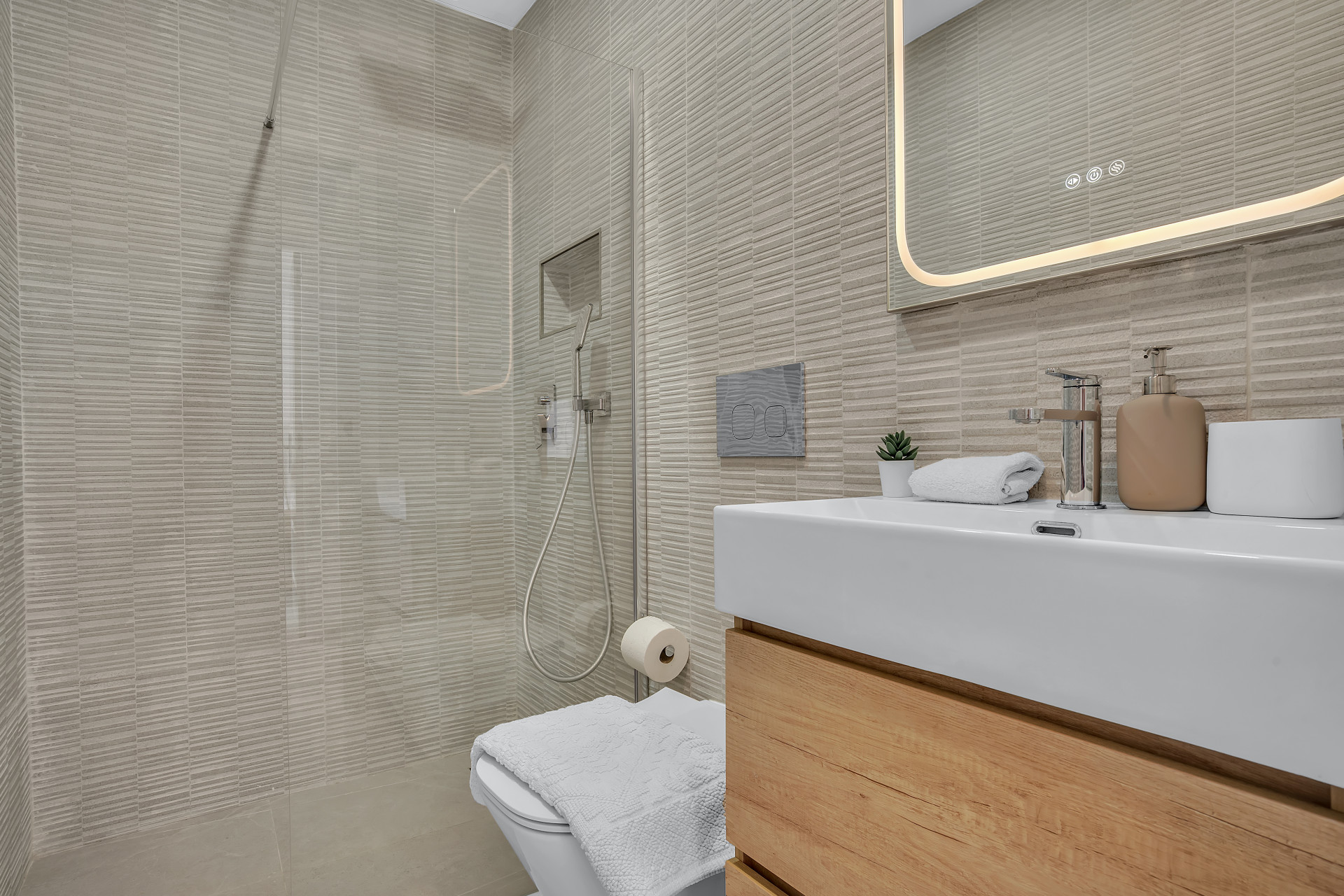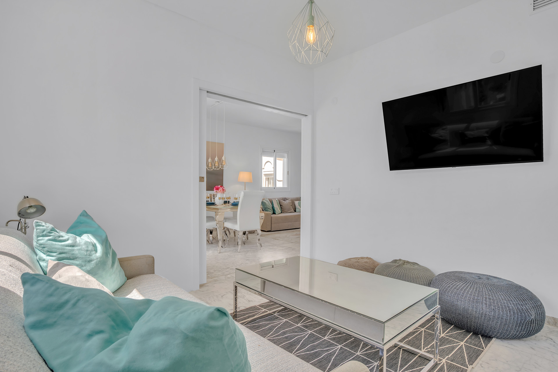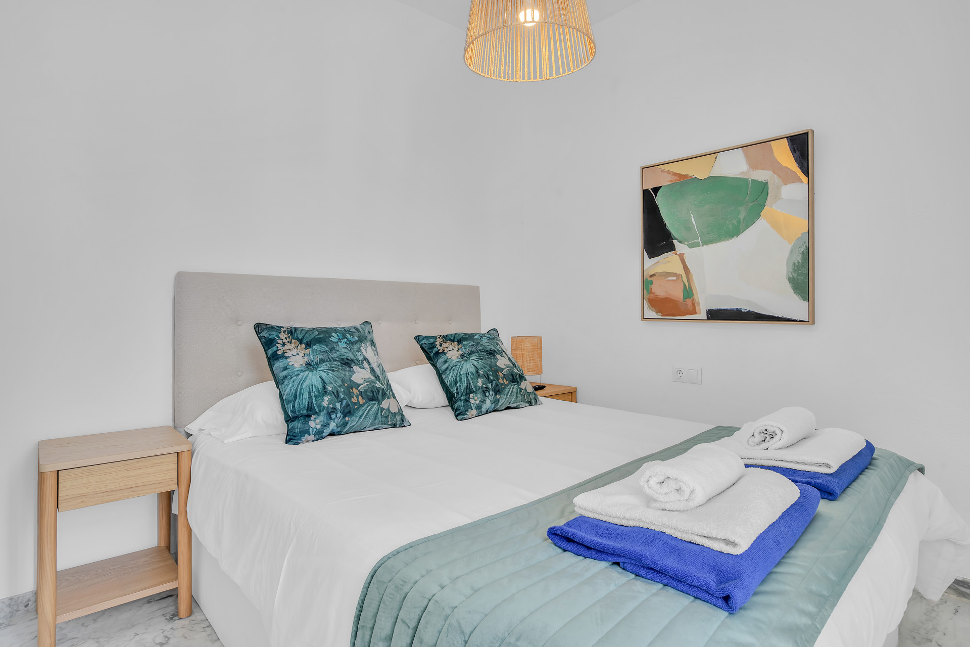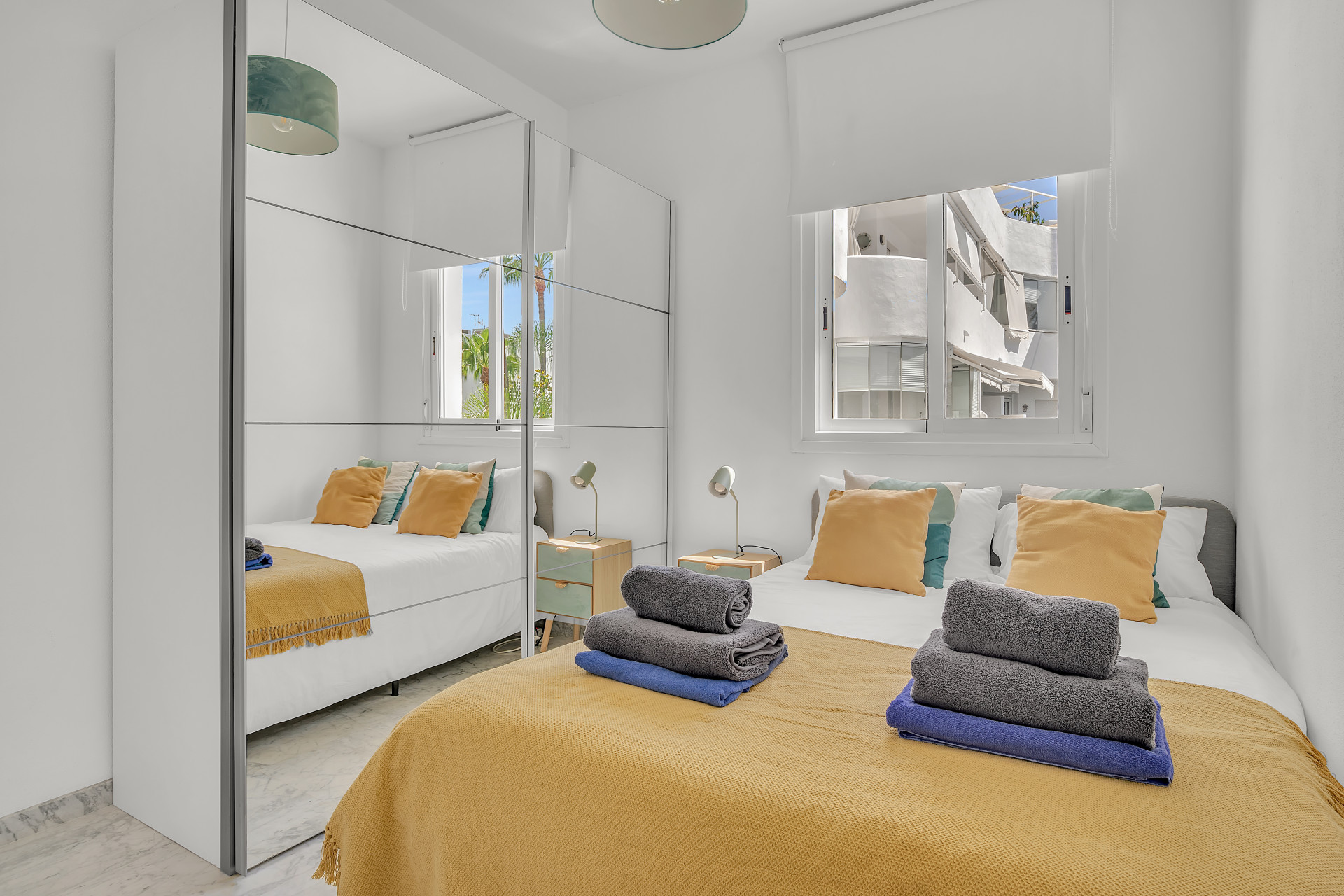 The apartment comprises an open lounge and dining area, all of which has been decorated tastefully to be both convenient and comfortable for six guests. The entire space is light and open, perfect for socialising and relaxing with family on the comfy sofas, or in the dining area with views to the sea. The hallway takes you to the 3 different bedrooms all furnished with king sized beds.