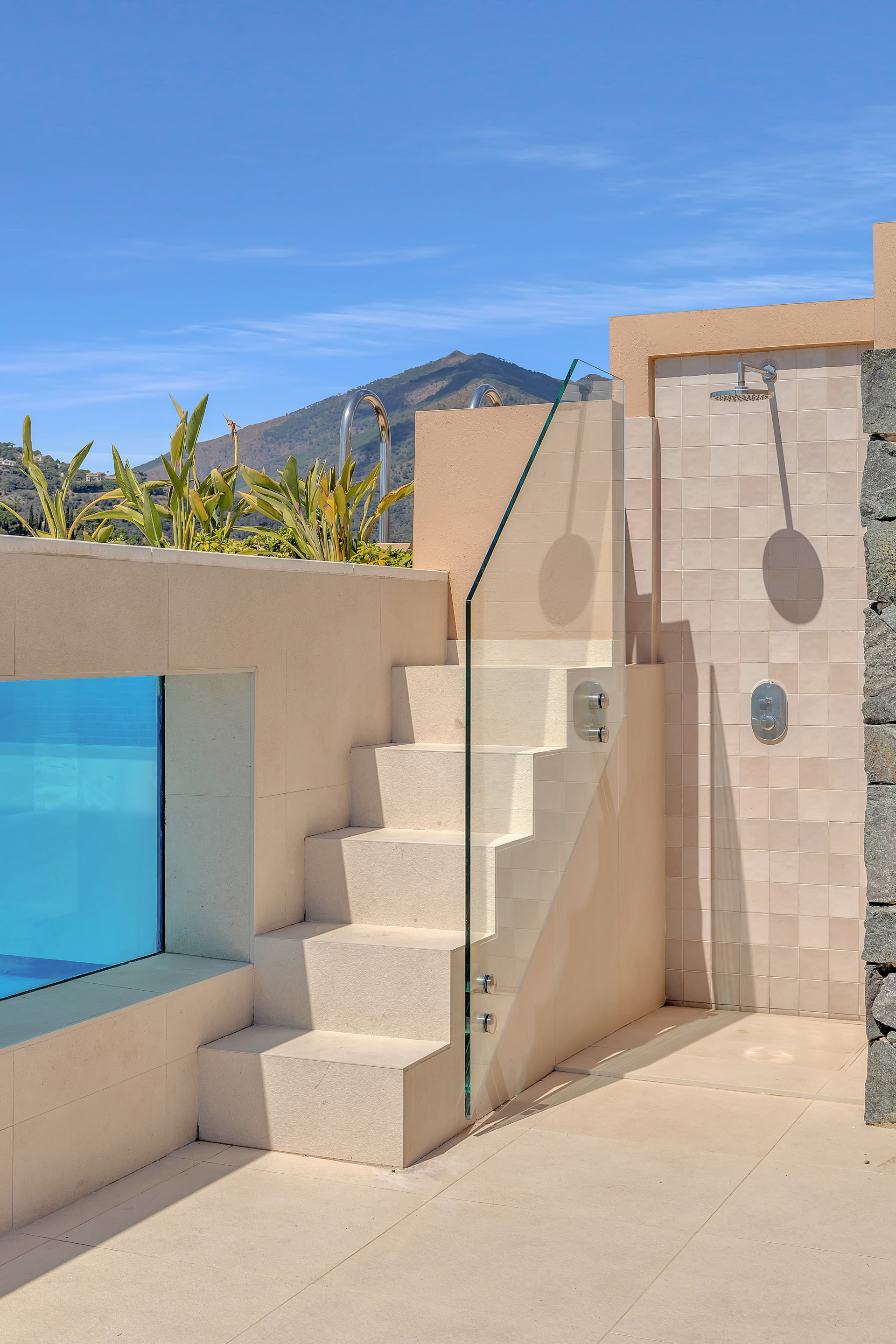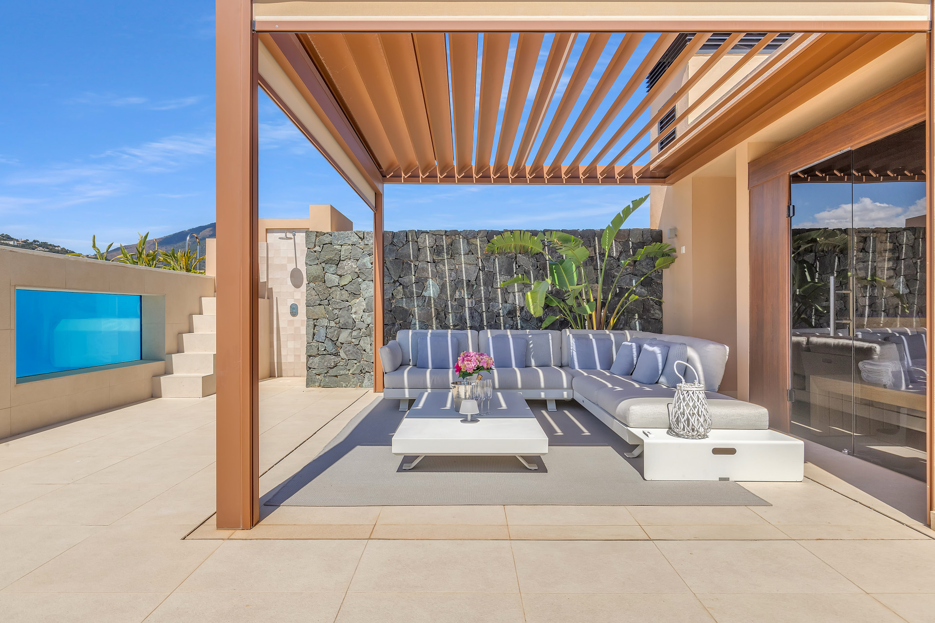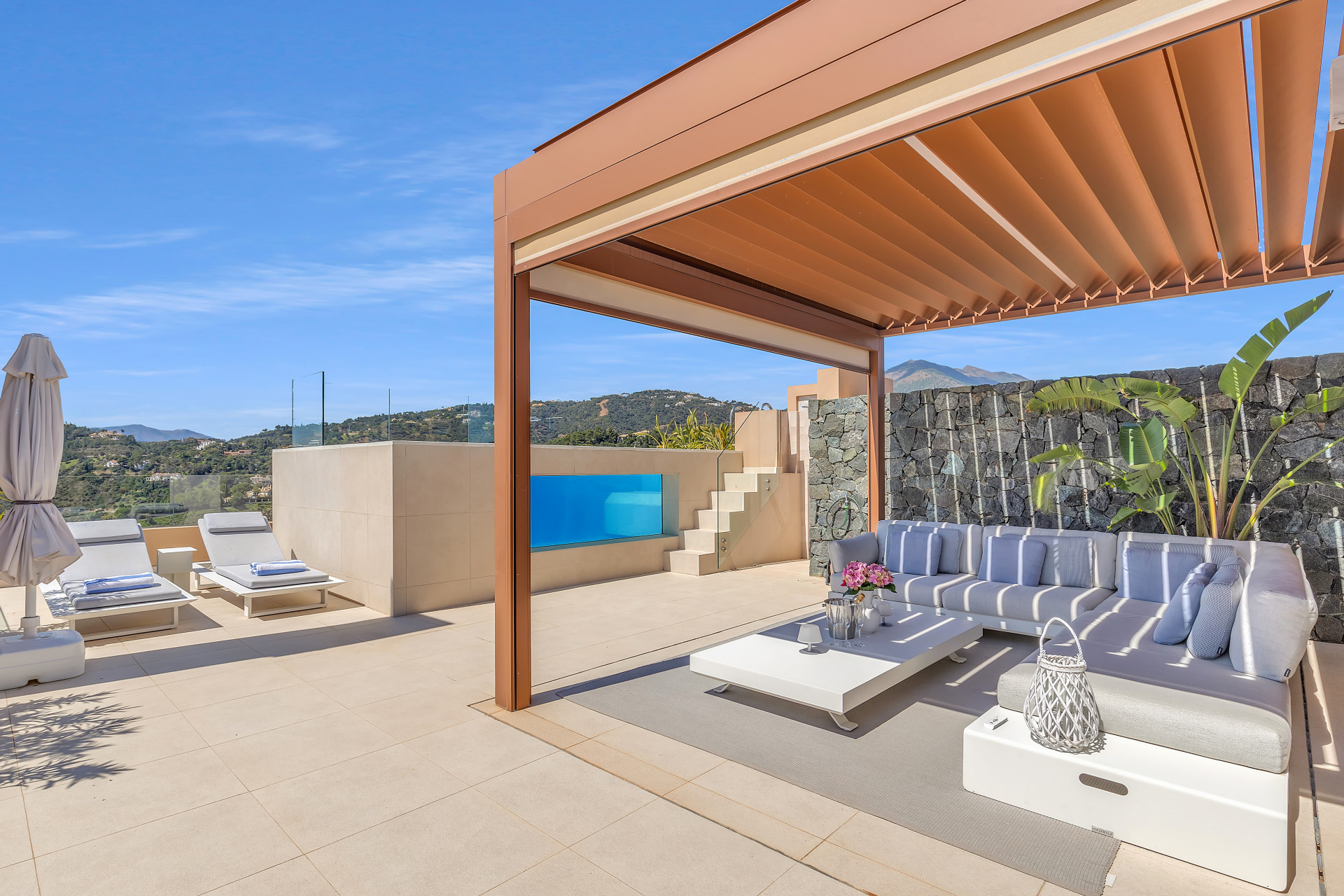 Guests will enjoy the incredible outdoor spaces on offer —a terrace where you can sip your morning coffee while soaking in the peaceful mountainous surroundings, and a private rooftop retreat that takes things to another level. With its own pool and panoramic views stretching across the coast and rolling hills, this rooftop space is ideal for sunbathing, evening cocktails, or simply enjoying the peace and beauty of the setting.