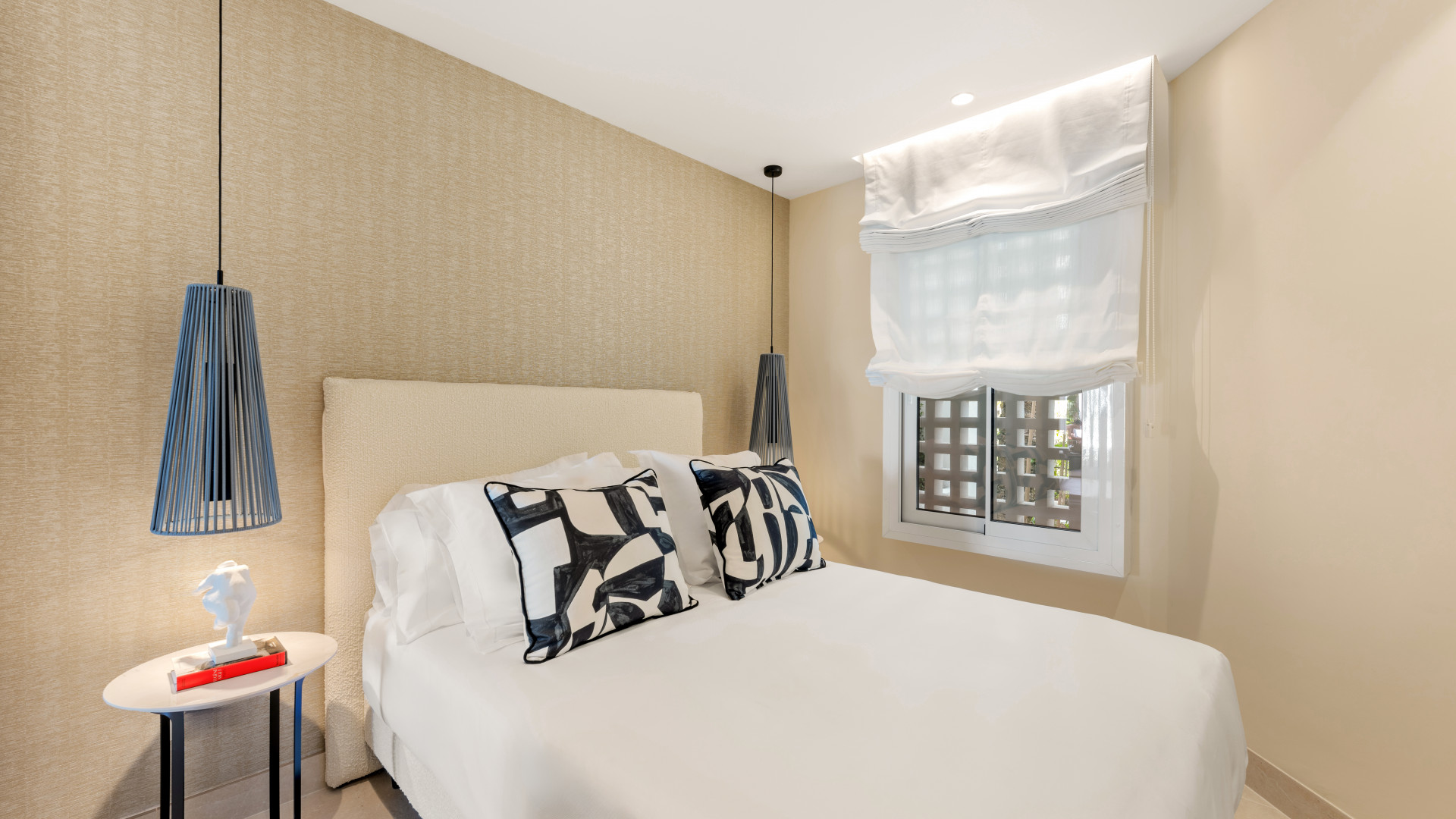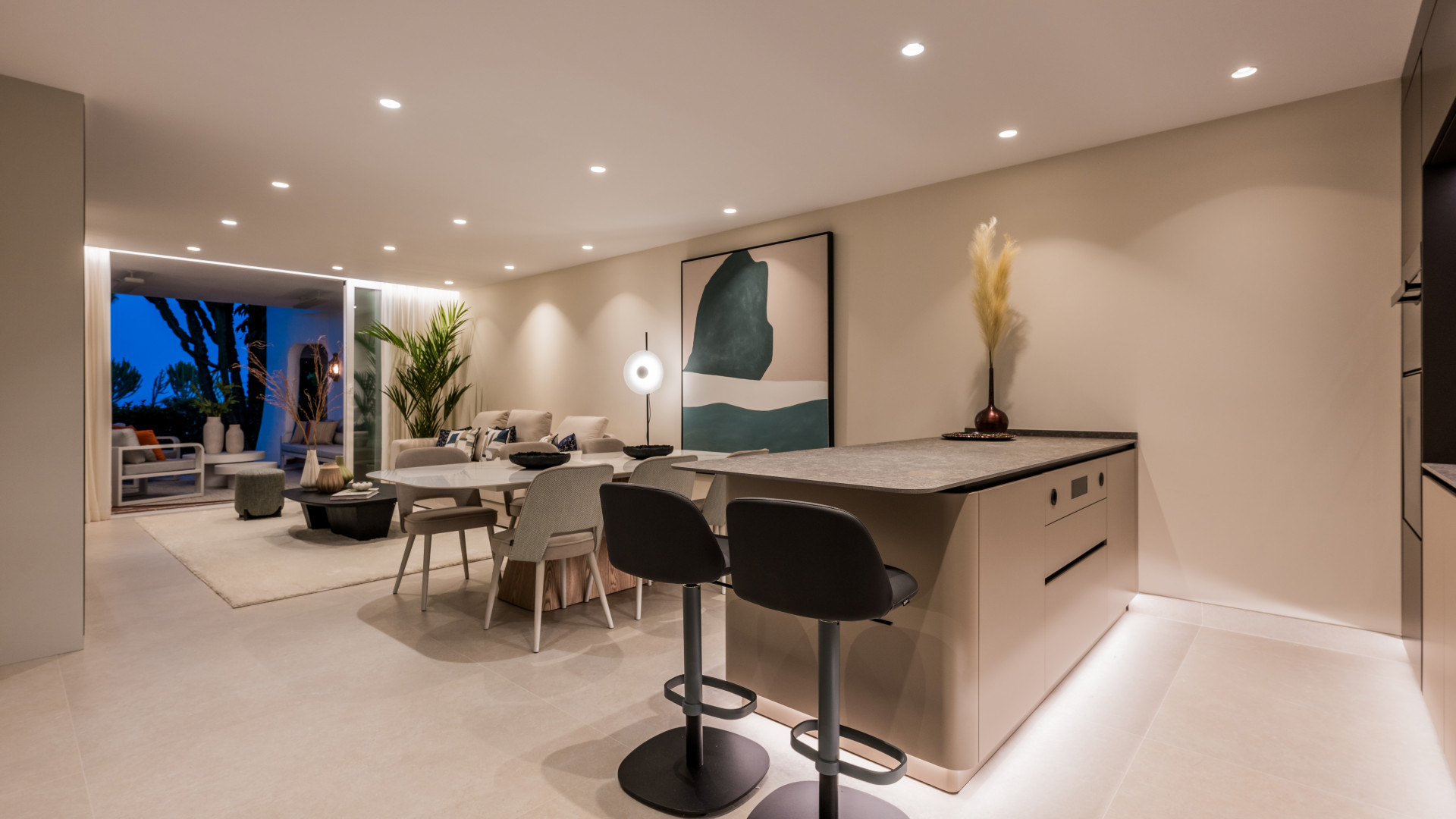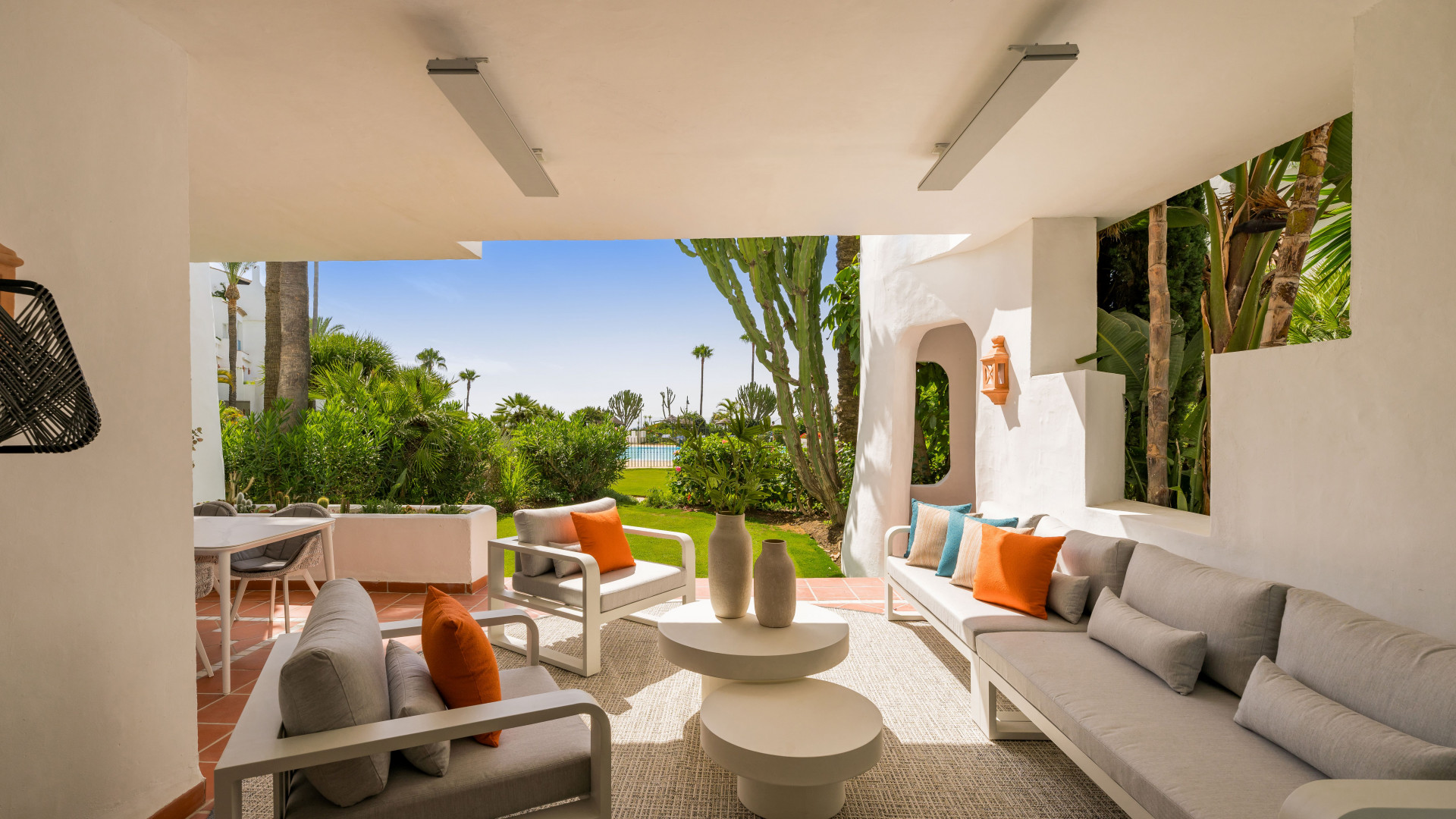 Fantastic south facing three bedroom ground floor apartment located in the gated and secure community of Costalita, Estepona. The apartment offers an open plan living area with high quality finishes and a brand new designer kitchen, fully equipped with Miele appliances. From the lounge area there is direct access to the covered and private terrace hosting spectacular sea views. There are three large bedrooms and two bathrooms. The stunning master bedroom features an open plan bathroom and a walk-in wardrobe with direct access to the main terrace. The property comes fully furnished and is key ready to move in. Costalita is an exclusive and secure beach side community with extensive tropical gardens, a lagoon style swimming pool and direct access to one of the nicest beaches on the New Golden Mile. The Villa Padierna Raquet Club, the 5-star Mett Hotel and several nice “Chiringuitos” are within walking distance and various supermarkets, bars and restaurants are just a short drive away. Other features include; tailormade wardrobes, elegant floors, an electric fireplace or a Bang & Olufsen sound system, one parking space and a storage room.
