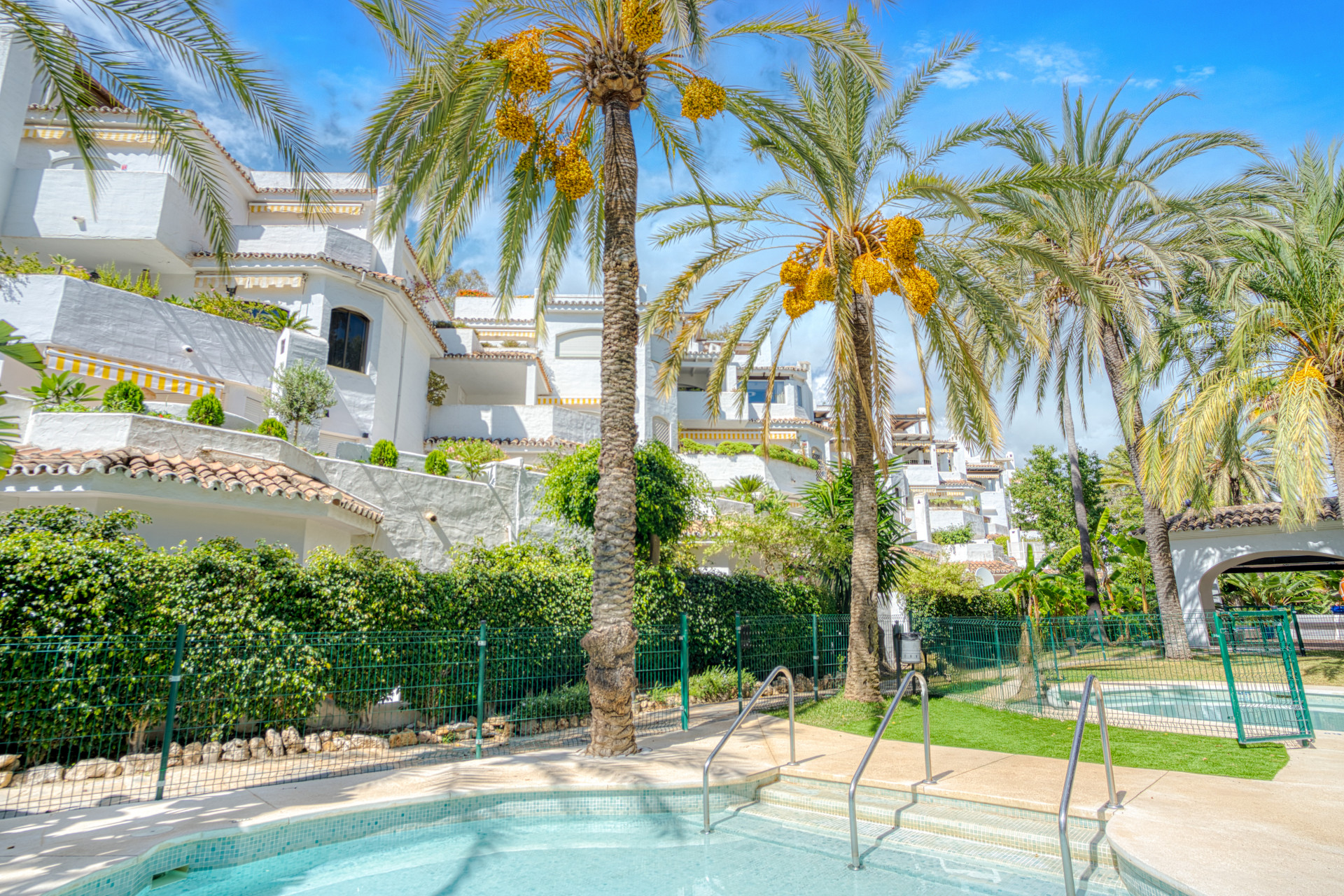 Charming apartment with garden views, located in the prestigious Golden Beach community, just a few minutes’ walk from the beach. This exclusive gated development offers 24-hour security, beautiful tropical gardens with lakes, and two magnificent communal pools, providing a peaceful and elegant environment just steps from shops, restaurants, and all amenities.The property features three bedrooms and two bathrooms. One of the rooms is currently used as an office but can easily be converted into a third bedroom, as it has an en-suite bathroom, adding great value and versatility to the home. The bright and spacious living-dining area offers direct access to a cozy private terrace, perfect for enjoying Marbella’s wonderful climate. The kitchen is fully equipped and includes a separate laundry room.Other features include marble floors, air conditioning, built-in wardrobes, a private parking space, and a storage room, providing maximum comfort and practicality.An excellent opportunity for those looking for a home in one of the most desirable areas of East Marbella, combining proximity to the sea with the convenience of a secure and well-maintained community. Ideal as a permanent residence or a perfect holiday retreat.