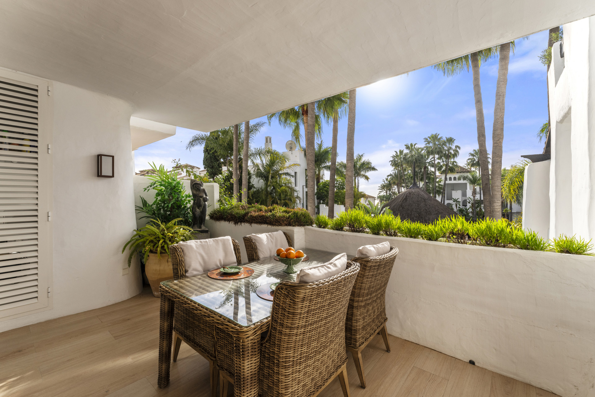 Beautiful apartment situated in the heart of Marbella’s prestigious Puente Romano Resort, this exquisite apartment exudes refined elegance, contemporary charm, and effortless Mediterranean living. Designed with an open-plan layout, it seamlessly connects spacious indoor and outdoor areas, offering the perfect blend of style and comfort. The living space is beautifully curated, combining classic and modern elements with plush seating, artistic décor, and a sophisticated ambiance. Expansive sliding glass doors open onto generous terraces, featuring multiple seating and dining areas surrounded by lush tropical gardens and overlooking the resort’s stunning swimming pool. The sleek, open-plan kitchen is a chef’s delight, boasting high-end appliances, stylish cabinetry, and a convenient breakfast bar. Adjacent to it, the elegant dining area provides an intimate yet stylish setting for entertaining. The master suite is a peaceful retreat, complete with a custom-upholstered headboard, large windows that flood the space with natural light, and a luxurious ensuite bathroom featuring a walk-in shower, double vanity, and marble finishes. The guest bedrooms are equally well-appointed, each offering its own unique design and ensuite bathrooms with premium materials and modern fixtures. A versatile secondary room adds extra flexibility, ideal as a guest bedroom, home office, or relaxation space. Every detail, from the warm wood flooring to the soft furnishings, has been carefully selected to create an atmosphere of sophistication and tranquility.