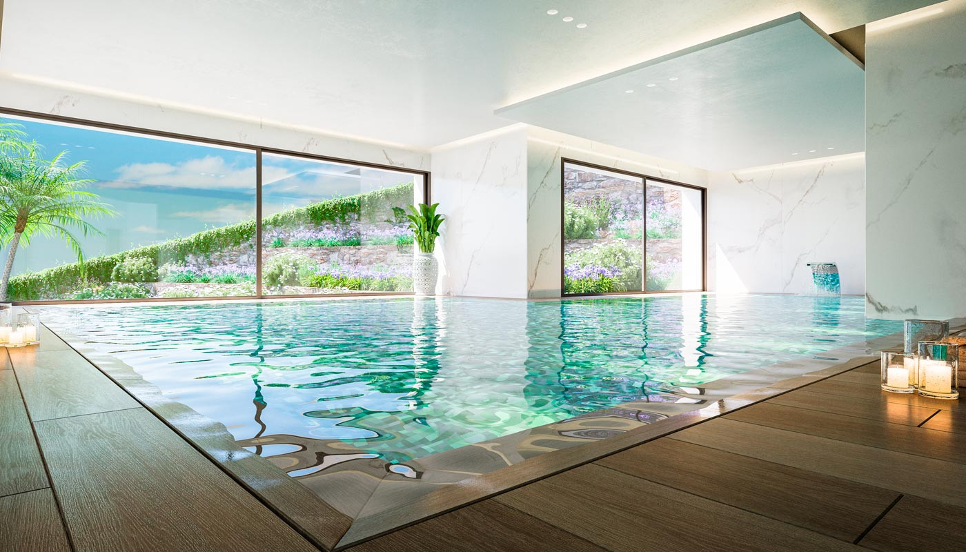 Communal amenities include a large swimming pool centrally located within Oasis, shielded by the surrounding buildings and immersed in nature, creating the effect of a serene, private lake. Additional facilities include a gym, spa, and multi-use room.