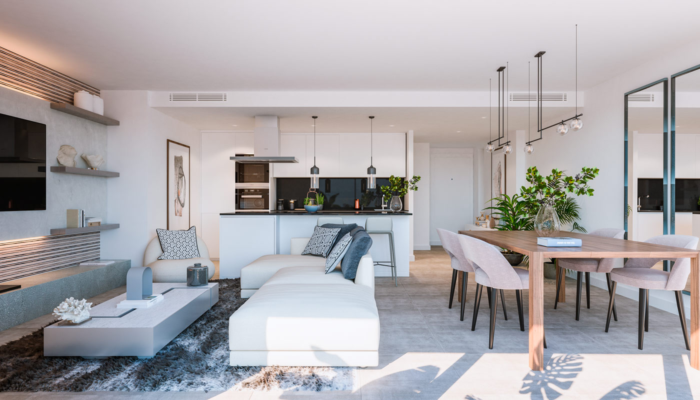Among these, discover our exquisite 3 bedroom, 2 bathroom apartment on the 2nd floor. This home features an open-plan layout that integrates the kitchen, living, and dining areas, extending outwards to a spacious terrace enclosed by a glass balustrade.