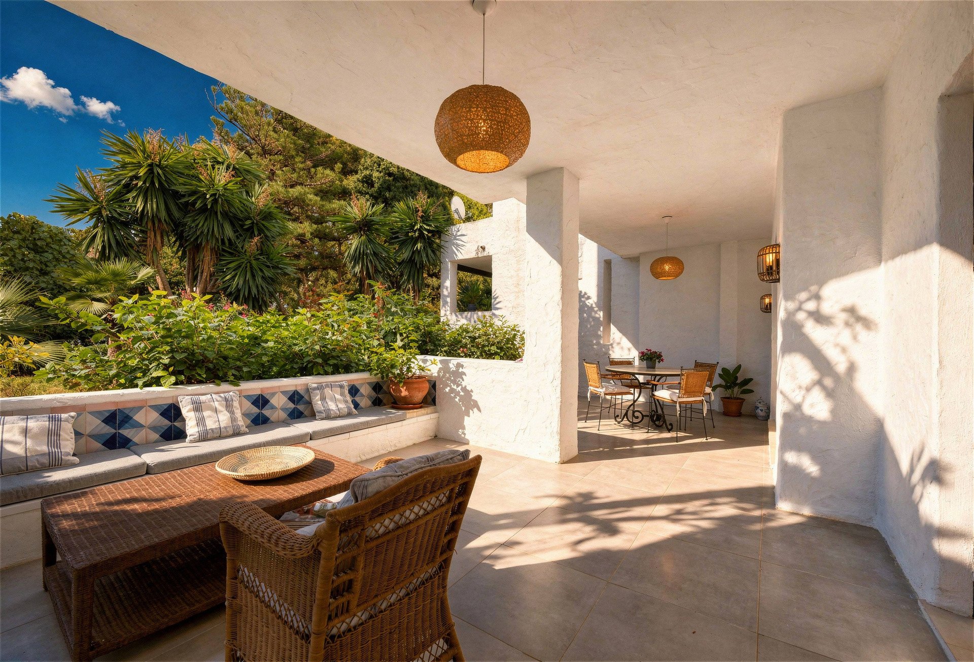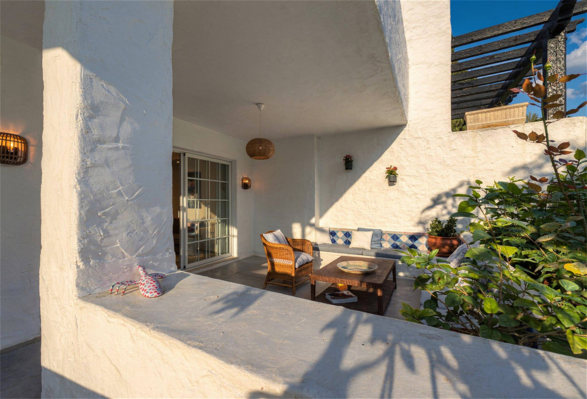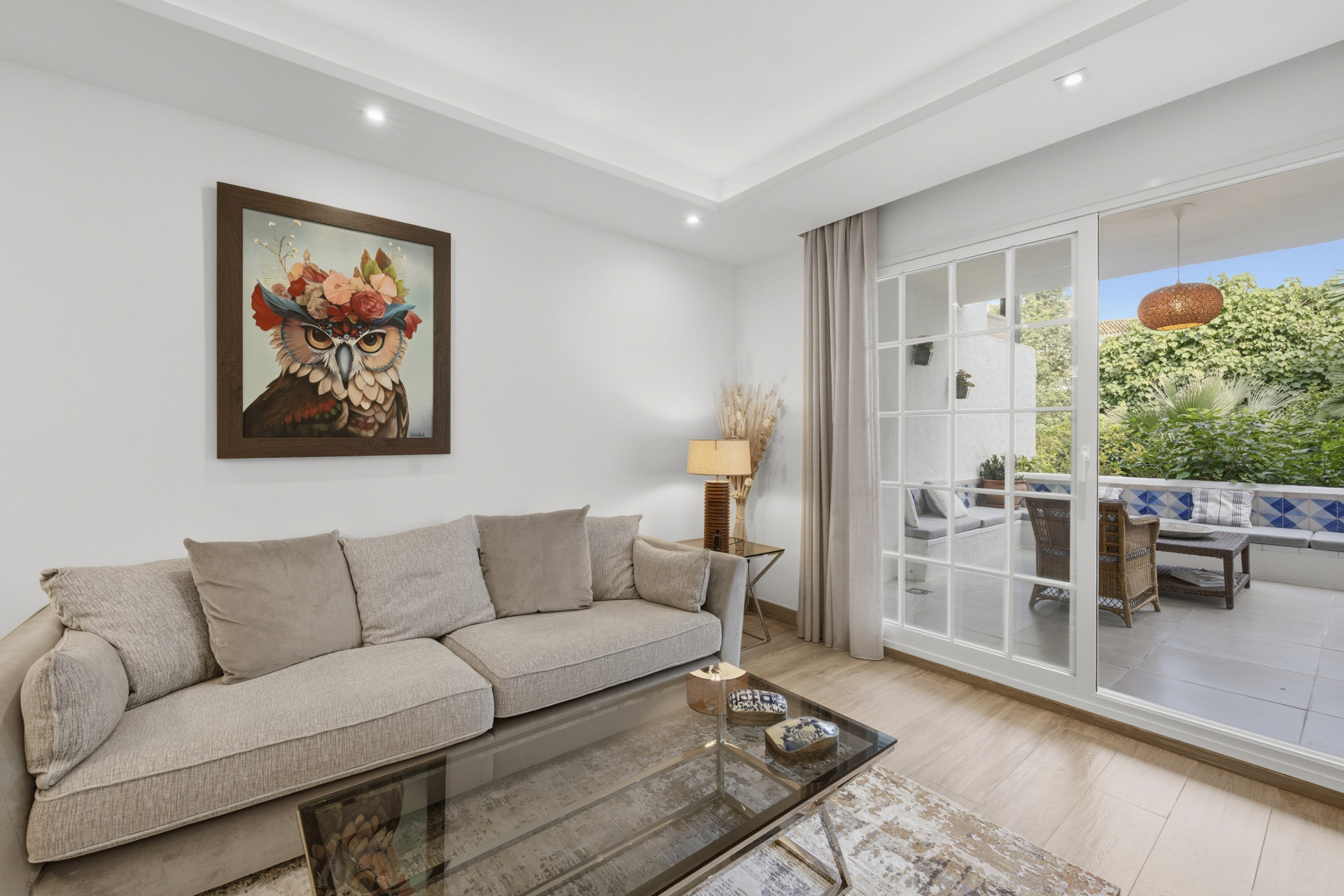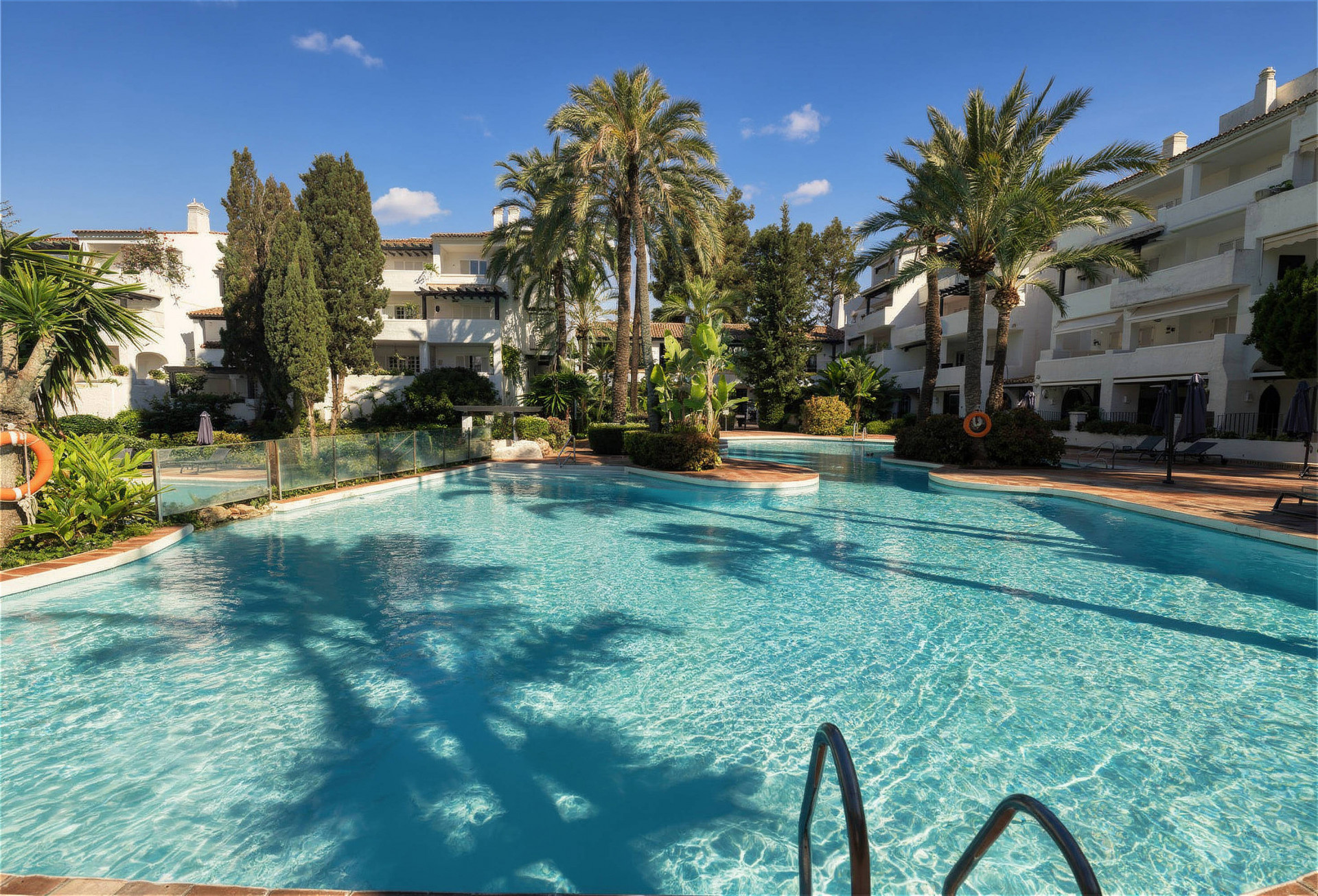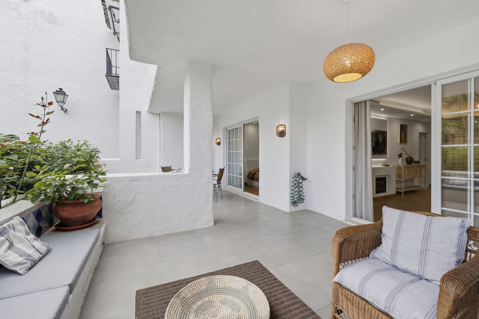 This sophisticated two-bedroom, two-bathroom ground-floor apartment in the prestigious Puente Romano Resort perfectly blends timeless elegance with contemporary comfort. Just moments from the beach, the open-plan living and kitchen area features a charming fireplace and flows seamlessly onto a spacious east-facing terrace with lounge and dining areas, ideal for tranquil mornings or relaxed evenings surrounded by lush greenery. The master bedroom is generously proportioned with refined finishes, while the second bedroom enjoys natural light and privacy; both bathrooms showcase high-quality materials and modern, understated design. Residents benefit from unparalleled access to world-class amenities, including the renowned Nobu Restaurant and Hotel, Sea Grill, Puente Romano Beach Club, boutique shops, stylish bars, and curated fine dining, with the resort’s botanical gardens and beachfront promenade connecting directly to Marbella Club and Puerto Banús. A private parking space completes this exceptional property, making it a rare opportunity to embrace Marbella’s most prestigious lifestyle with refined interiors, exclusive surroundings, and a privileged seaside location.