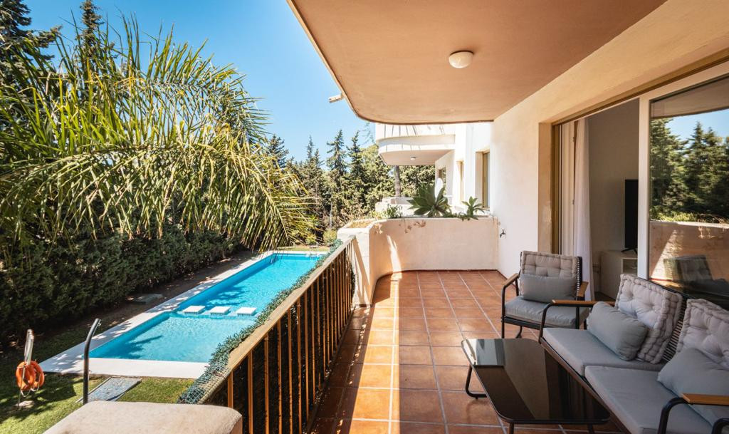 Beautifully positioned on the first floor with a desirable south-facing orientation, this stylishly renovated apartment offers an exceptional lifestyle just steps from the Casino and a short stroll to the vibrant heart of Puerto Banús, including its renowned restaurants, bars, designer boutiques, and sandy beaches. The interior is bright and modern, featuring an open-plan living and dining area seamlessly connected to a fully fitted contemporary kitchen—ideal for both everyday living and entertaining. There are two comfortable bedrooms that share a sleek, updated bathroom, while the living area opens directly onto a sunny private terrace, perfect for relaxing or enjoying the outdoors. The property also includes an underground garage space and a private storage room, while residents can enjoy beautifully maintained communal gardens and a large swimming pool. Whether as a holiday retreat or a year-round residence, this apartment combines style, convenience, and a top-tier location in one of Marbella’s most sought-after areas—an outstanding opportunity not to be missed.