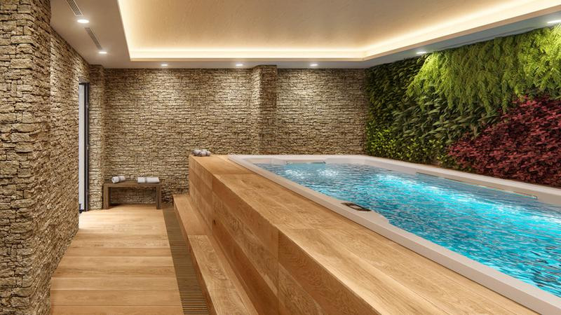 Communal area include a gymnasium and fitness area equipped with state-of-the-art machines for a complete body workout. Adjacent to this is a stunning indoor pool including a relaxation area with sculpted spa seats. There is also a large outdoor infinity pool, situated next to a stunning sun deck with loungers and a kitchen/BBQ area.