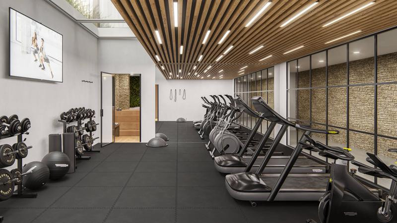 Communal area include a gymnasium and fitness area equipped with state-of-the-art machines for a complete body workout. Adjacent to this is a stunning indoor pool including a relaxation area with sculpted spa seats. There is also a large outdoor infinity pool, situated next to a stunning sun deck with loungers and a kitchen/BBQ area.