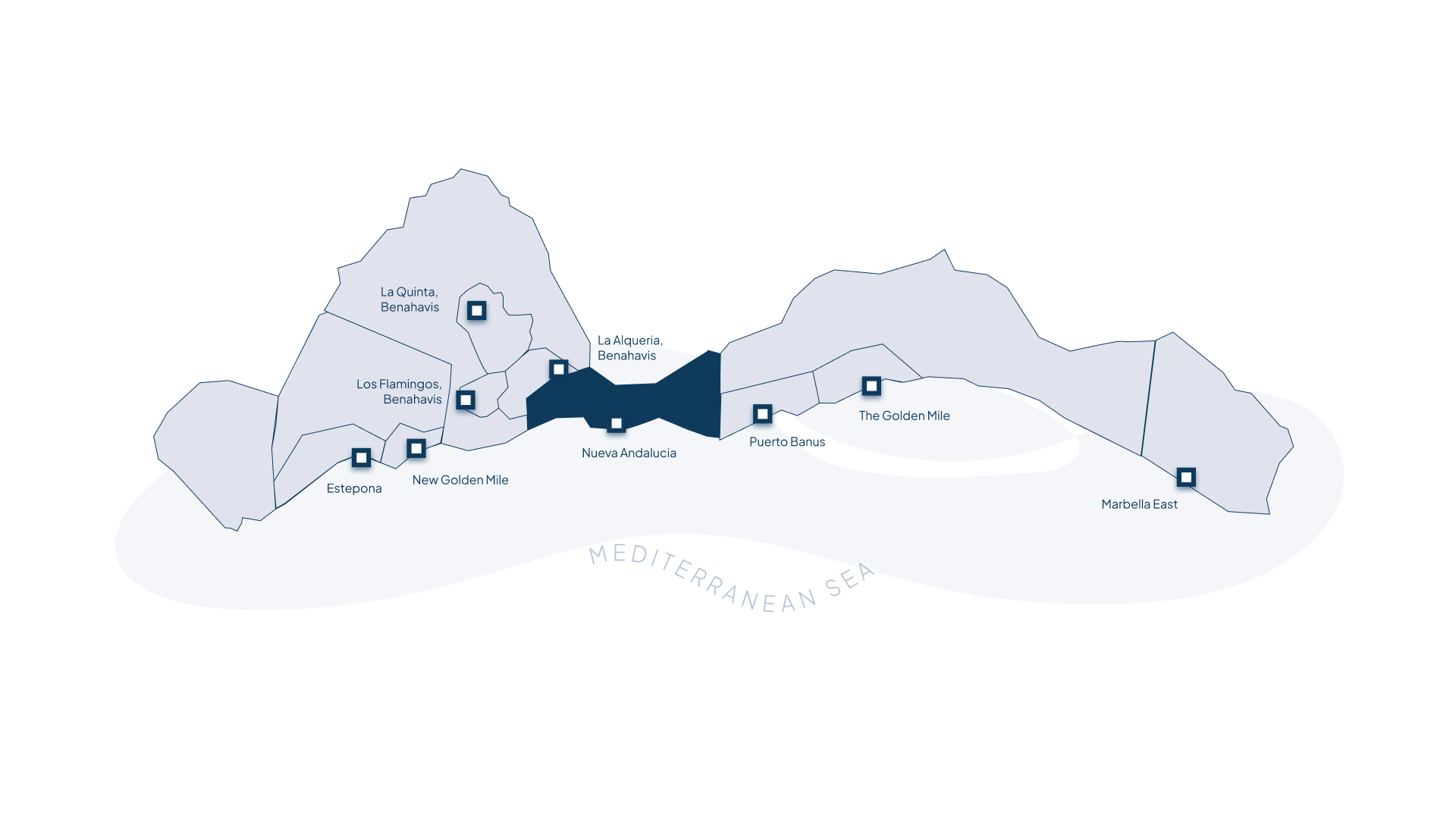 The Golden Mile, MarbellaLa Quinta, BenahavísLa Alquería, BenahavísLos Flamingos, BenahavísMarbella East, MarbellaNueva Andalucía, Marbella WestPuerto Banús, Marbella WestNew Golden Mile, EsteponaEstepona, Estepona