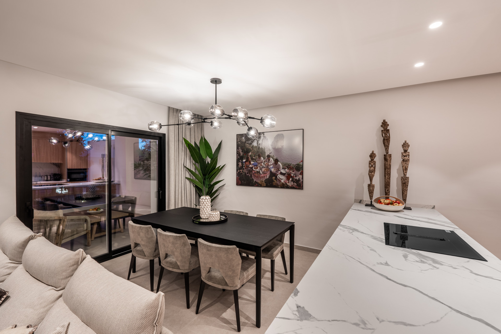 Discover a bright and spacious duplex penthouse in Marbella’s popular Aloha Gardens community, designed for easy, comfortable living. The home features an open-plan layout that unites the inviting living room, modern kitchen, and dining area, with large sliding doors that lead to a generous terrace—ideal for relaxing, dining outdoors, or enjoying a barbecue. On this level, a convenient guest toilet adds extra comfort. Upstairs, you'll find three well-proportioned bedrooms, including a master suite with its own bathroom and an open wardrobe area, while the other two bedrooms share a second bathroom. Additionally, a lower-level bedroom with its own bathroom serves as a private retreat for visitors. Residents benefit from excellent amenities such as three swimming pools and a gym, and the surrounding area offers top restaurants, boutique shops, tennis courts, and world-class golf clubs. An underground parking space also ensures your car remains safe and secure.