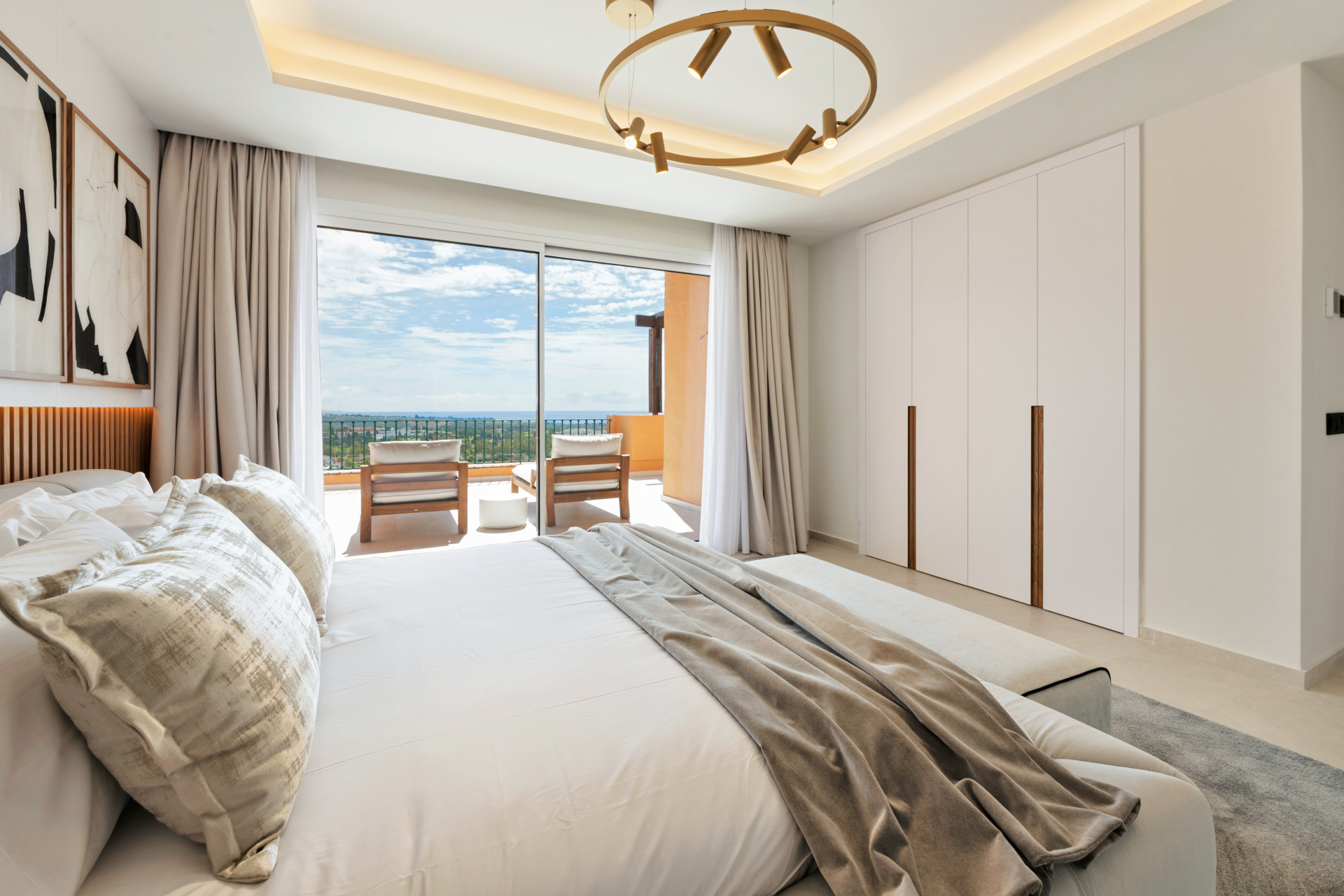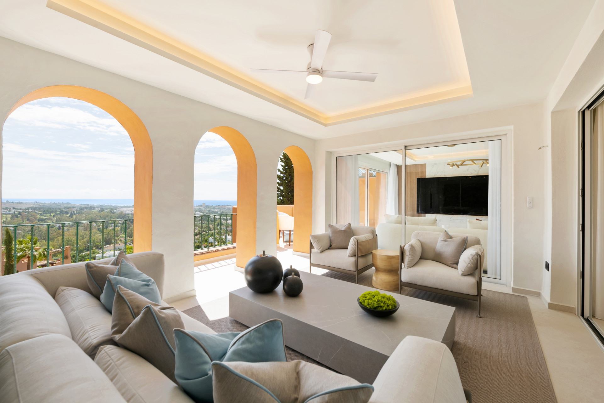 The penthouse features three spacious bedrooms and four beautifully appointed bathrooms, ensuring ample accommodation for family and guests. Each room captures awe-inspiring vistas that stretch from the verdant golf valley to the glistening sea, providing a symphony of panoramic views artfully framed by the architectural design. This residence promises not only comfort but also breath-taking scenery, with views extending to the country, mountains, and nearby golf courses.