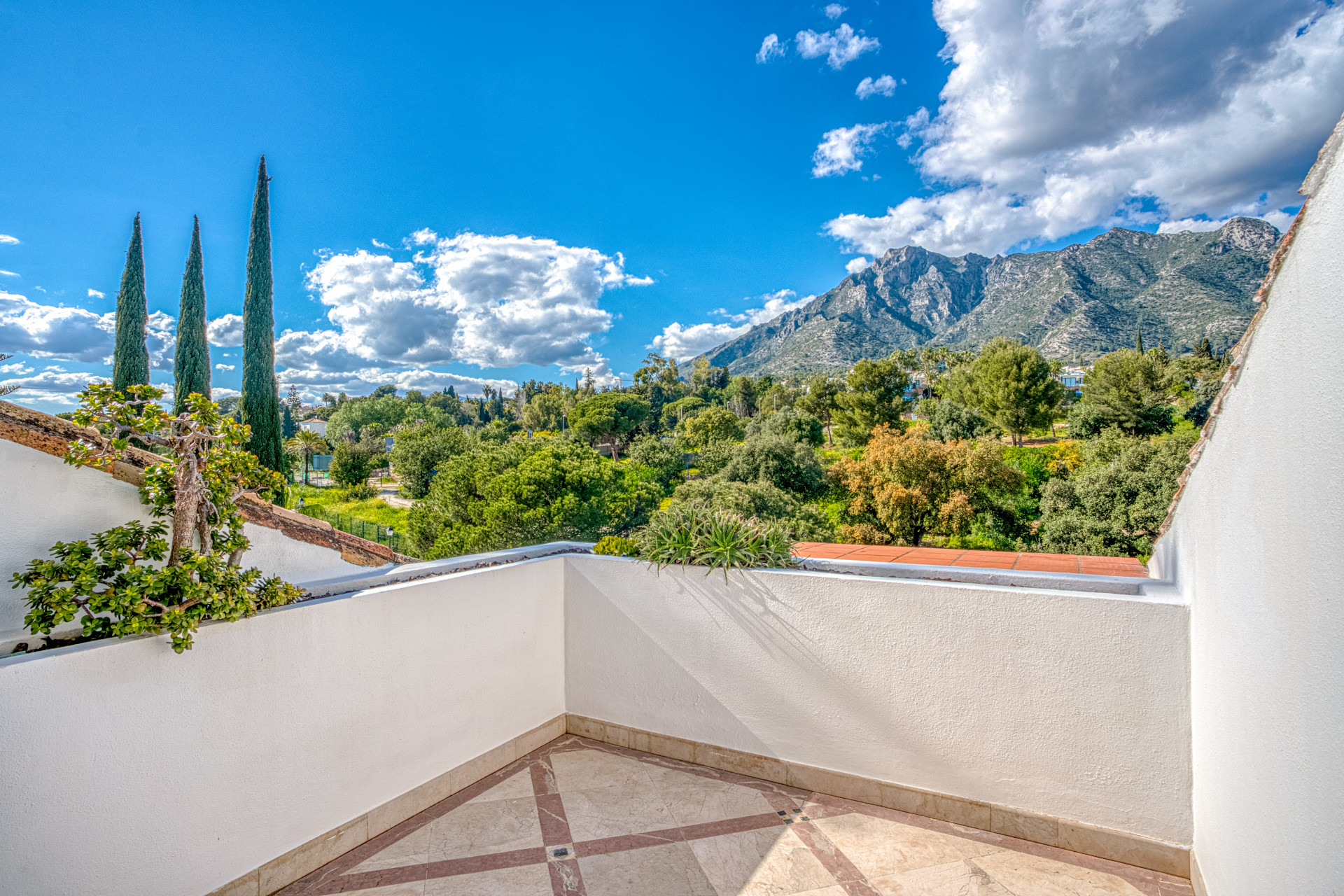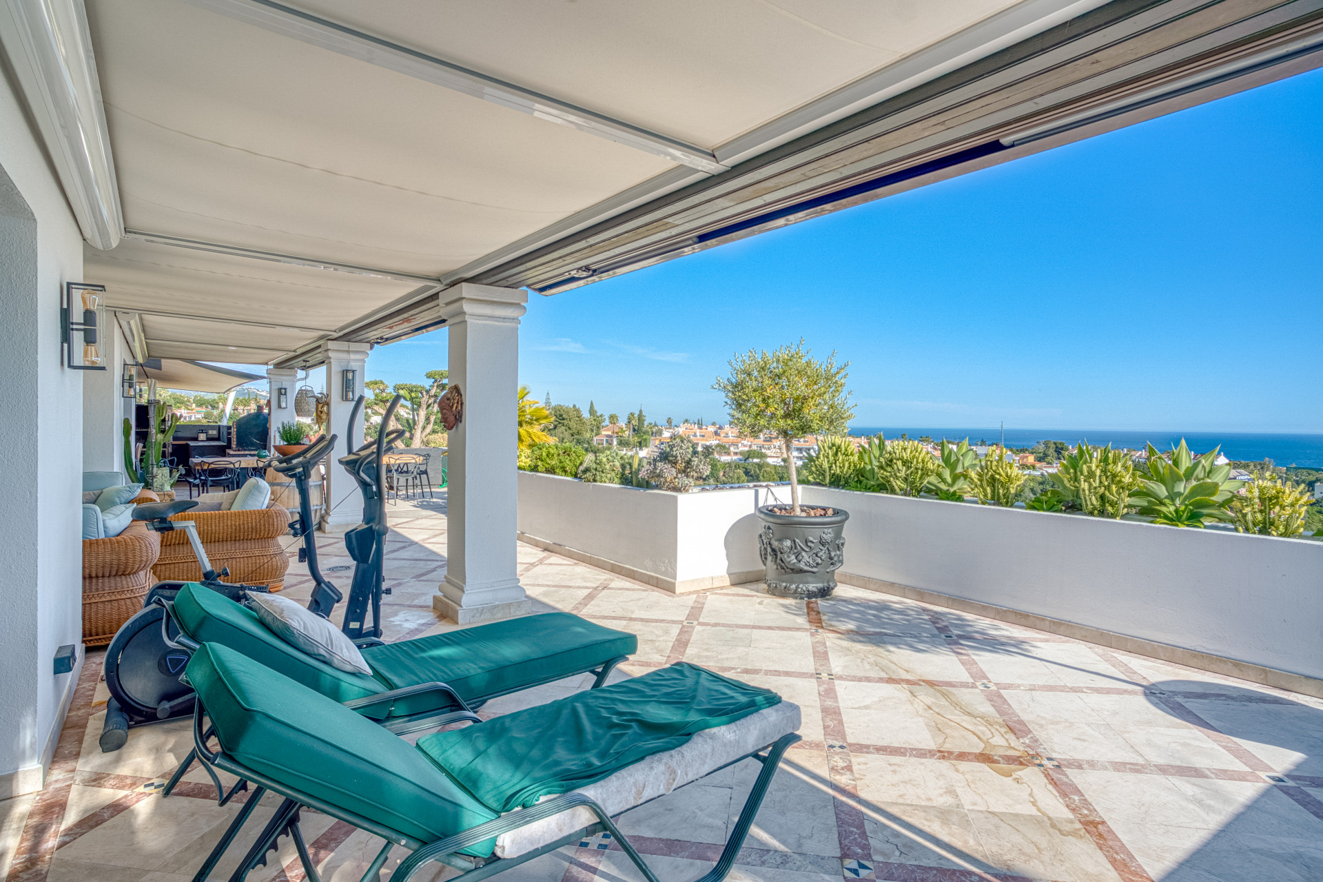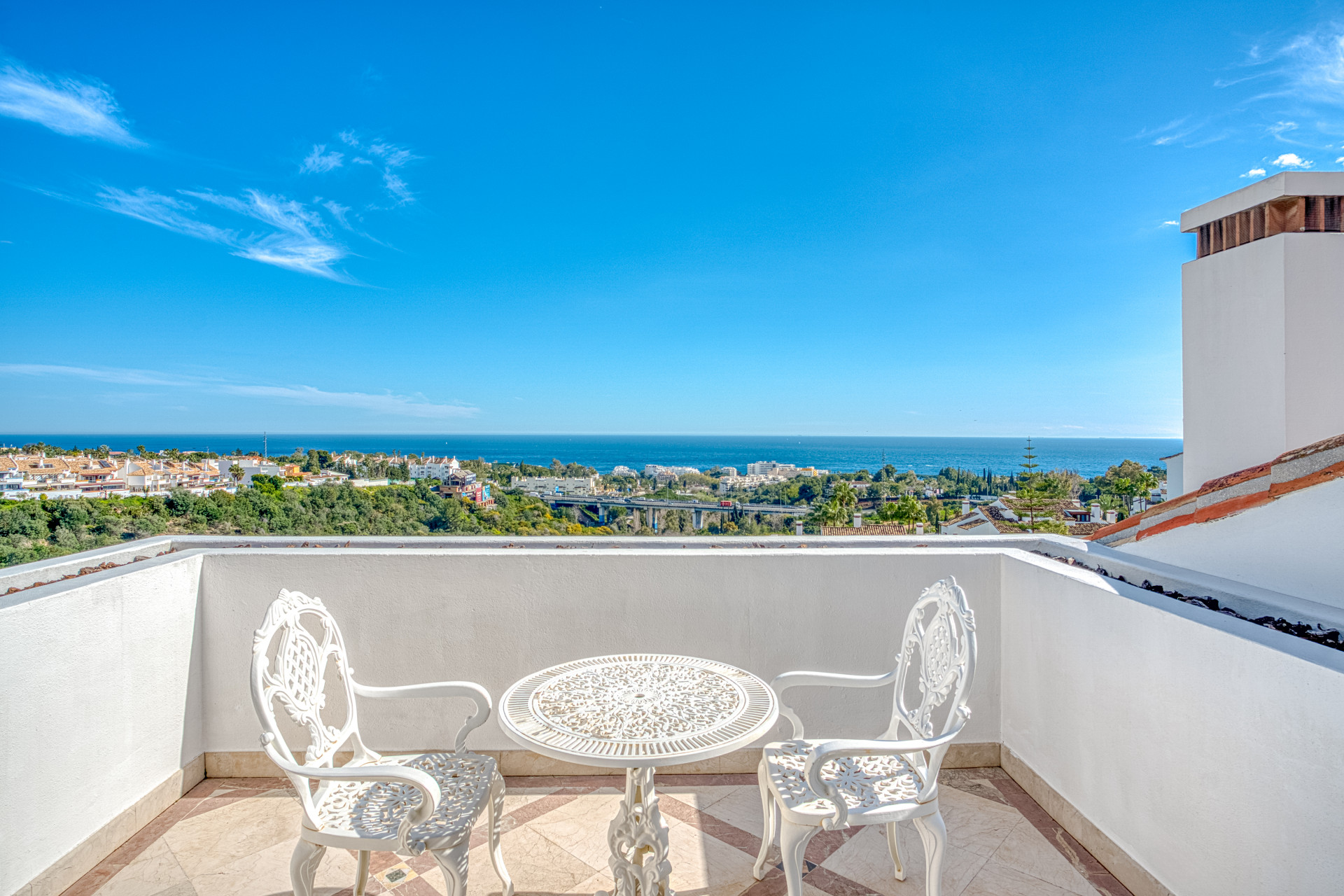 Spectacular four-bedroom, south facing duplex penthouse in the prestigious and gated community of Monte Paraiso Country Club, offering breathtaking sea and mountain views. This sought-after urbanization features 24-hour security, three outdoor swimming pools, an elevator, and beautifully maintained tropical gardens.The property is in excellent condition and boasts a spacious living and dining area with direct access to a large private terrace, perfect for enjoying the stunning views. The separate, fully equipped kitchen includes a utility area. All four bedrooms are en-suite, with the master suite featuring a walk-in closet with sea views and a luxurious bathroom. Additionally, there is a guest toilet.On the upper level, the penthouse offers three expansive terraces, ideal for outdoor entertaining, including a BBQ area. A private wine cellar adds a touch of exclusivity. Other features include underfloor heating, air conditioning, marble flooring, a storage room, and private parking for two large vehicles.This is a unique opportunity to own a luxurious penthouse in one of Marbella’s most exclusive communities, just minutes from the beach and the renowned Puente Romano Hotel.