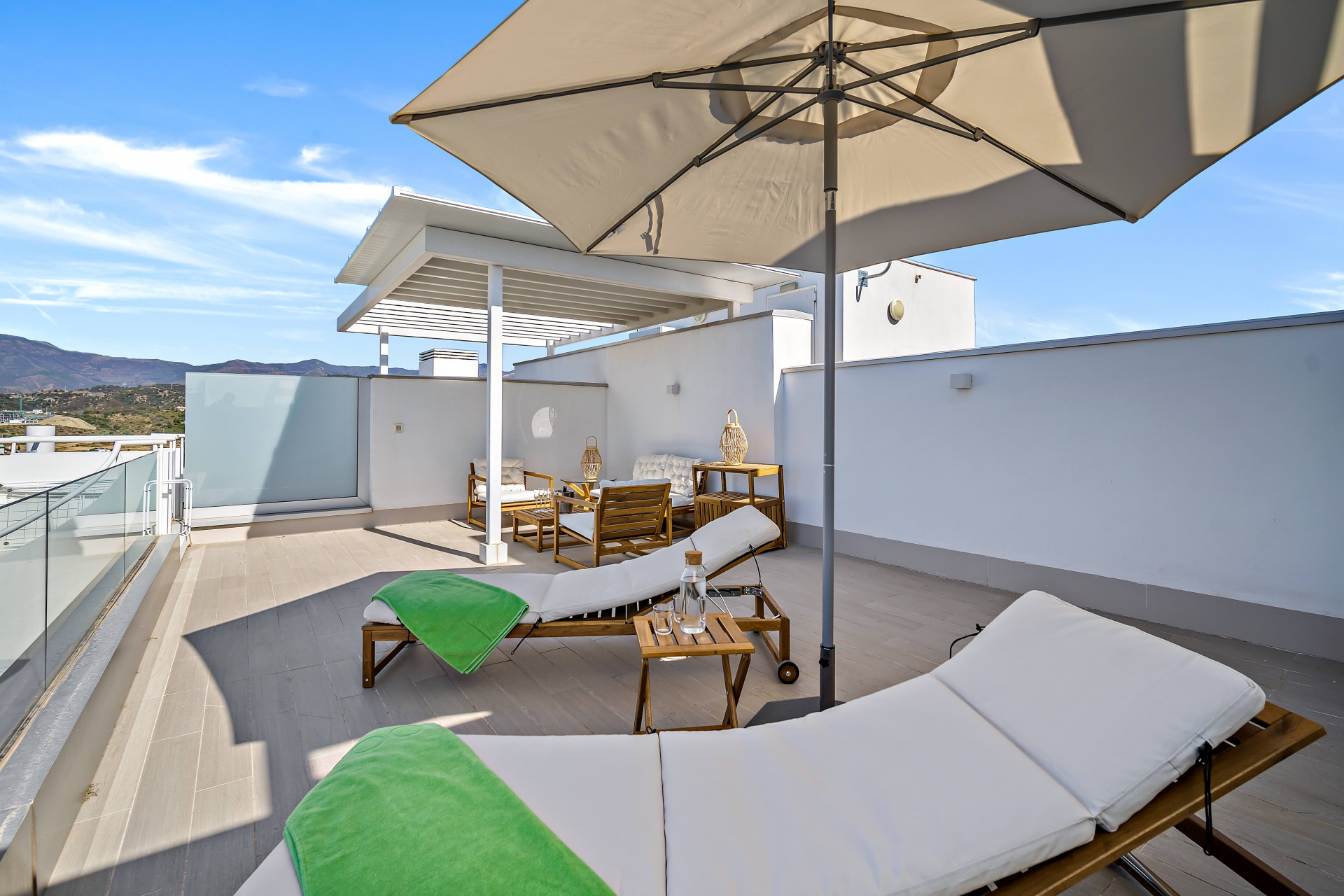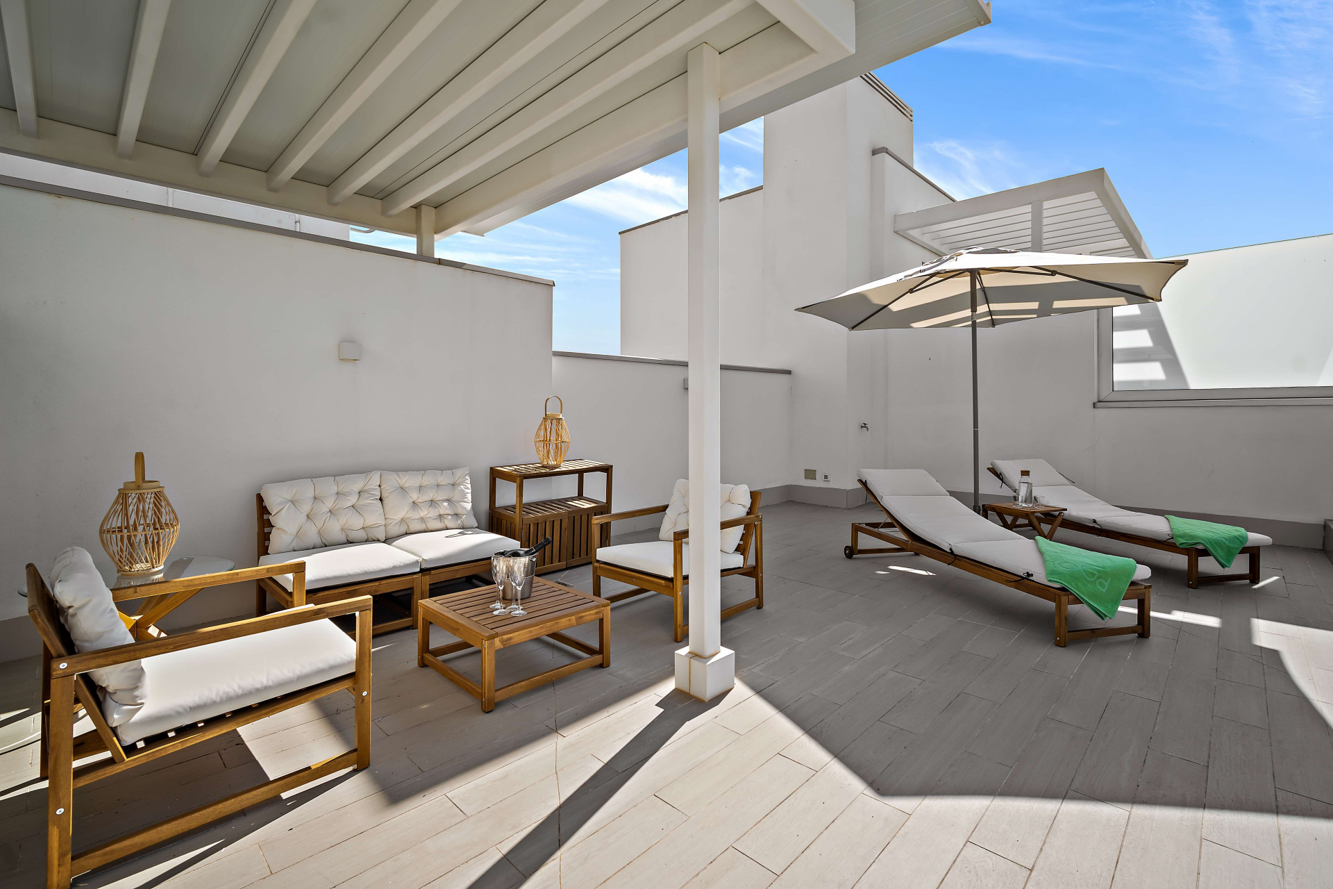 Al salir, los huéspedes encontrarán una barbacoa y un comedor para seis personas, y una escalera que conduce a la terraza/solarium en la azotea, que cuenta con cuatro tumbonas y una zona de sofás perfecta para tomar un café por la mañana. Todos los espacios exteriores cuentan con inmejorables vistas hacia el suroeste.