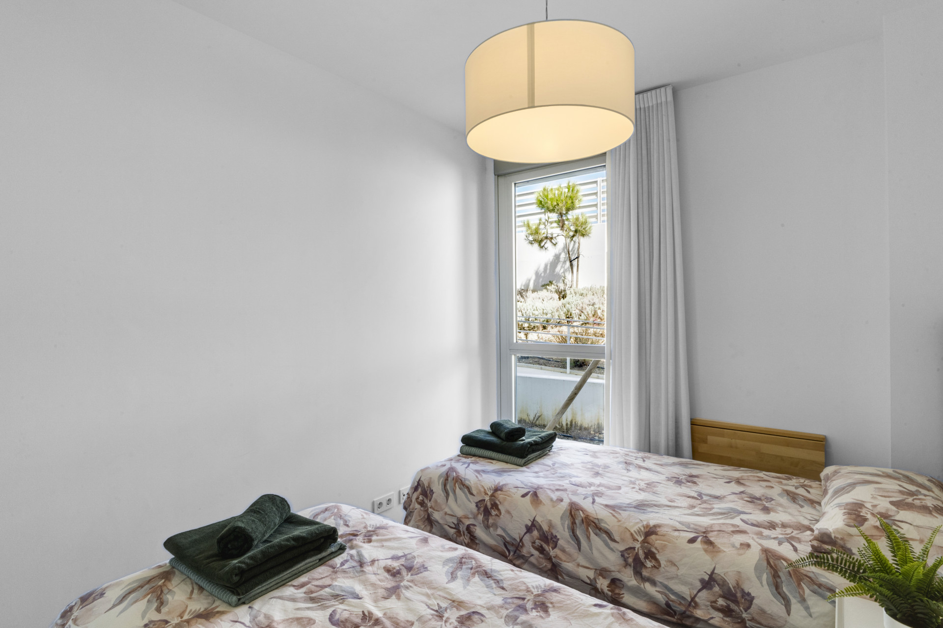 La terraza al aire libre ofrece asientos informales, así como espacio para comer para cuatro, donde puede relajarse y disfrutar de las espectaculares vistas al suroeste. A la derecha de la entrada, hay un dormitorio con dos camas individuales con espacio de almacenamiento incorporado y un baño cercano. La suite principal, accesible a través de la sala de estar, cuenta con una cama super king, un vestidor con armarios empotrados y un baño privado con ducha a ras de suelo.
