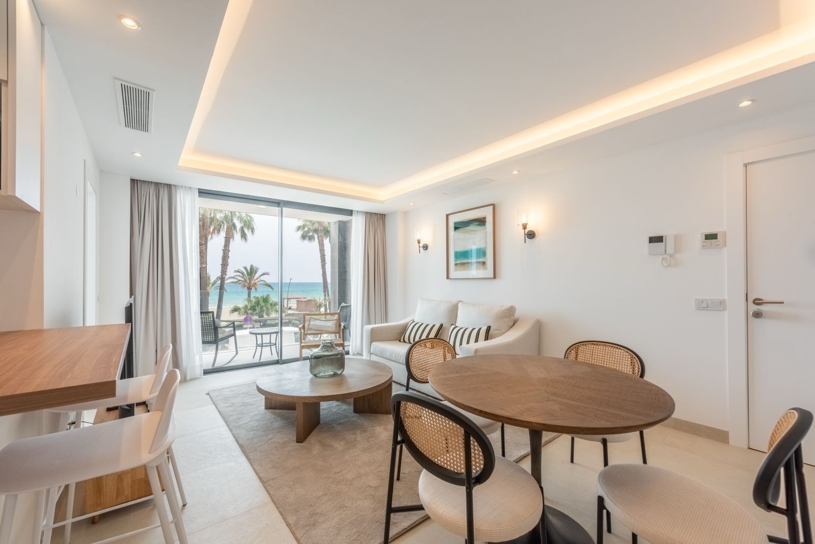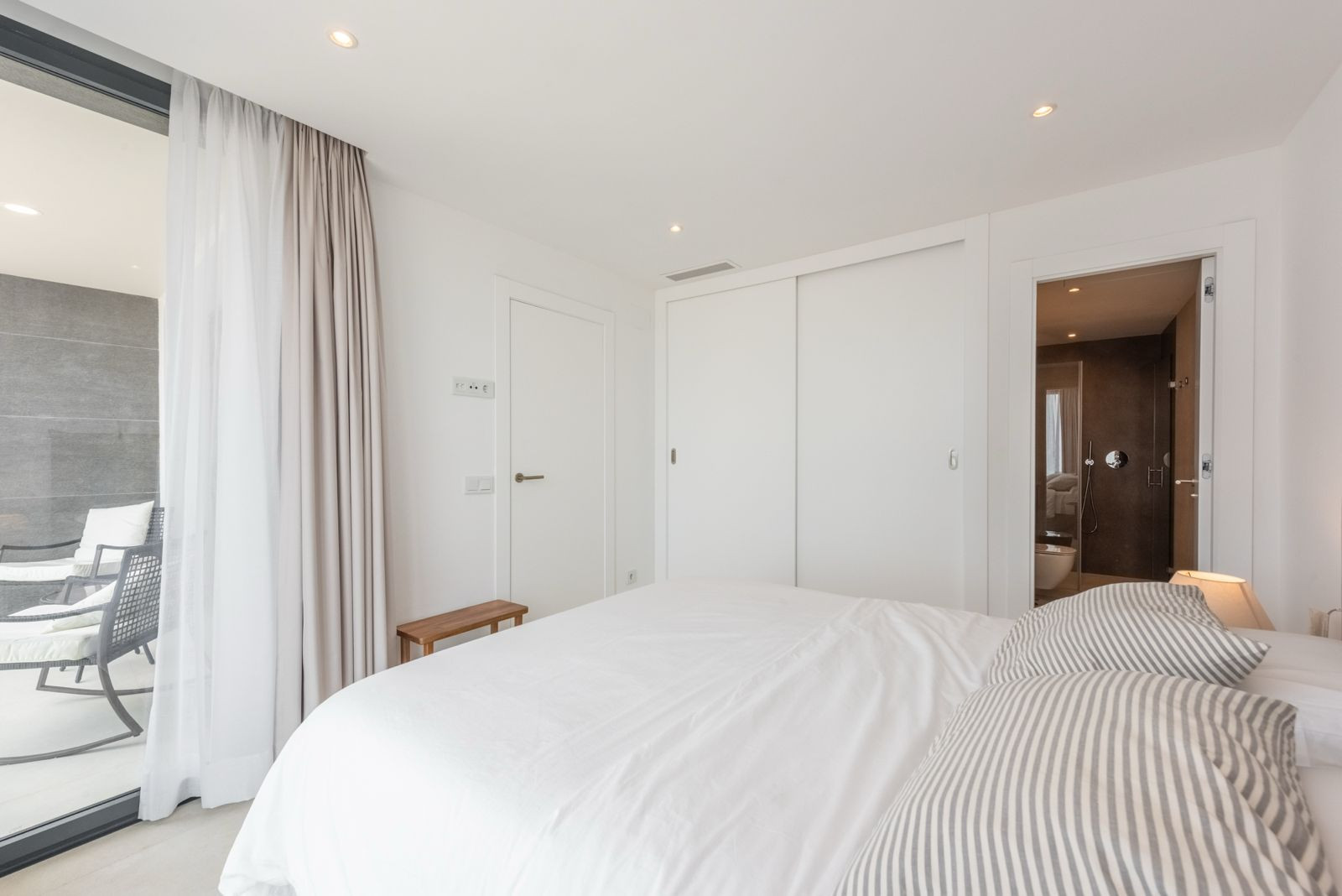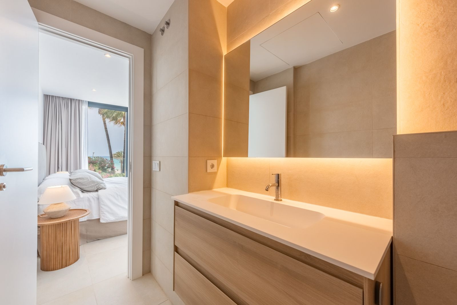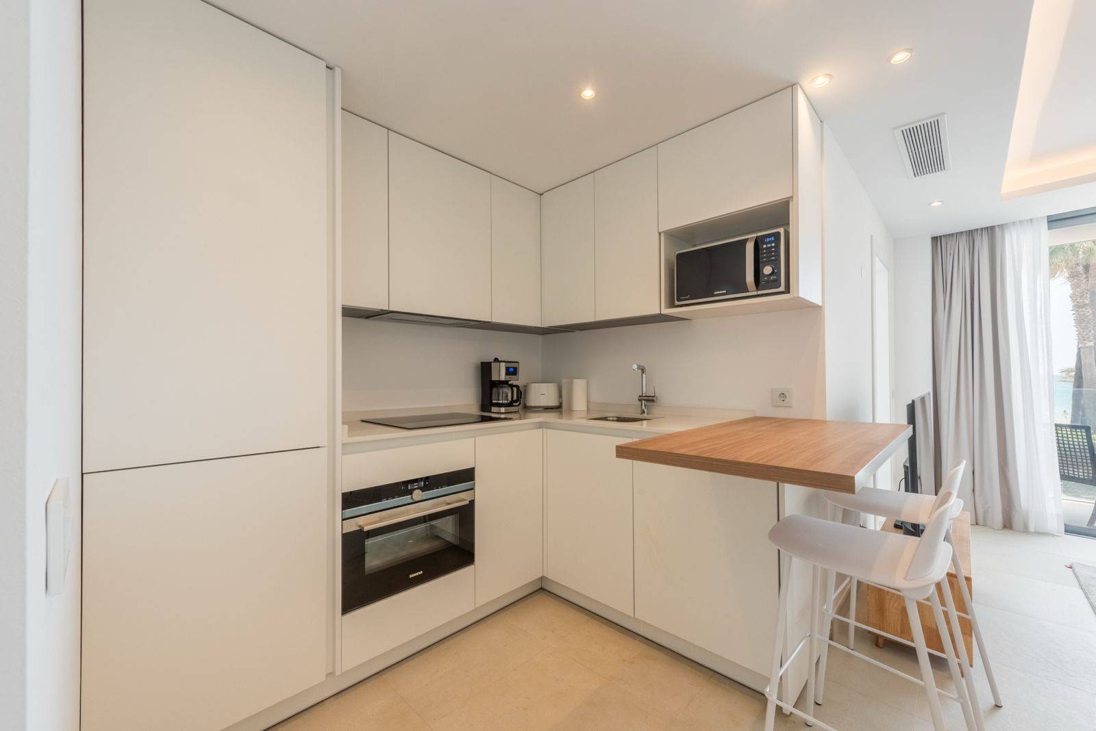El apartamento cuenta con un diseño contemporáneo de planta abierta que combina a la perfección la cocina totalmente equipada con una elegante barra americana, un elegante comedor y un amplio salón. Ambos dormitorios incluyen baño en suite, lo que garantiza comodidad y privacidad. El dormitorio principal y el salón dan a una terraza privada, donde las vistas abiertas al mar crean el entorno perfecto para relajarse o disfrutar del tiempo libre.