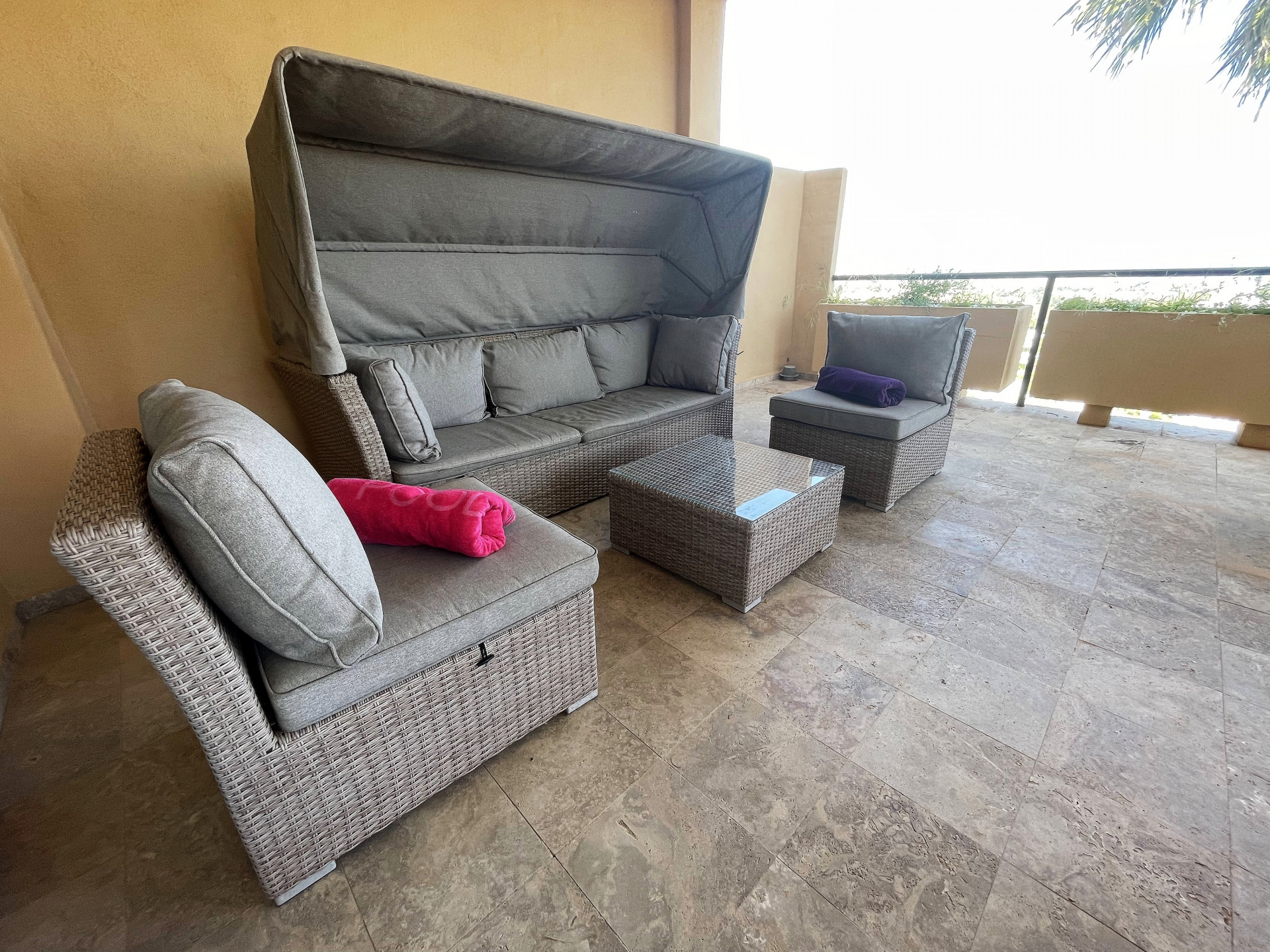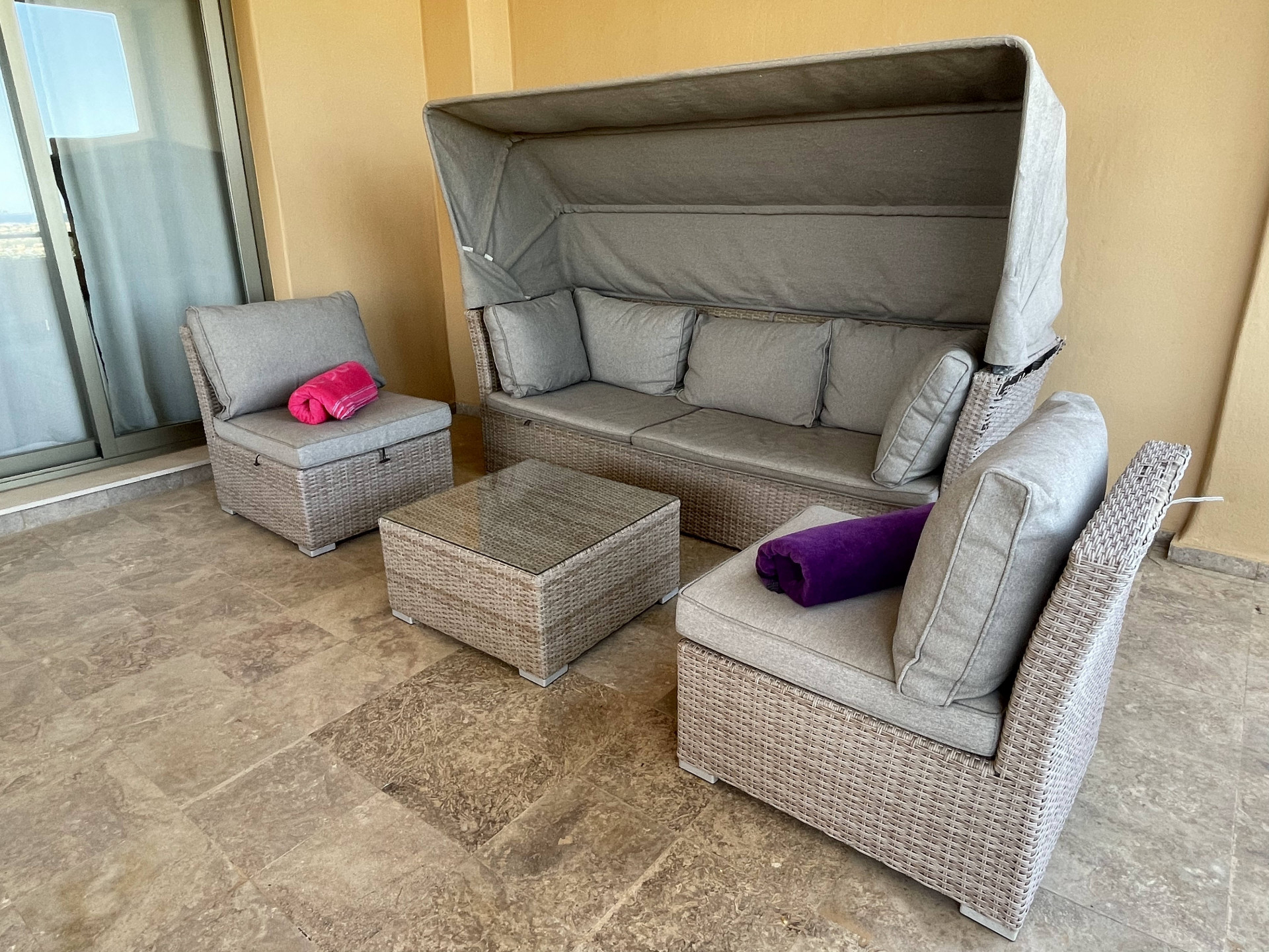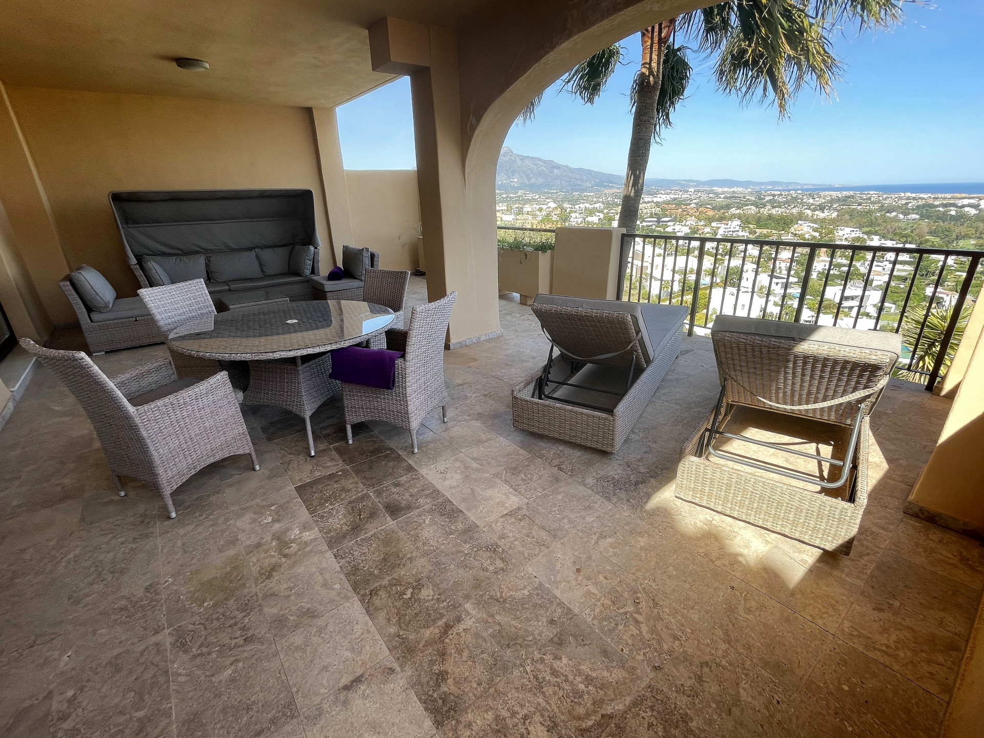 Desde la espectacular terraza, los huéspedes pueden cenar y entretenerse con impresionantes vistas de la bahía de Marbella, desde las montañas hasta el mar y más allá. Hay espacio para comer para cuatro personas, dos cómodas tumbonas y un sofá cubierto y sillas, que son perfectos para relajarse en las tranquilas noches de verano de España. También ofrecemos televisión por satélite con canales deportivos e internacionales (Idiomas: inglés, español, alemán, holandés, francés, ruso, sueco, noruego).