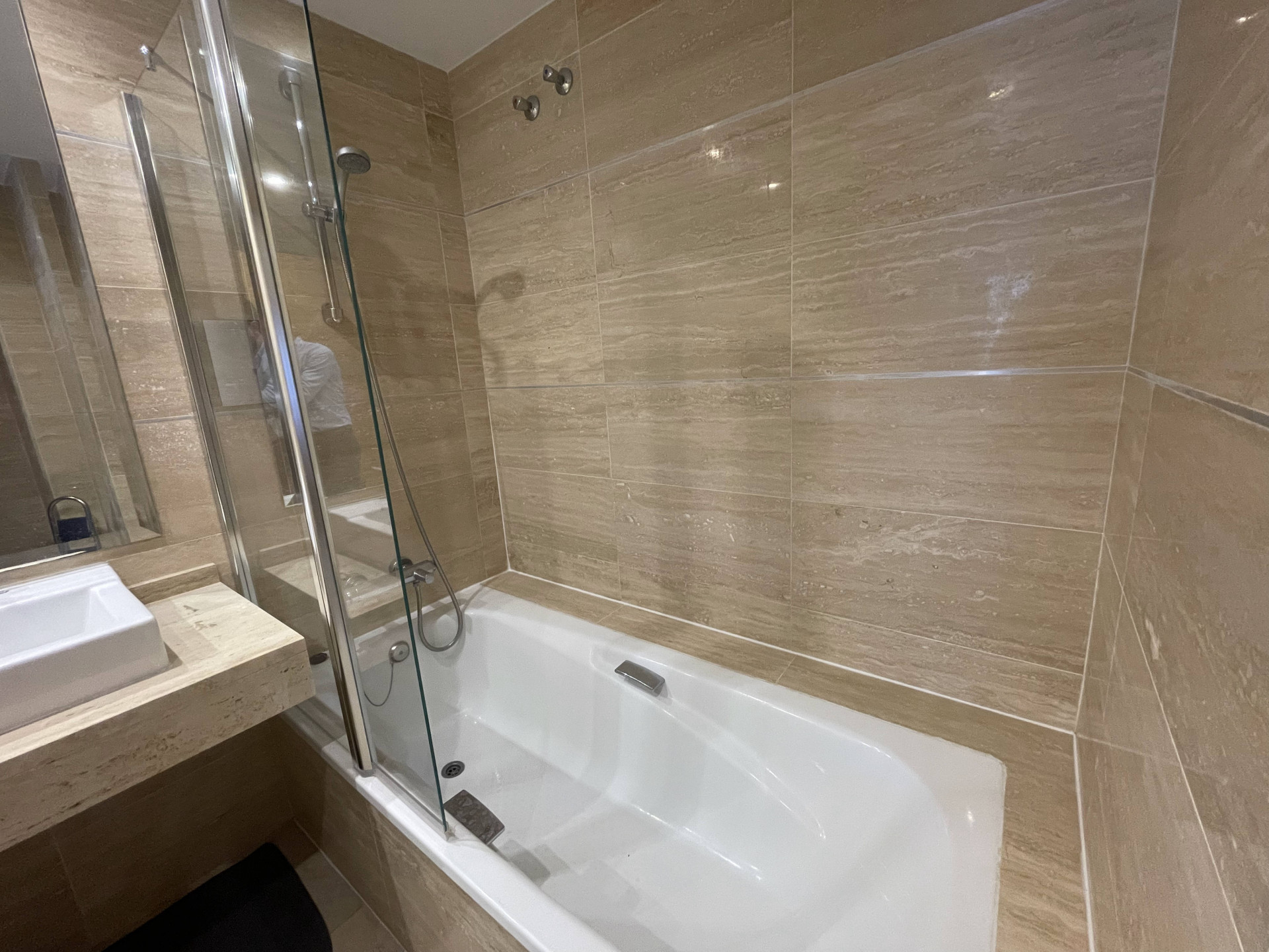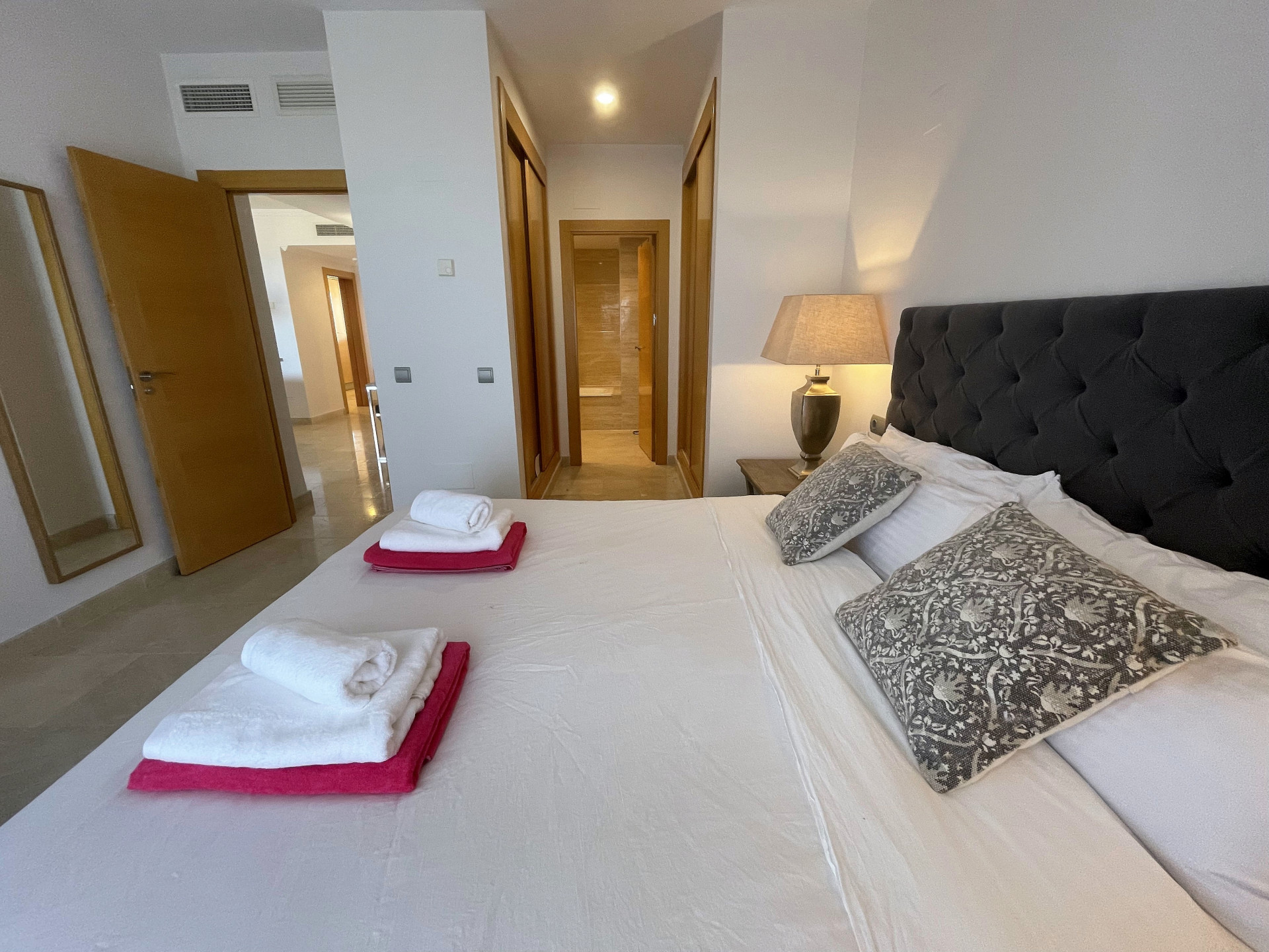 A la izquierda del hall de entrada hay un dormitorio doble con armarios empotrados y un amplio baño. A través de la zona de salón se accede al dormitorio principal con una cama super king, un vestidor con armarios empotrados y un baño con dos lavabos y bañera / ducha.