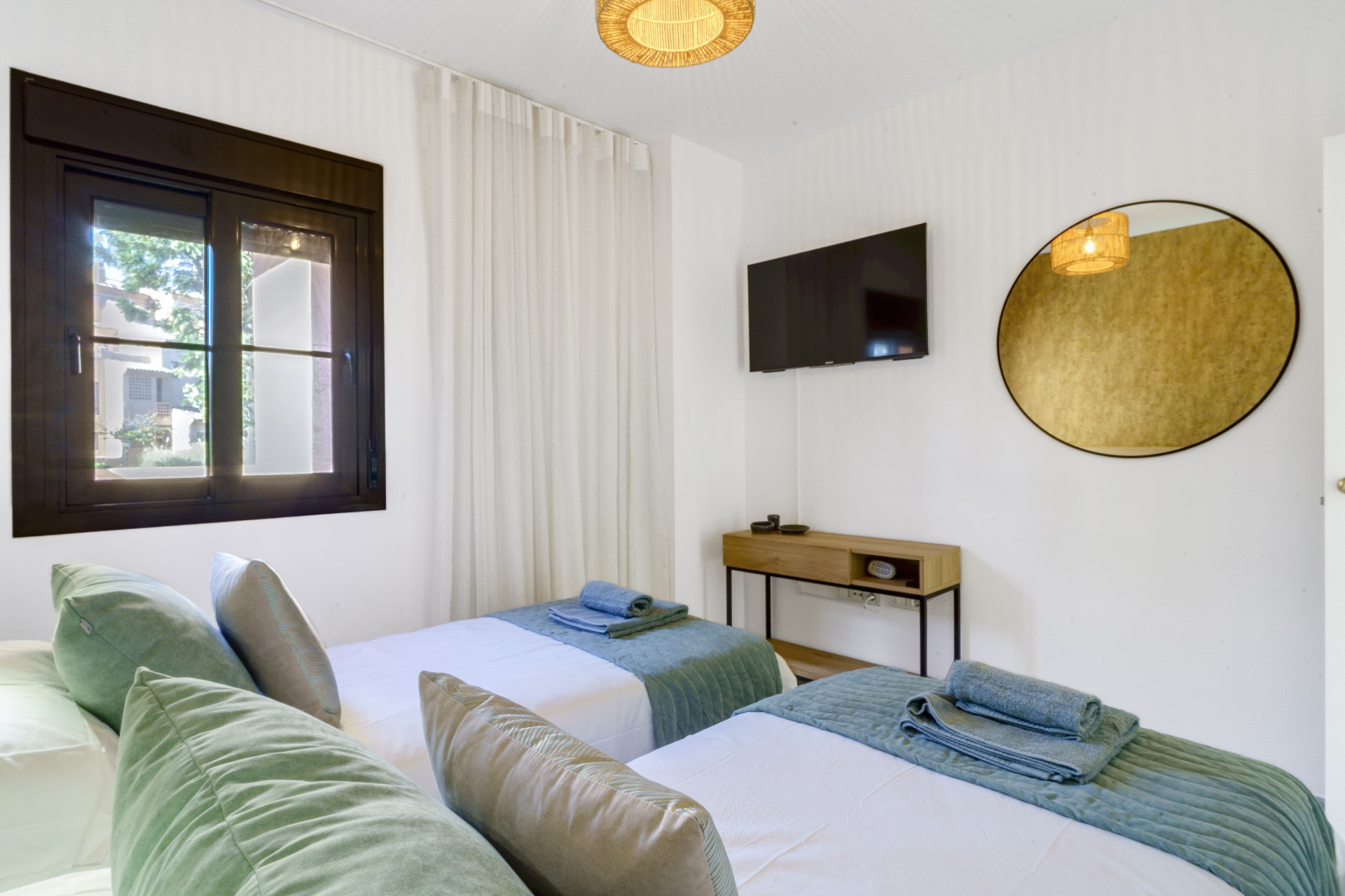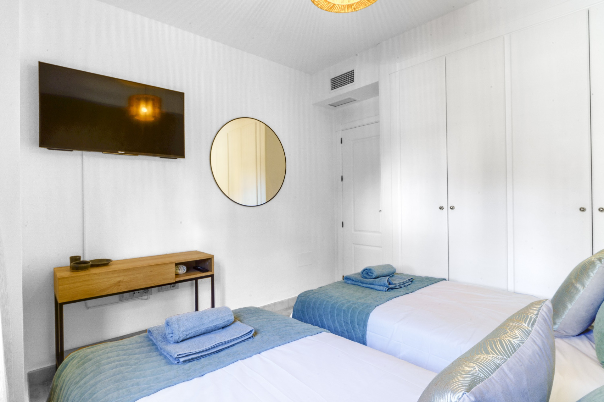 El apartamento cuenta con dos dormitorios, uno con una cama doble tamaño king y otro con dos camas individuales, y puede alojar cómodamente hasta cuatro huéspedes. La cocina bien equipada incluye todo lo esencial, incluido un exprimidor y una cafetera Nespresso.