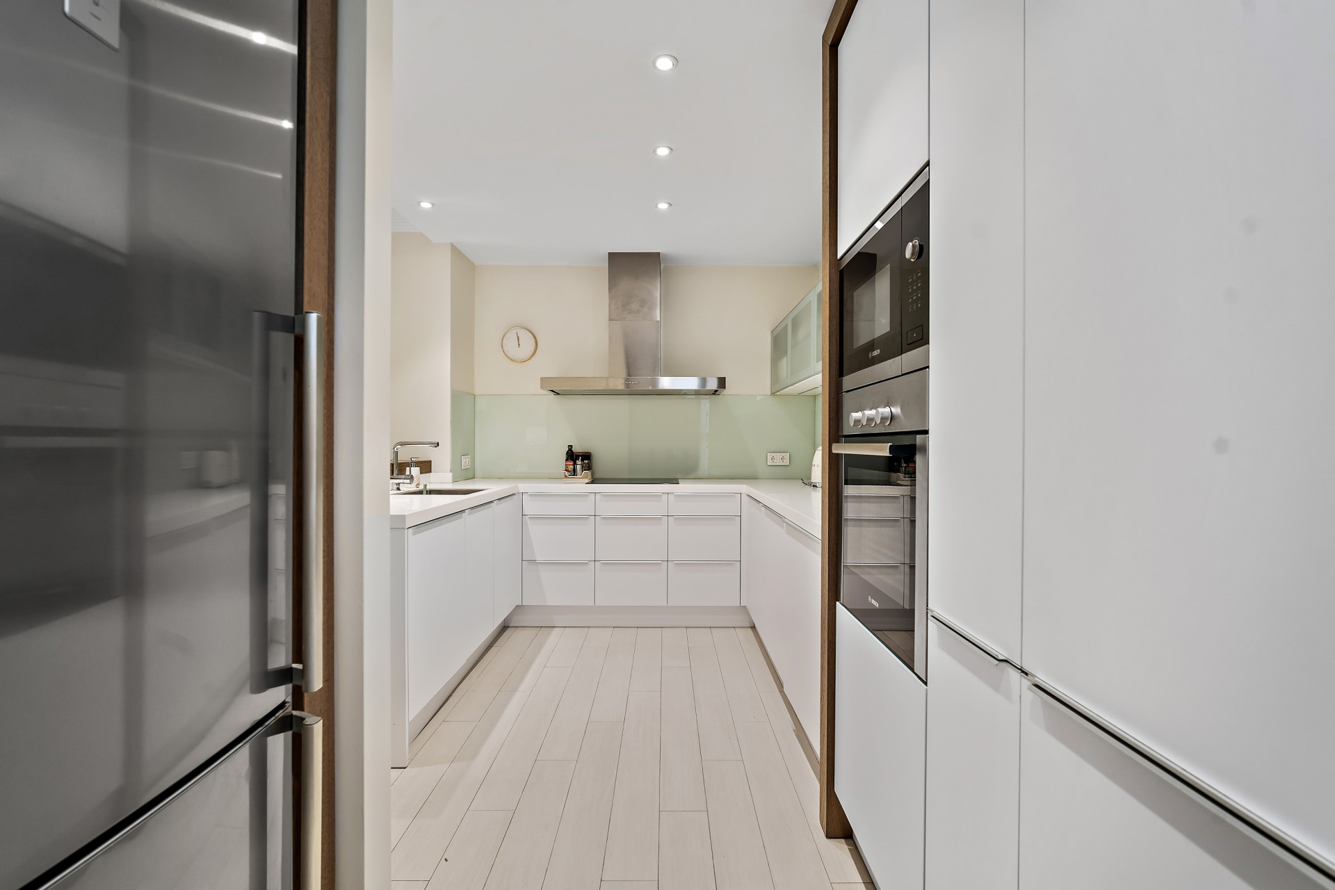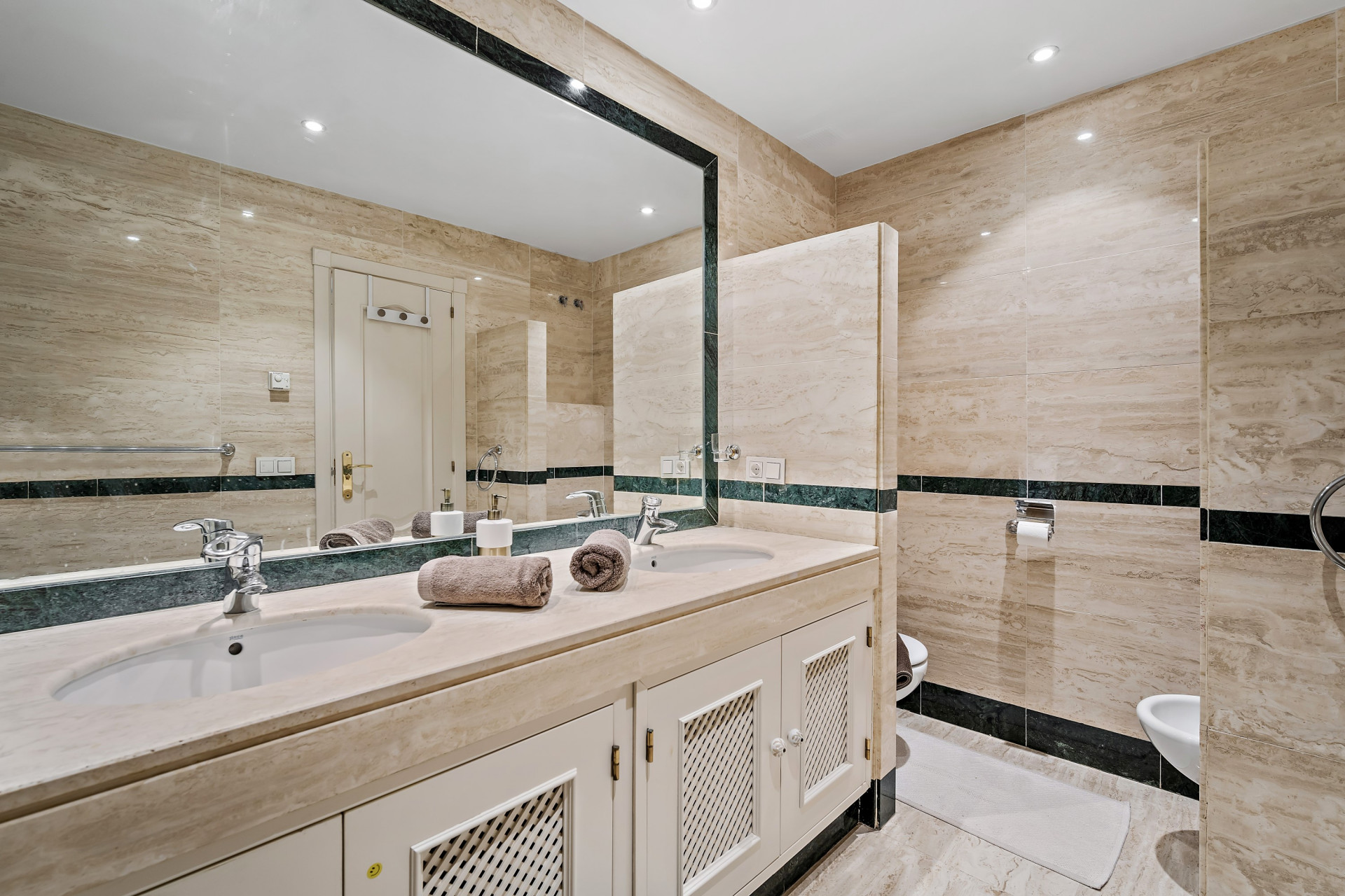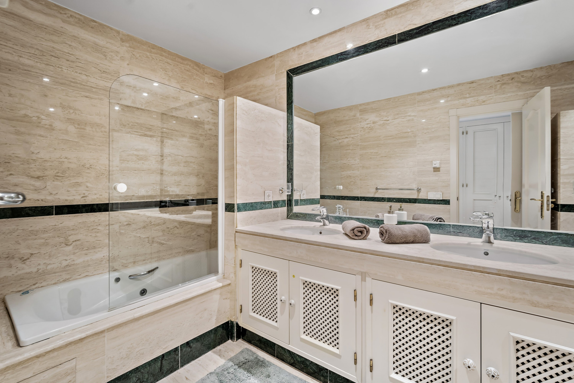 A la izquierda del hall de entrada hay un dormitorio doble con armarios empotrados y un amplio baño. A través de la zona de salón se accede al dormitorio principal con una cama super king, un vestidor con armarios empotrados y un baño con dos lavabos y bañera / ducha.