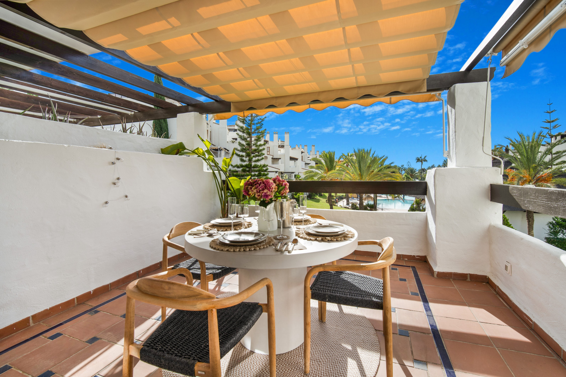El apartamento cuenta con una acogedora sala de estar con chimenea y una terraza ventosa, perfecta para relajarse durante los veranos en Marbella. Hay dos dormitorios, uno con cama king size y baño en suite, y otro con dos camas individuales y baño de visitas. Hay armarios empotrados en cada dormitorio y secador de pelo en ambos baños. Una cocina totalmente equipada y un comedor luminoso son perfectos para comidas familiares.