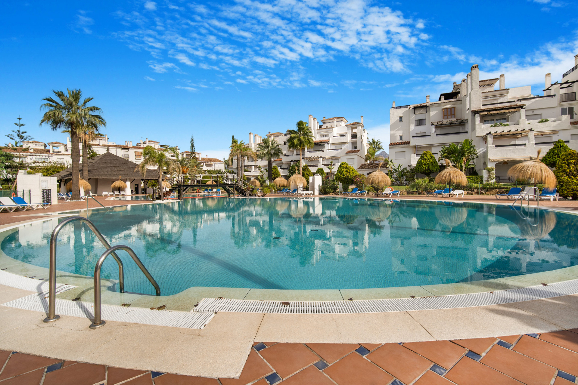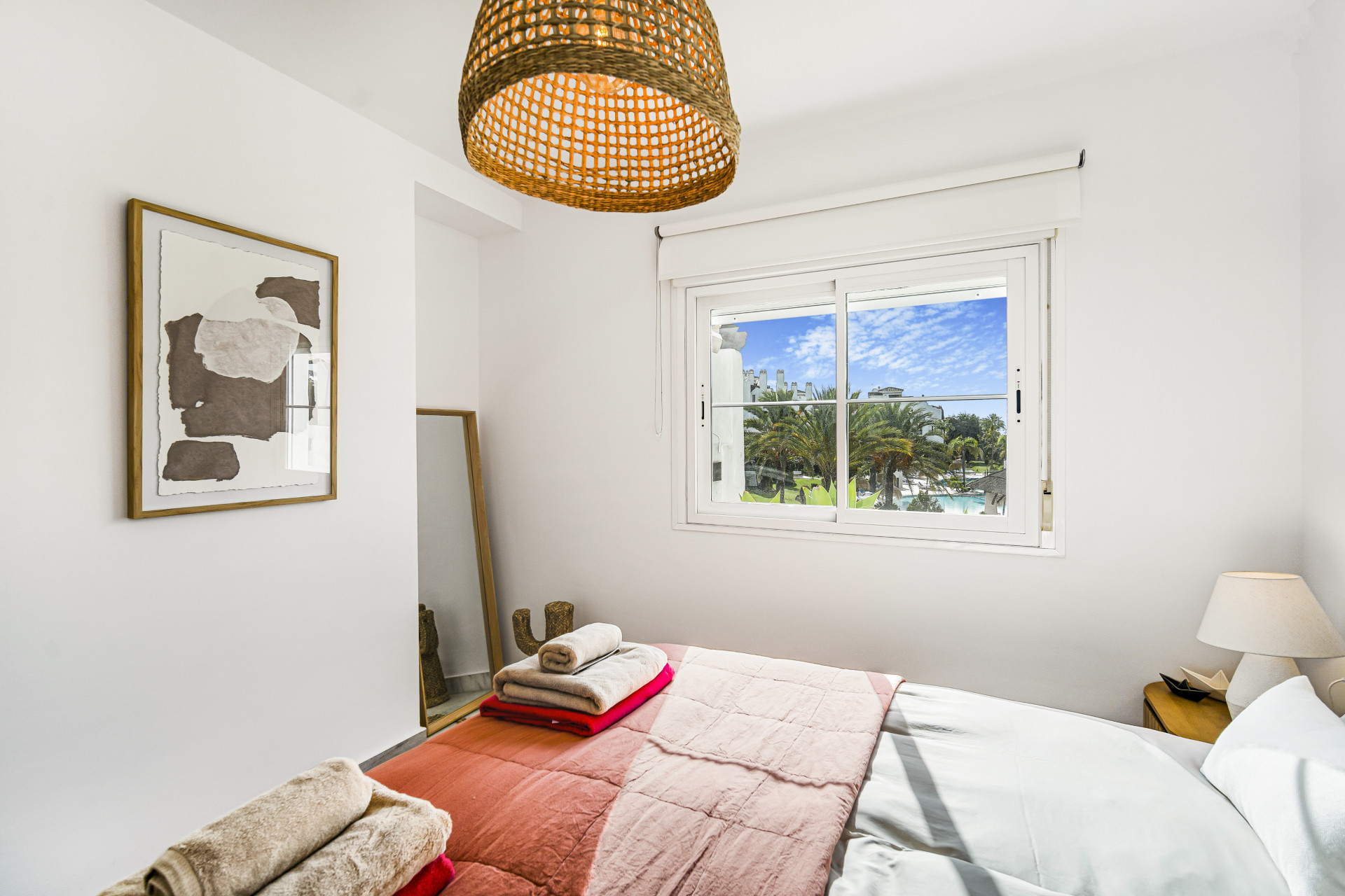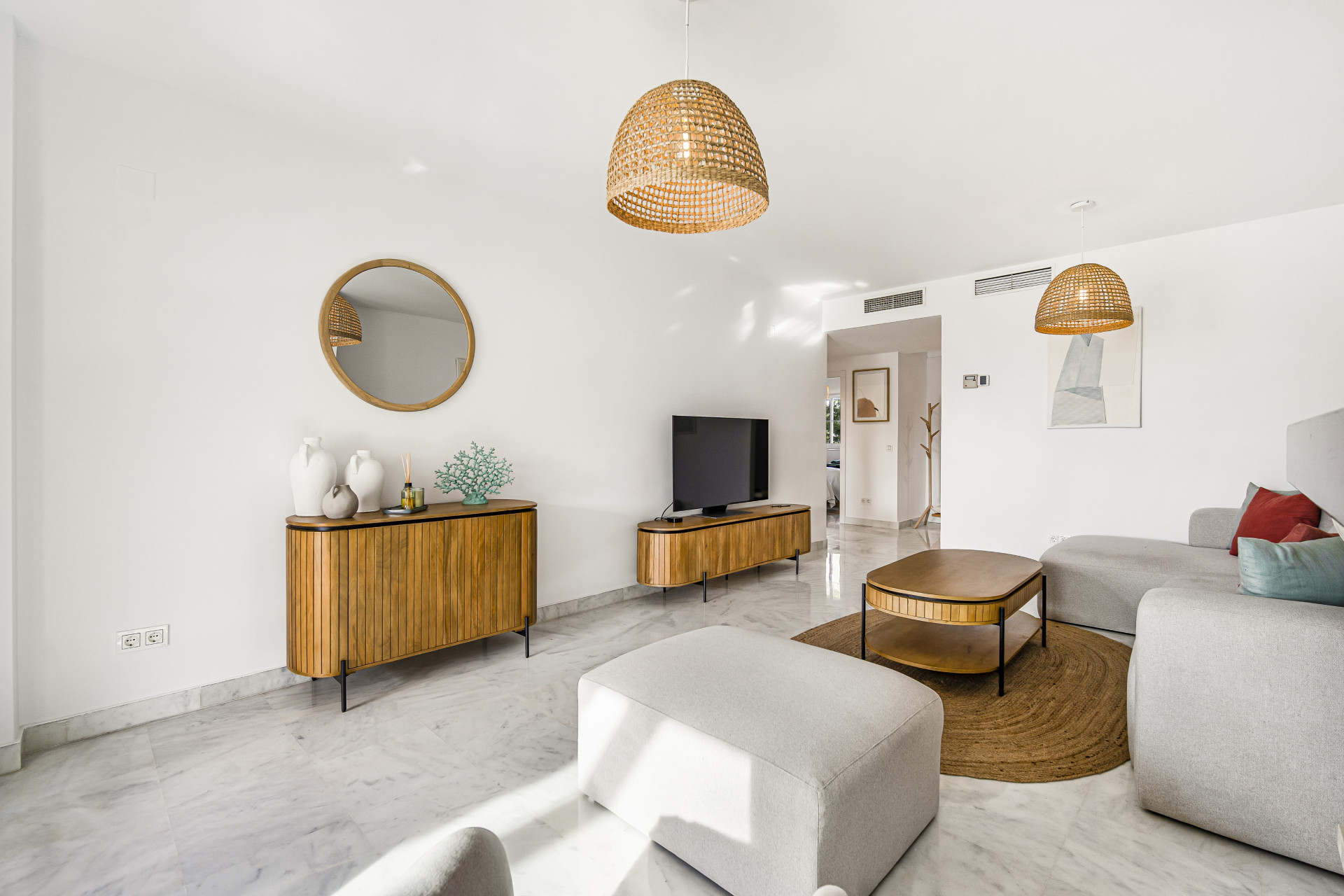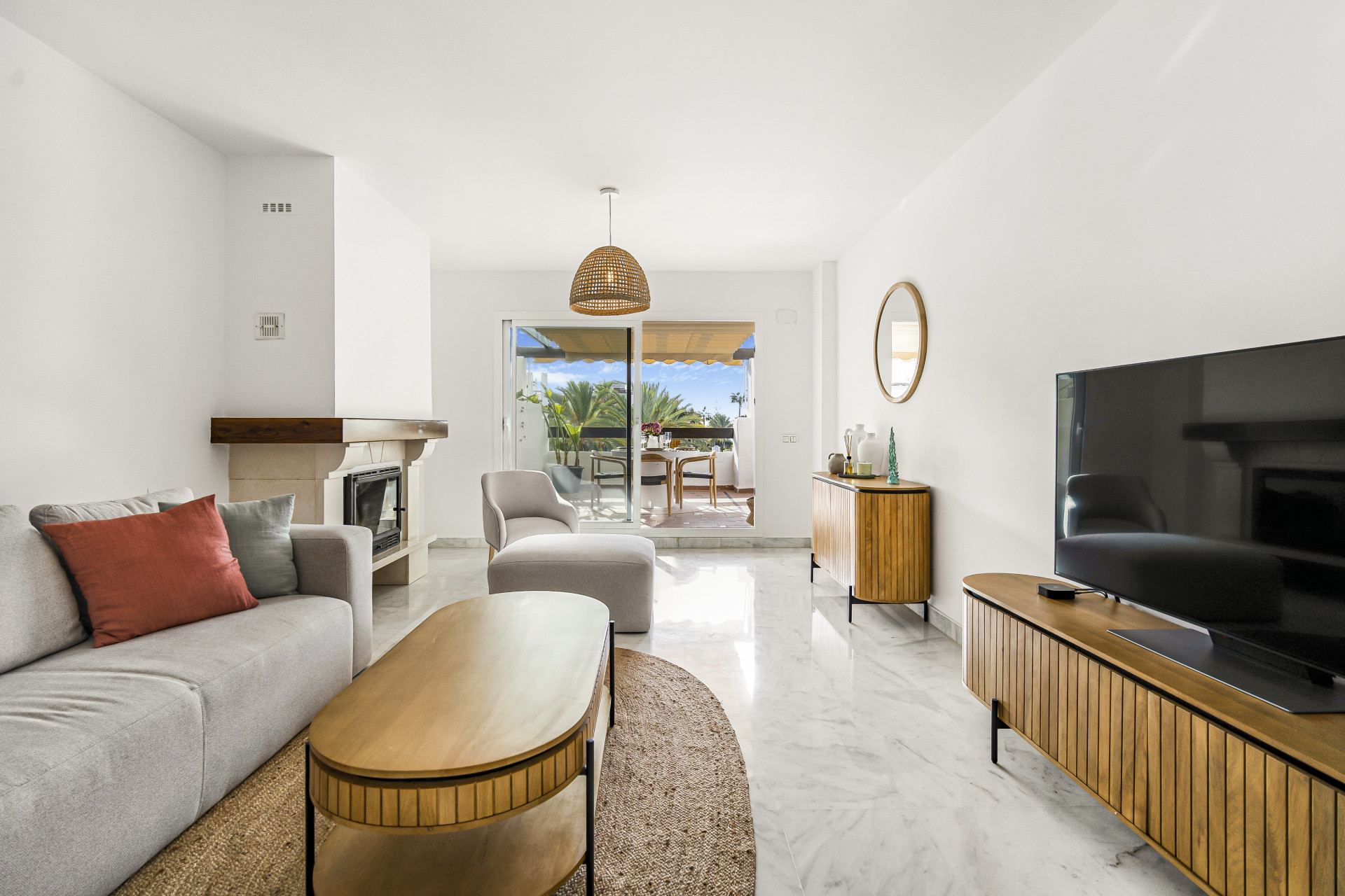 El apartamento cuenta con una acogedora sala de estar con chimenea y una terraza ventosa, perfecta para relajarse durante los veranos en Marbella. Hay dos dormitorios, uno con cama king size y baño en suite, y otro con dos camas individuales y baño de visitas. Hay armarios empotrados en cada dormitorio y secador de pelo en ambos baños. Una cocina totalmente equipada y un comedor luminoso son perfectos para comidas familiares.