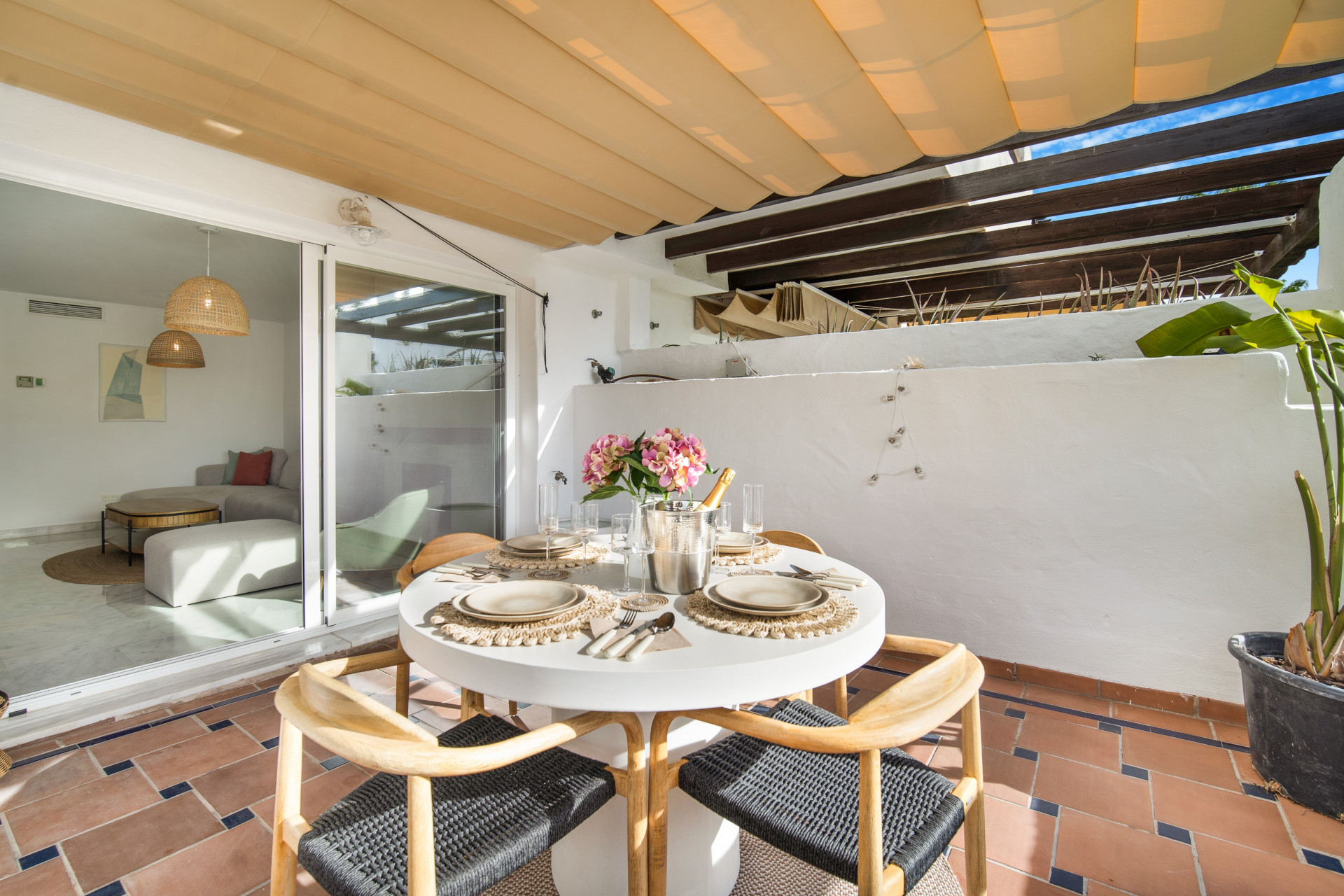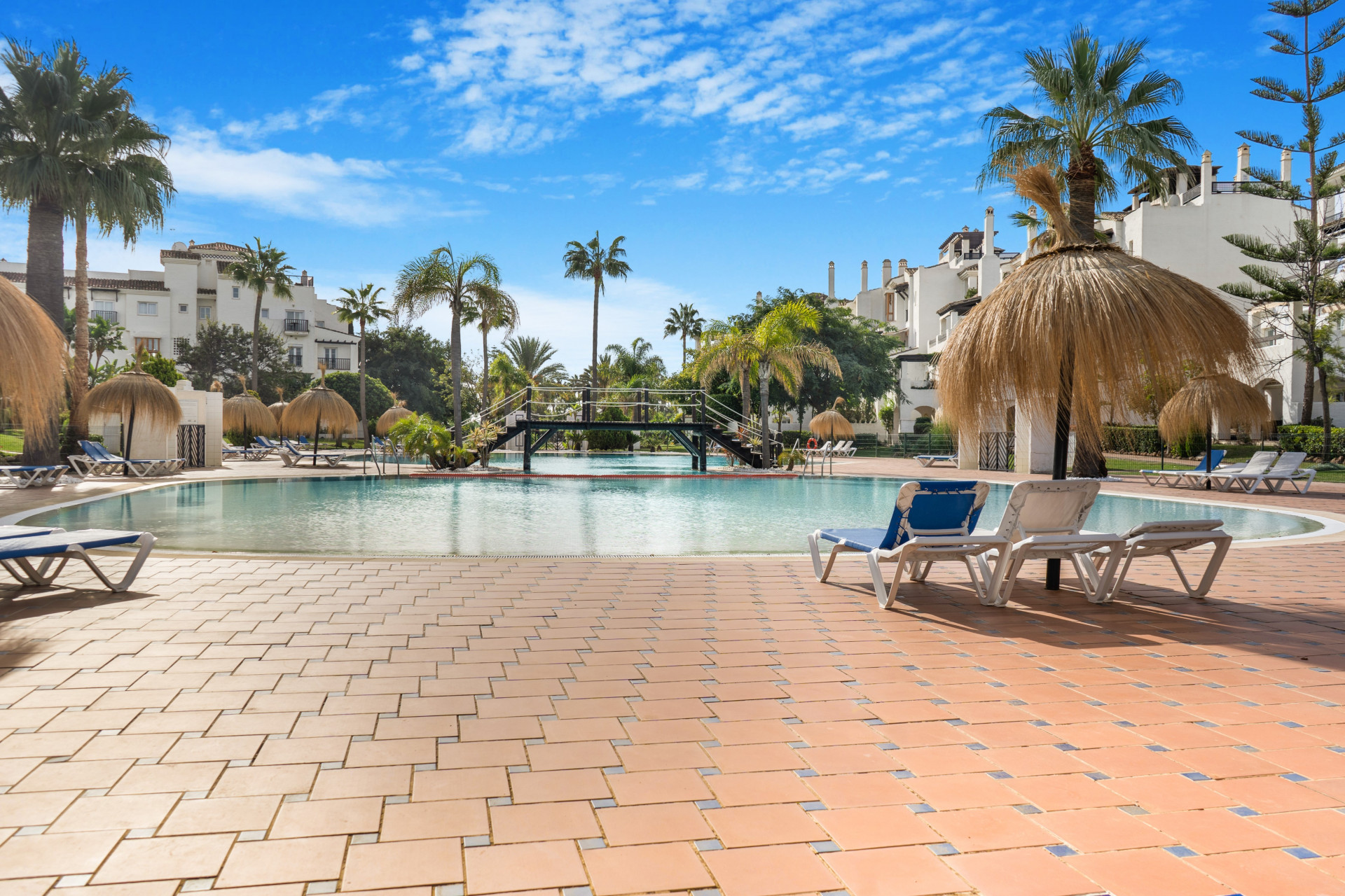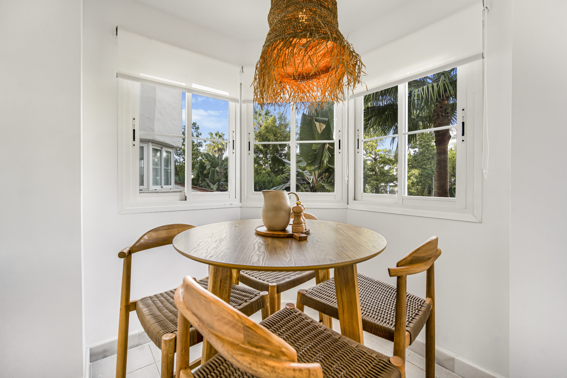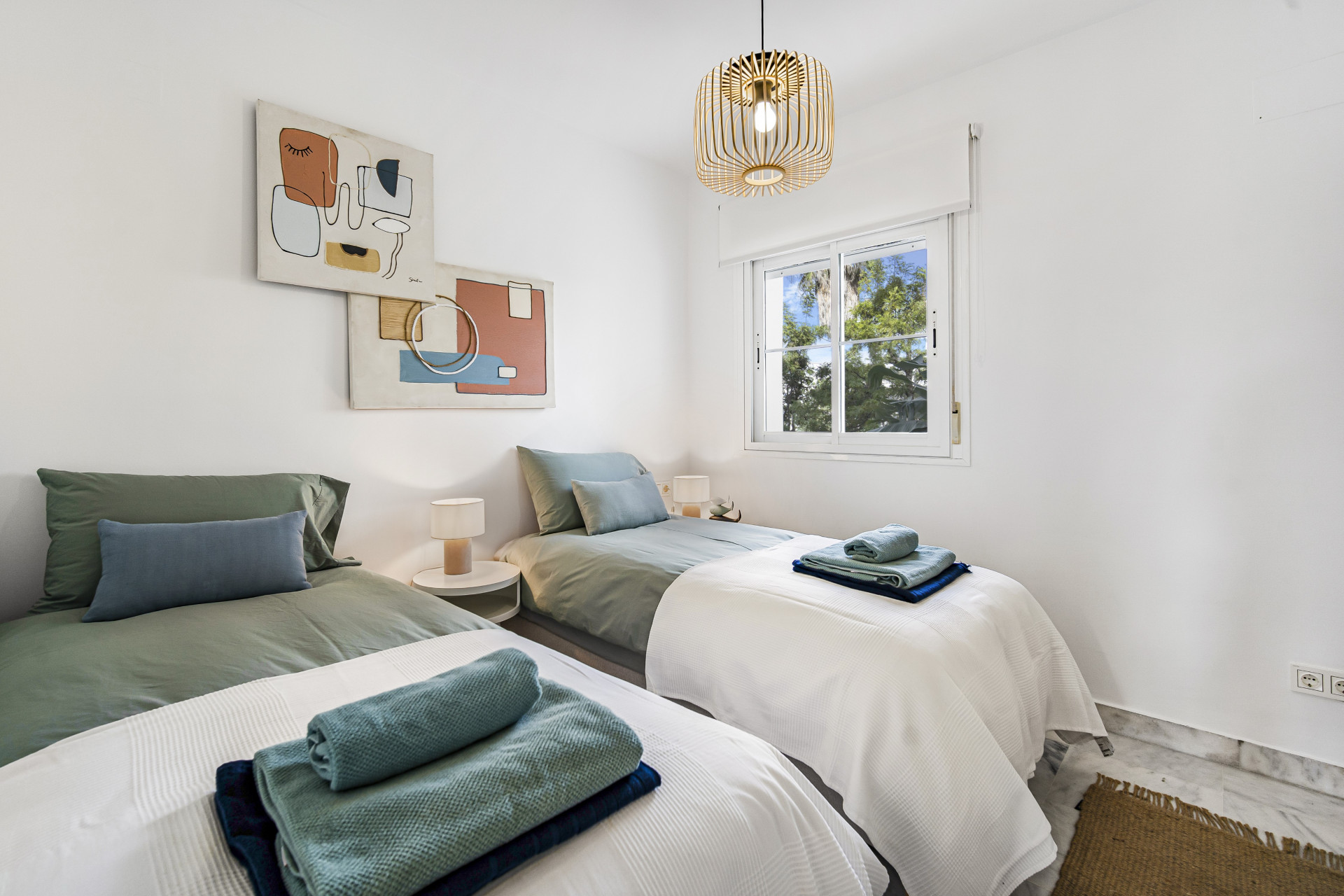 El apartamento cuenta con una acogedora sala de estar con chimenea y una terraza ventosa, perfecta para relajarse durante los veranos en Marbella. Hay dos dormitorios, uno con cama king size y baño en suite, y otro con dos camas individuales y baño de visitas. Hay armarios empotrados en cada dormitorio y secador de pelo en ambos baños. Una cocina totalmente equipada y un comedor luminoso son perfectos para comidas familiares.