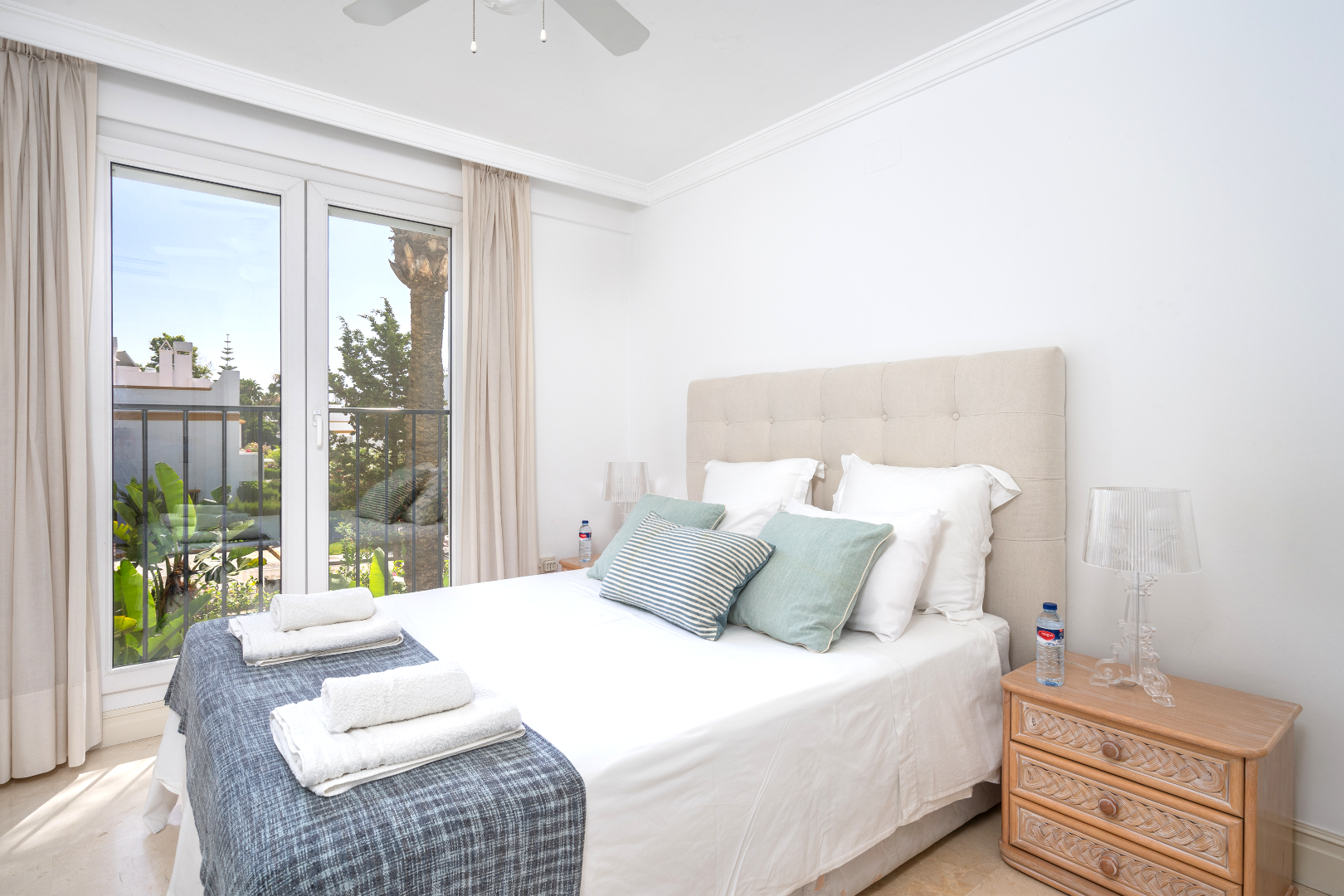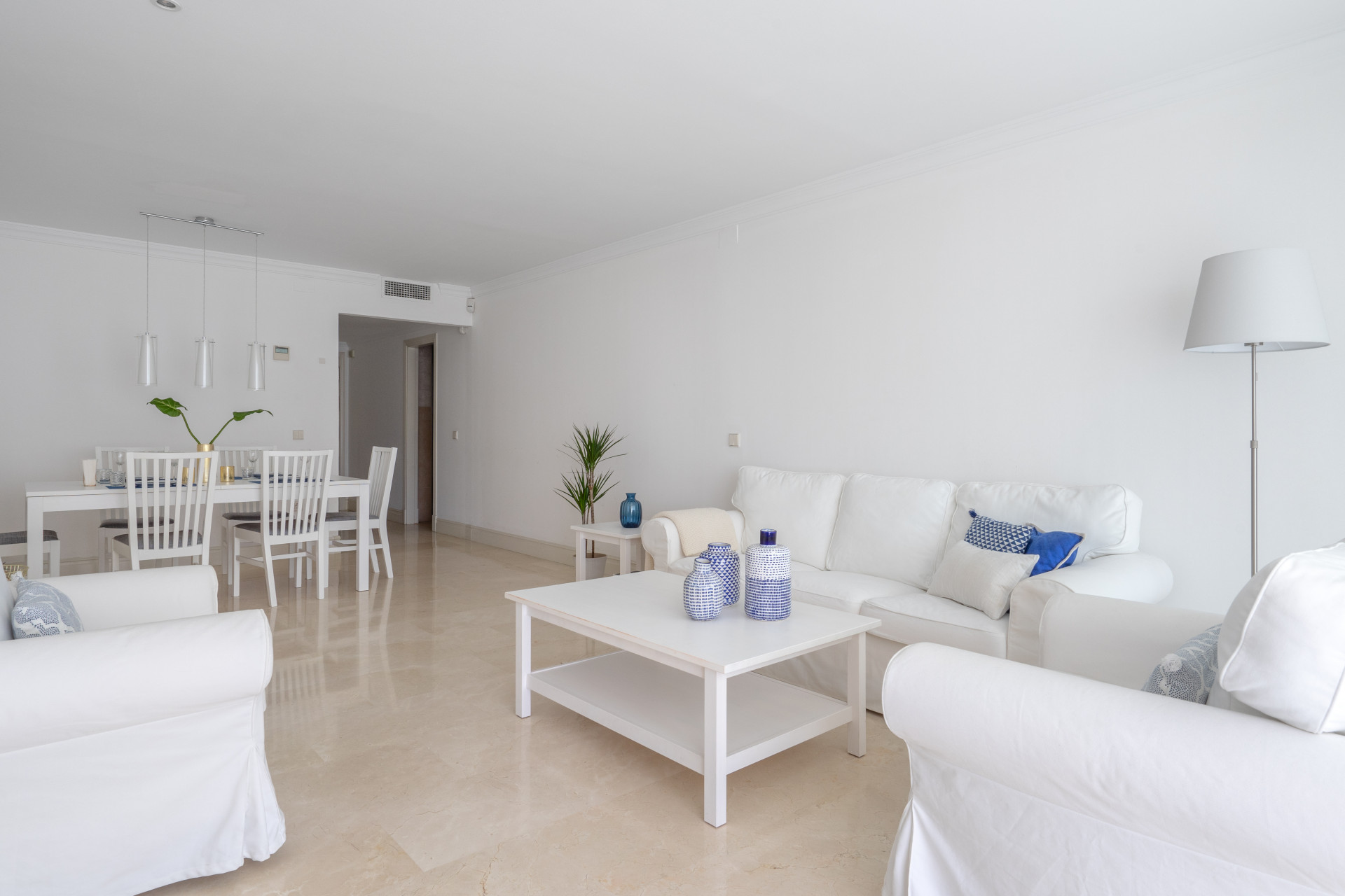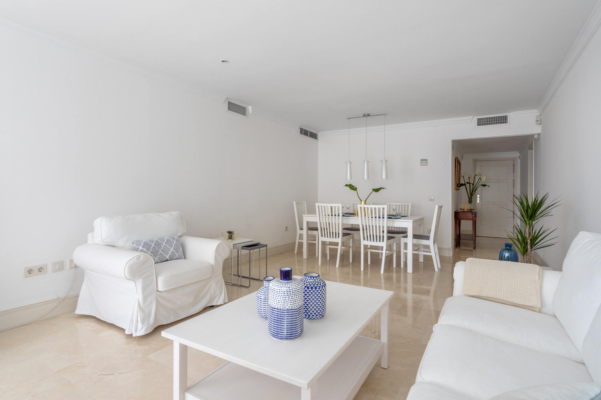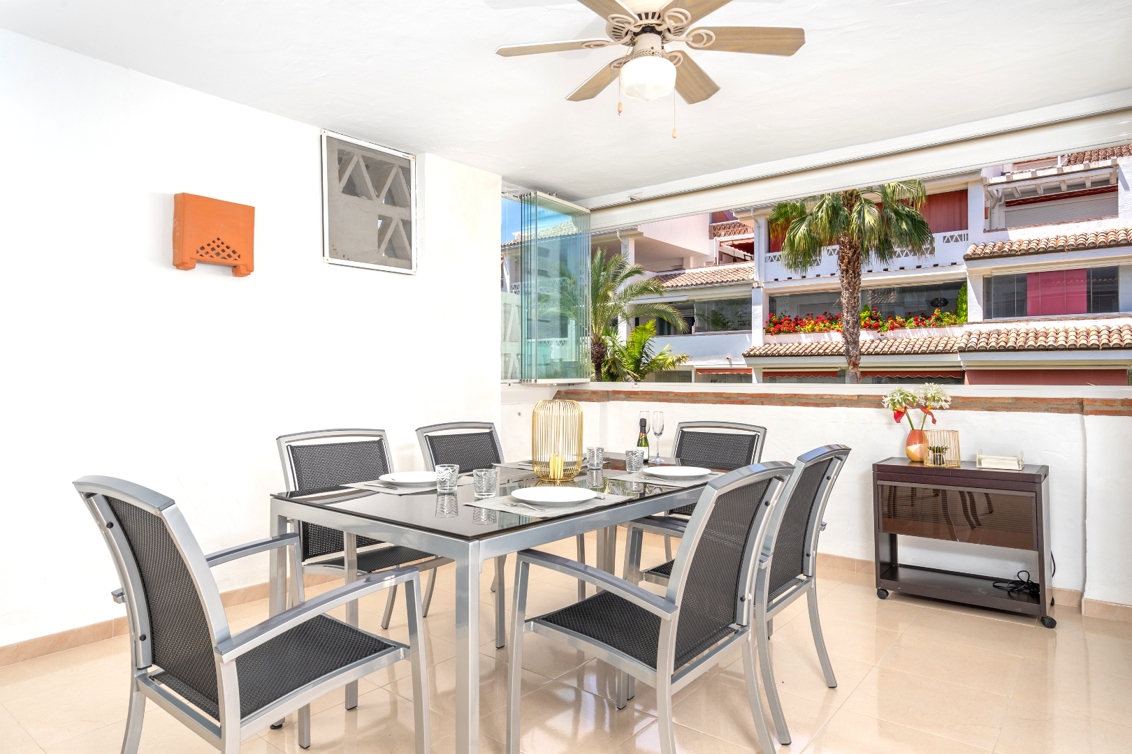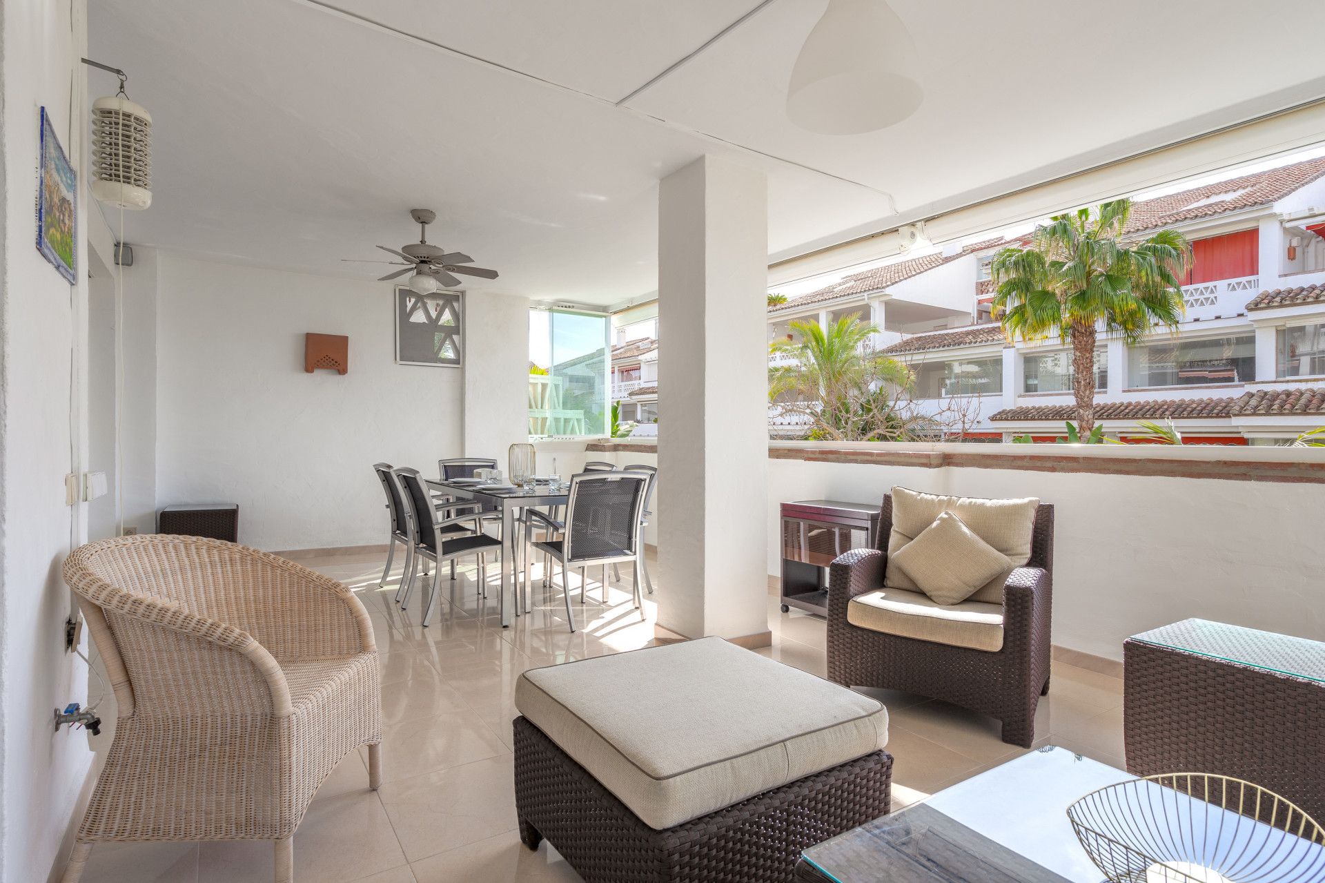 El apartamento cuenta con una sala de estar y un comedor de planta abierta, complementados con puertas francesas que se abren a una terraza privada cerrada con cortinas de vidrio. La cocina bien equipada está separada e incluye todos los electrodomésticos necesarios. El dormitorio principal ofrece baño en suite y acceso directo a la soleada terraza. Un pasillo conduce a dos dormitorios de invitados, uno con dos camas individuales y otro con cama de matrimonio, además de un baño de visitas. Los servicios adicionales incluyen aire acondicionado frío y caliente, armarios empotrados y una plaza de aparcamiento subterráneo.