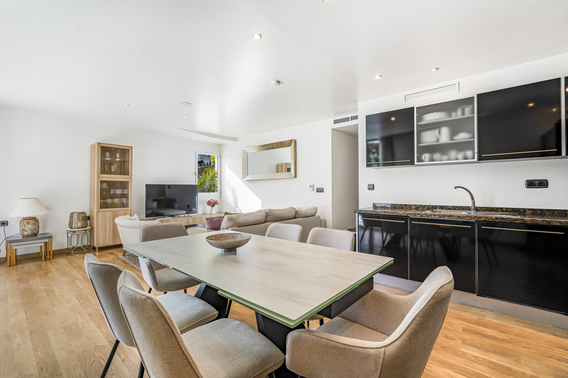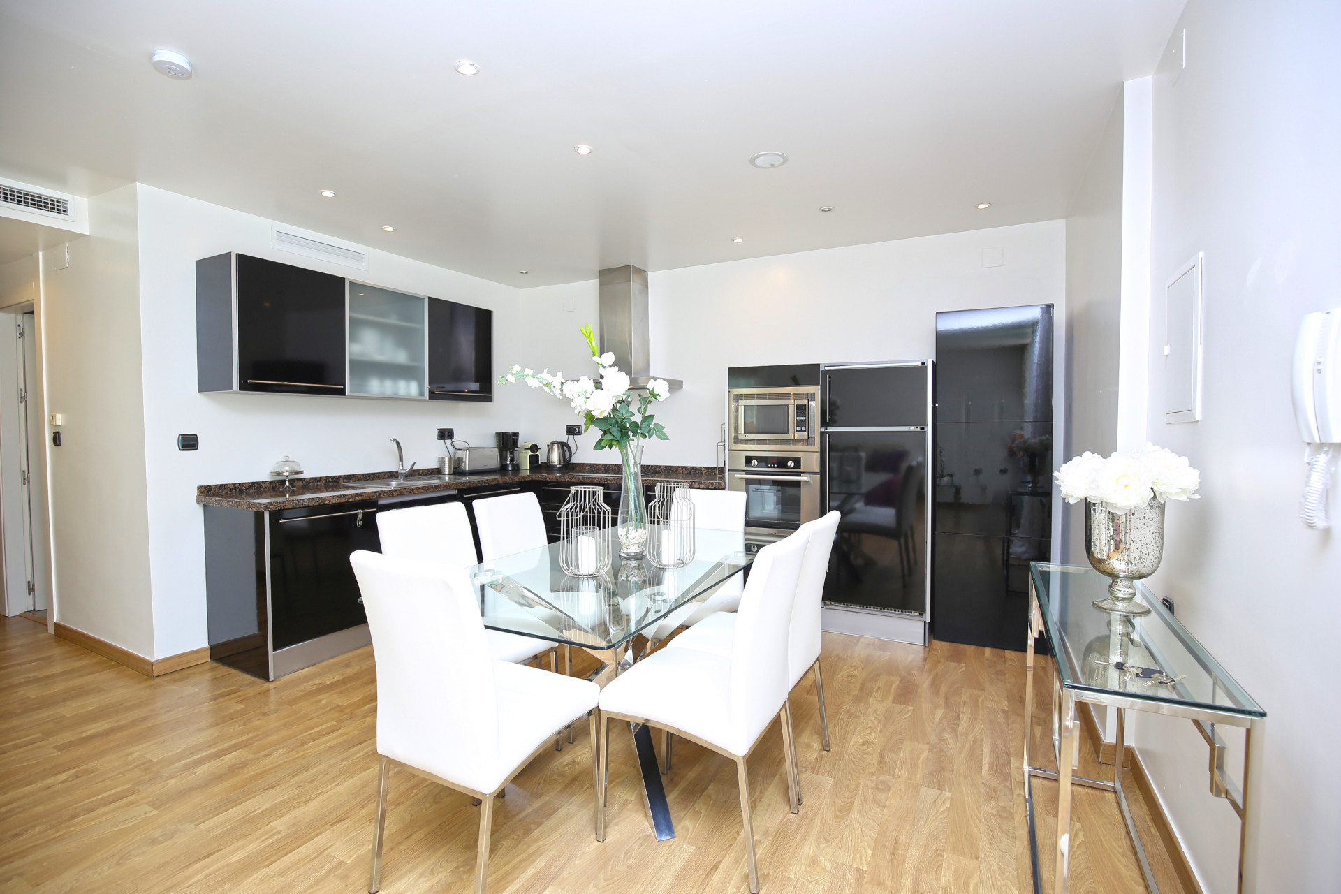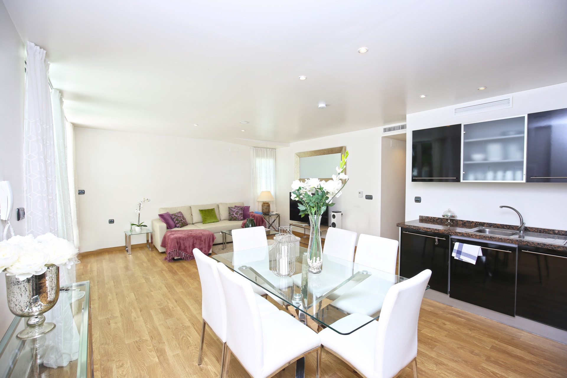 Usted entra al apartamento a través del salón abierto, el comedor y la cocina, todos los cuales han sido decorados con buen gusto para ser cómodos y convenientes.