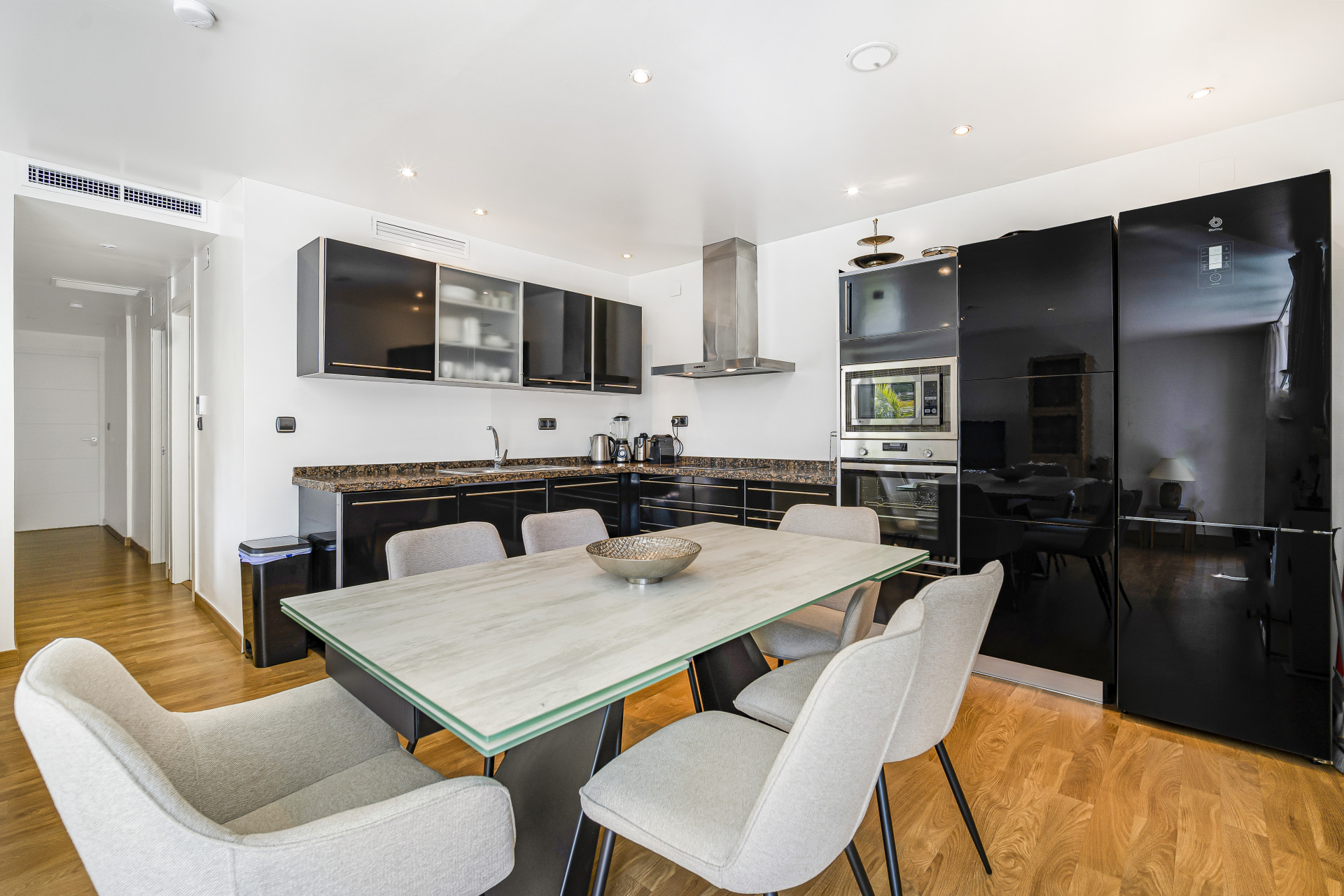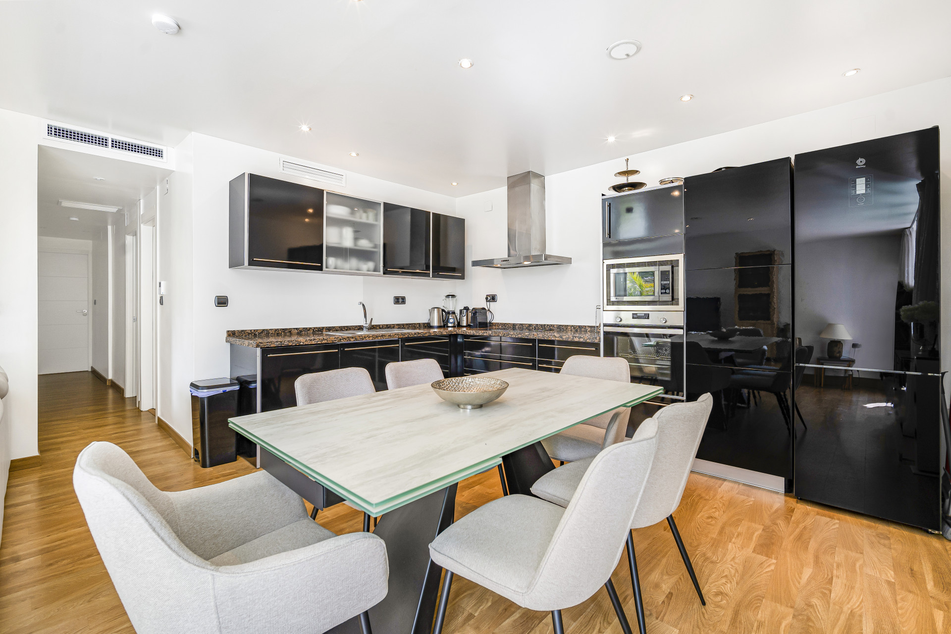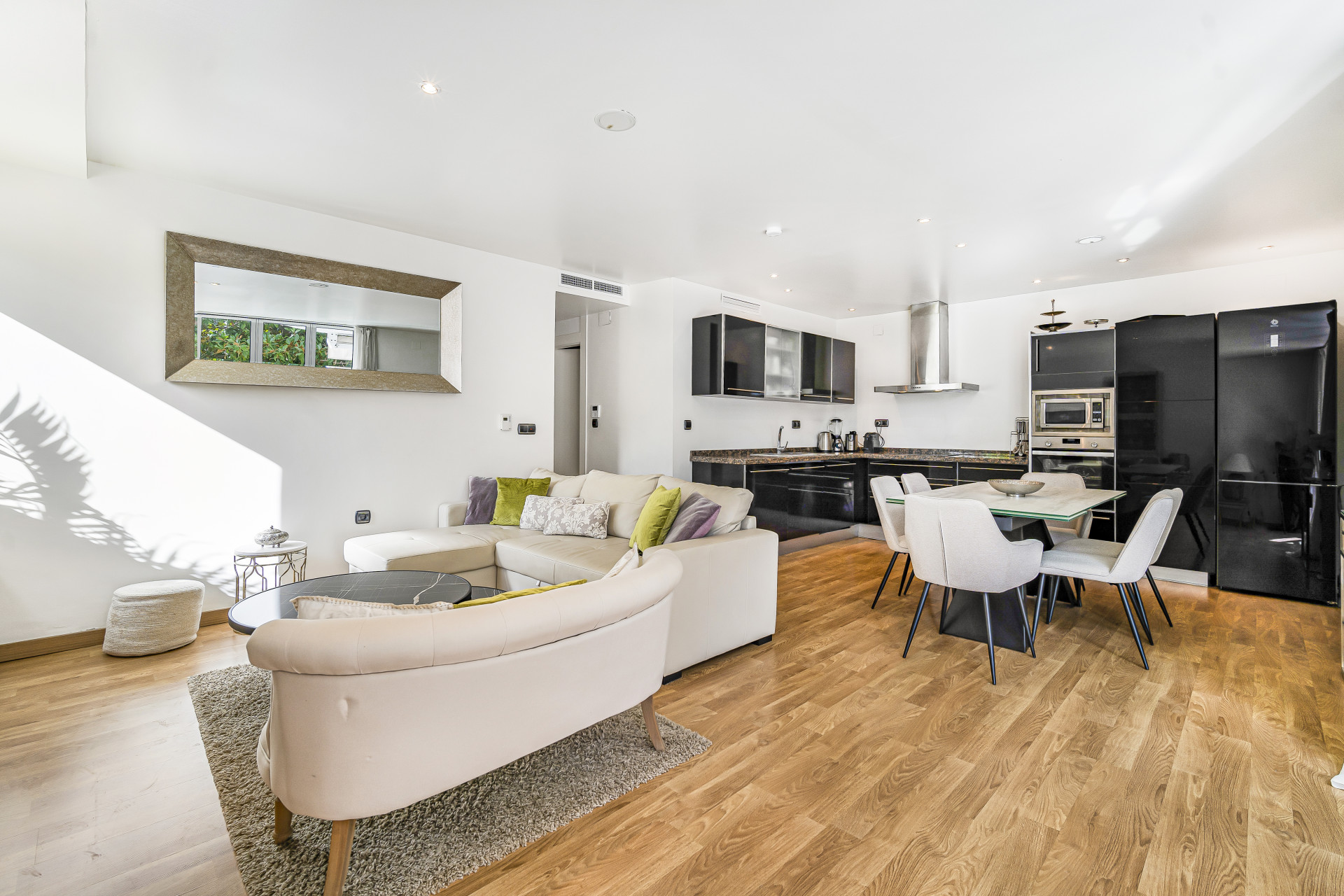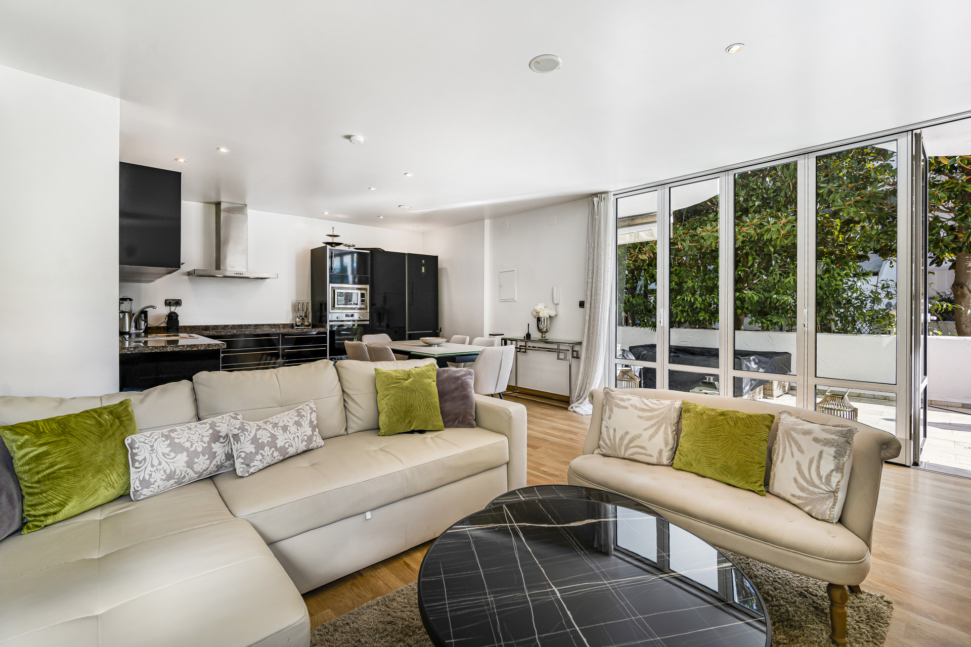 Usted entra al apartamento a través del salón abierto, el comedor y la cocina, todos los cuales han sido decorados con buen gusto para ser cómodos y convenientes.