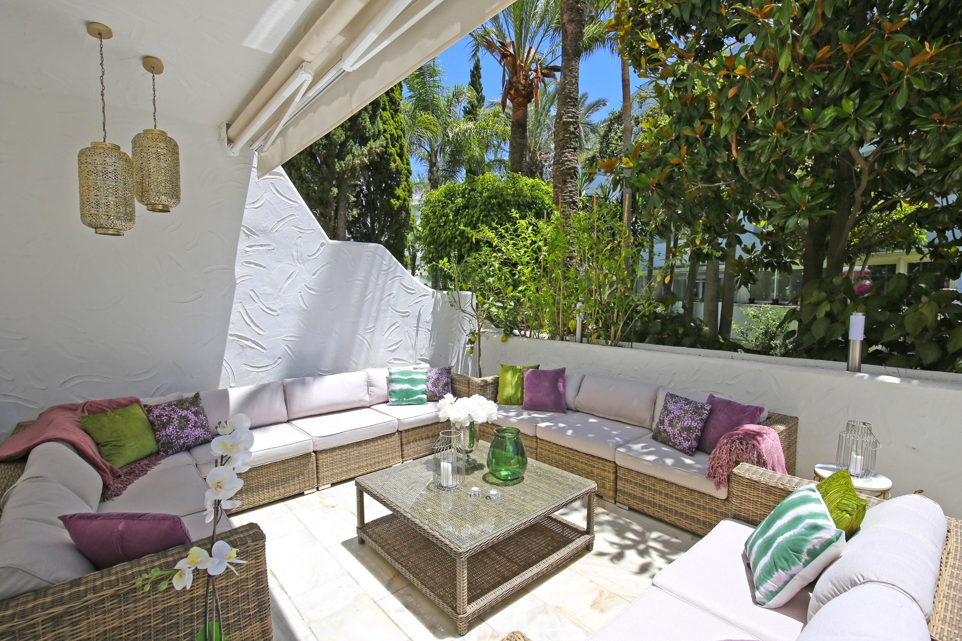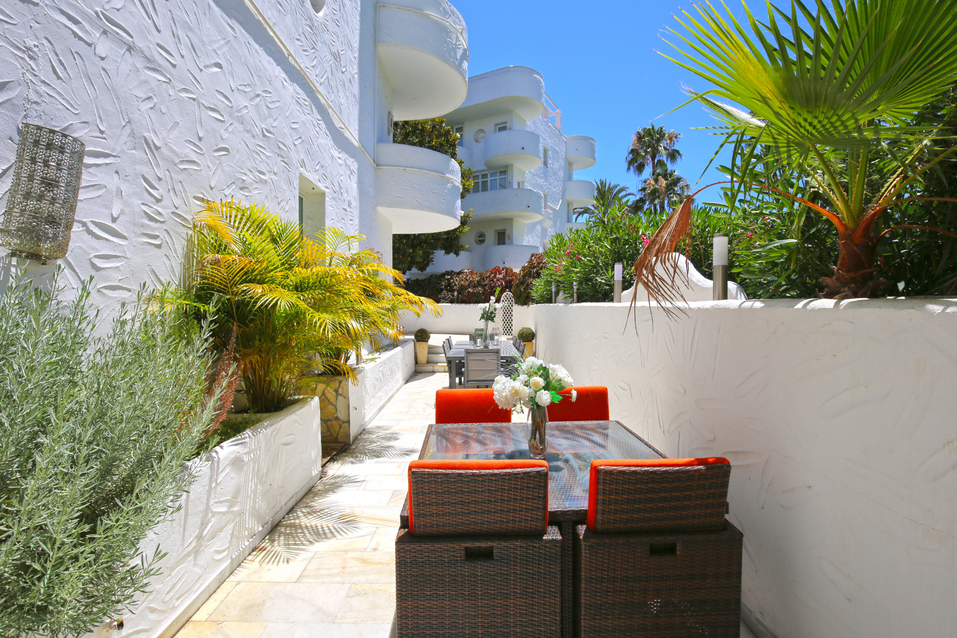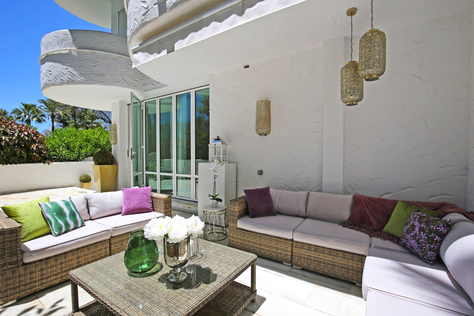 Apartamento de 3 dormitorios recién decorado en la mejor ubicación de la Milla de Oro en Marbella Real, a solo 2 minutos a pie de la playa de Casablanca. Hermosa y espaciosa terraza para disfrutar del sol de la mañana y la tarde en un lugar muy privado y tranquilo y todos los muebles y accesorios de la más alta calidad. Los huéspedes disfrutarán de amplios jardines tropicales, cascadas, fuentes y jardines de flores y una piscina. Este complejo cerrado y seguro las 24 horas está a dos minutos a pie de las tiendas, excelentes restaurantes, supermercados, campos de golf y una gran cantidad de instalaciones de ocio a muy poca distancia.
