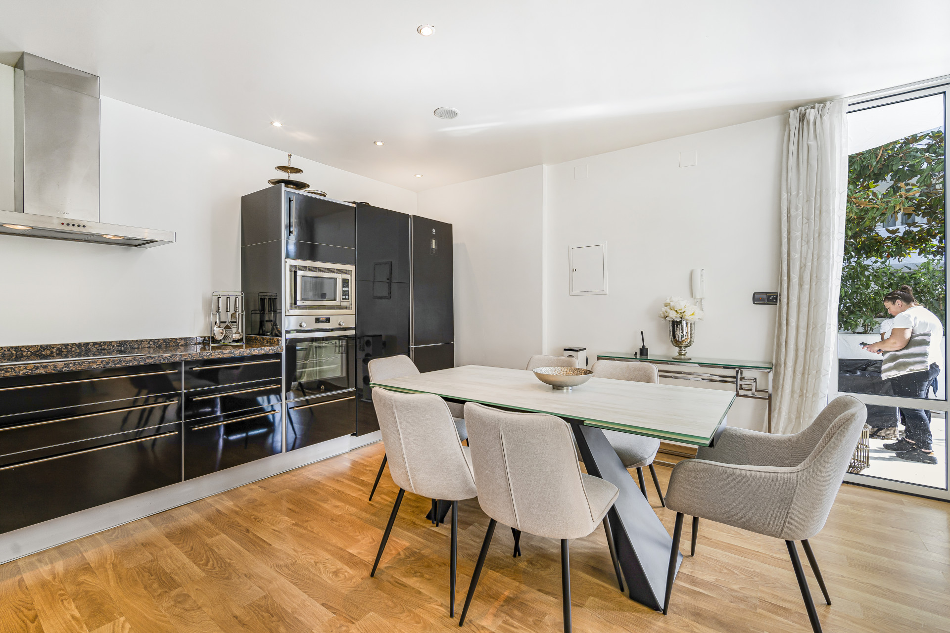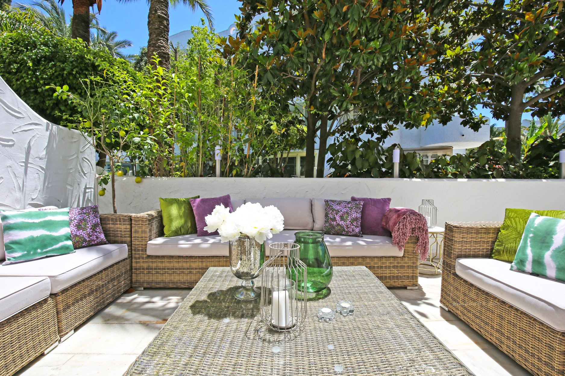 El apartamento consta de una amplia terraza en forma de L, un lado con un comedor con nevera y congelador, y el otro una zona chill out con cómodos y relajantes sofás y sillones e iluminación ambiental. Incluso hay hierbas frescas como la menta y el cilantro que puedes usar.