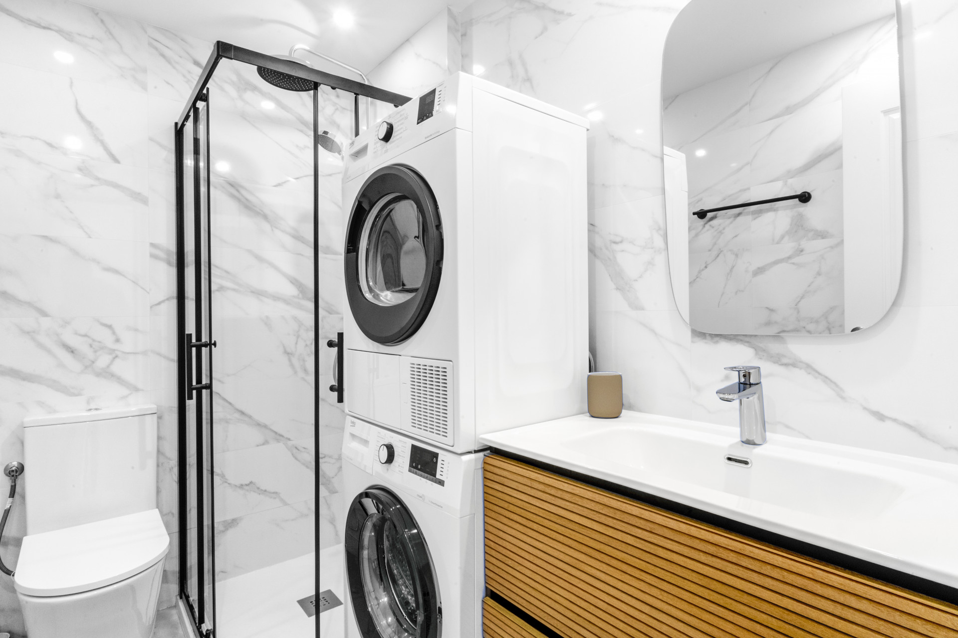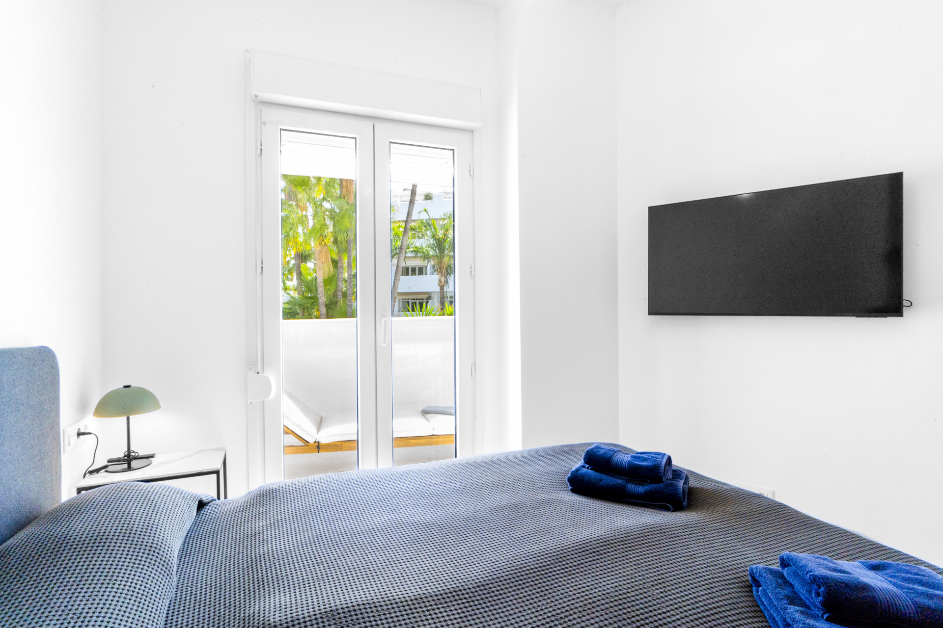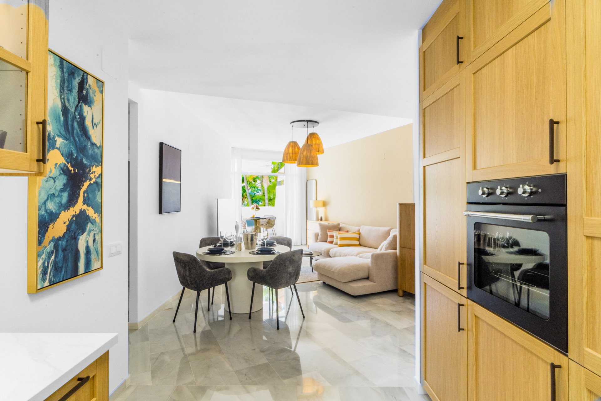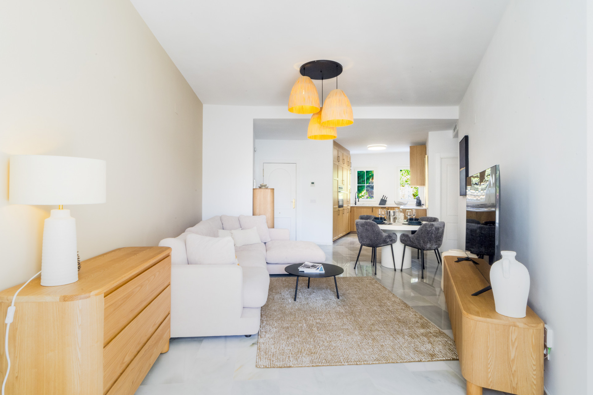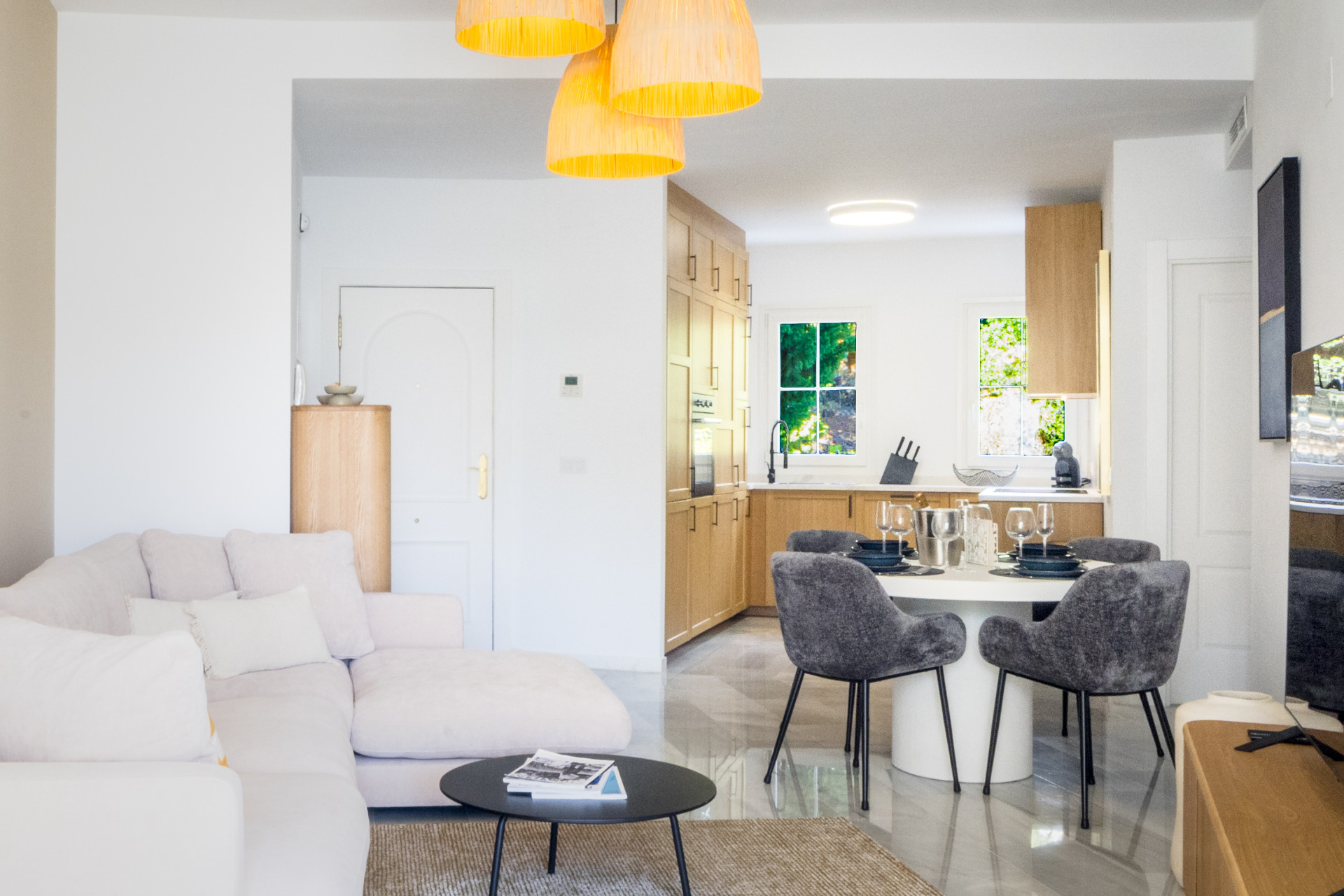 El apartamento consta de un salón abierto, cocina y comedor, con muebles y electrodomésticos nuevos en todas partes. Todo el espacio es luminoso y abierto, perfecto para socializar y relajarse con la familia en el cómodo sofá. El pasillo lo lleva a una habitación con dos camas individuales, un baño familiar y el dormitorio principal con cama tamaño king y baño en suite.