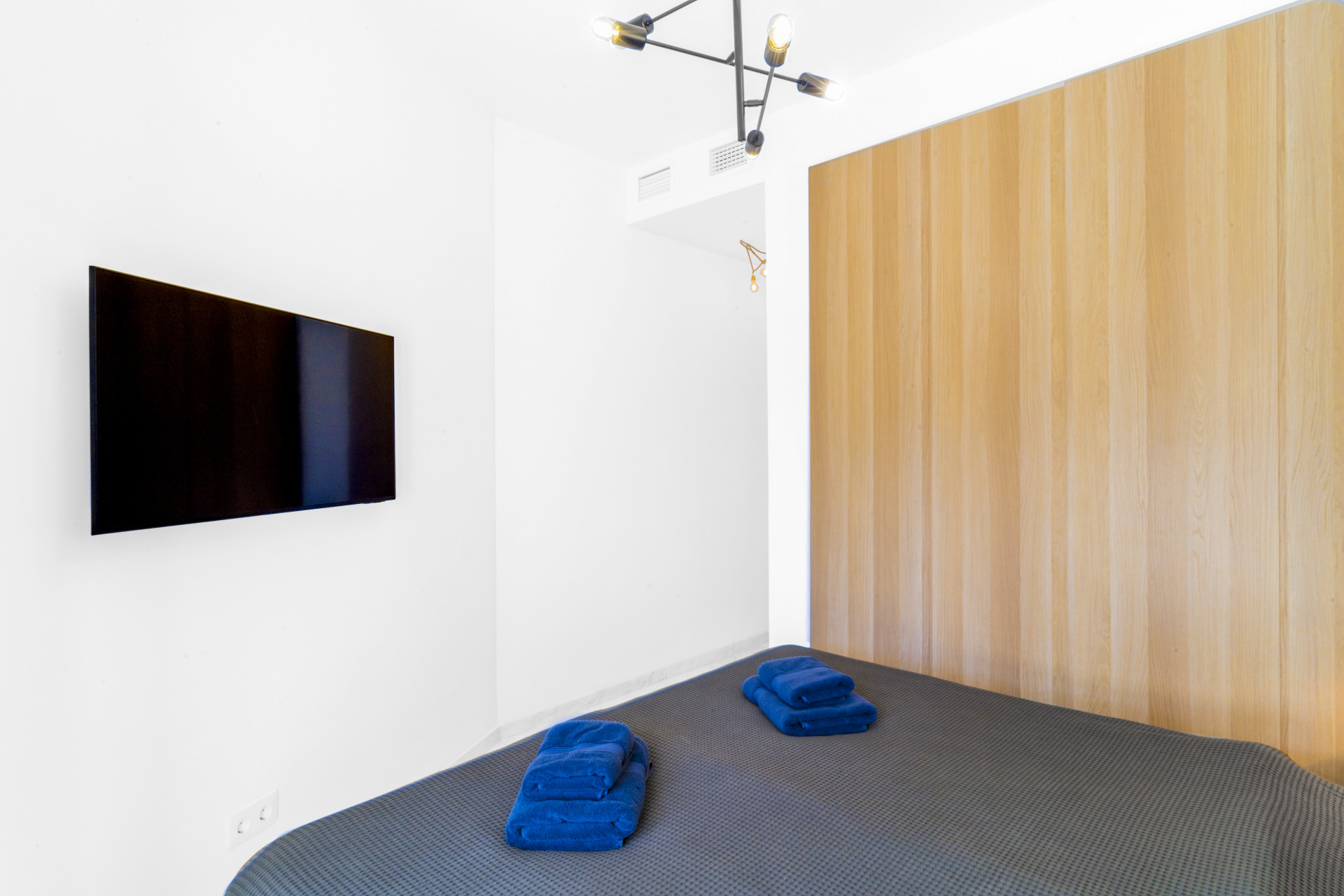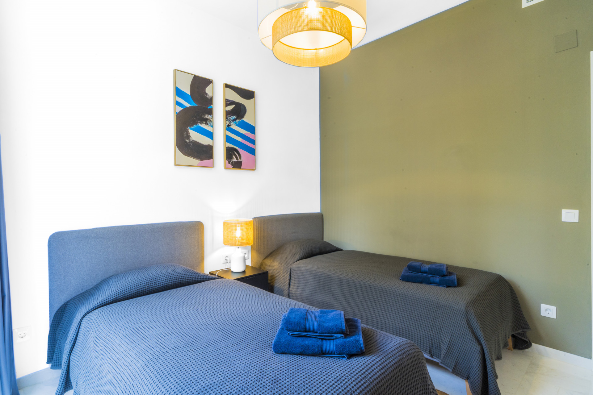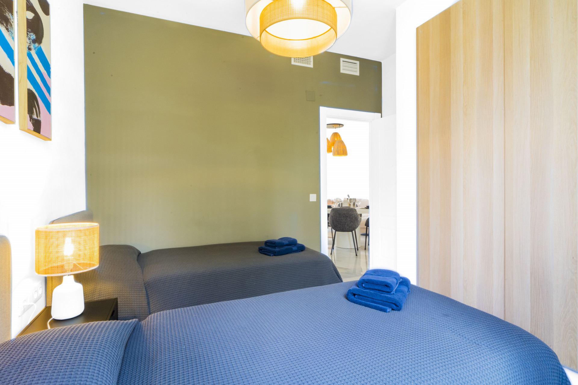 El apartamento consta de un salón abierto, cocina y comedor, con muebles y electrodomésticos nuevos en todas partes. Todo el espacio es luminoso y abierto, perfecto para socializar y relajarse con la familia en el cómodo sofá. El pasillo lo lleva a una habitación con dos camas individuales, un baño familiar y el dormitorio principal con cama tamaño king y baño en suite.