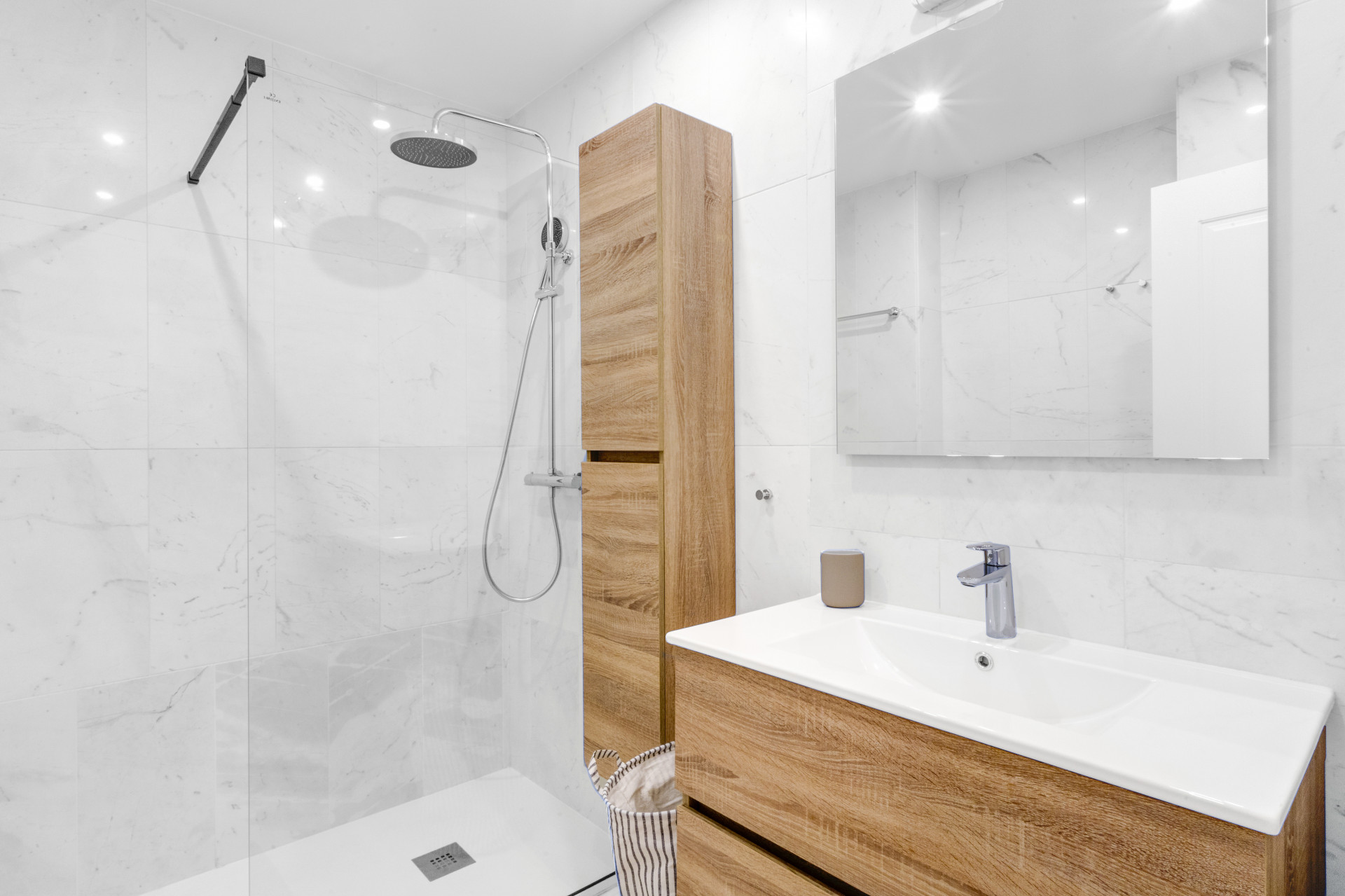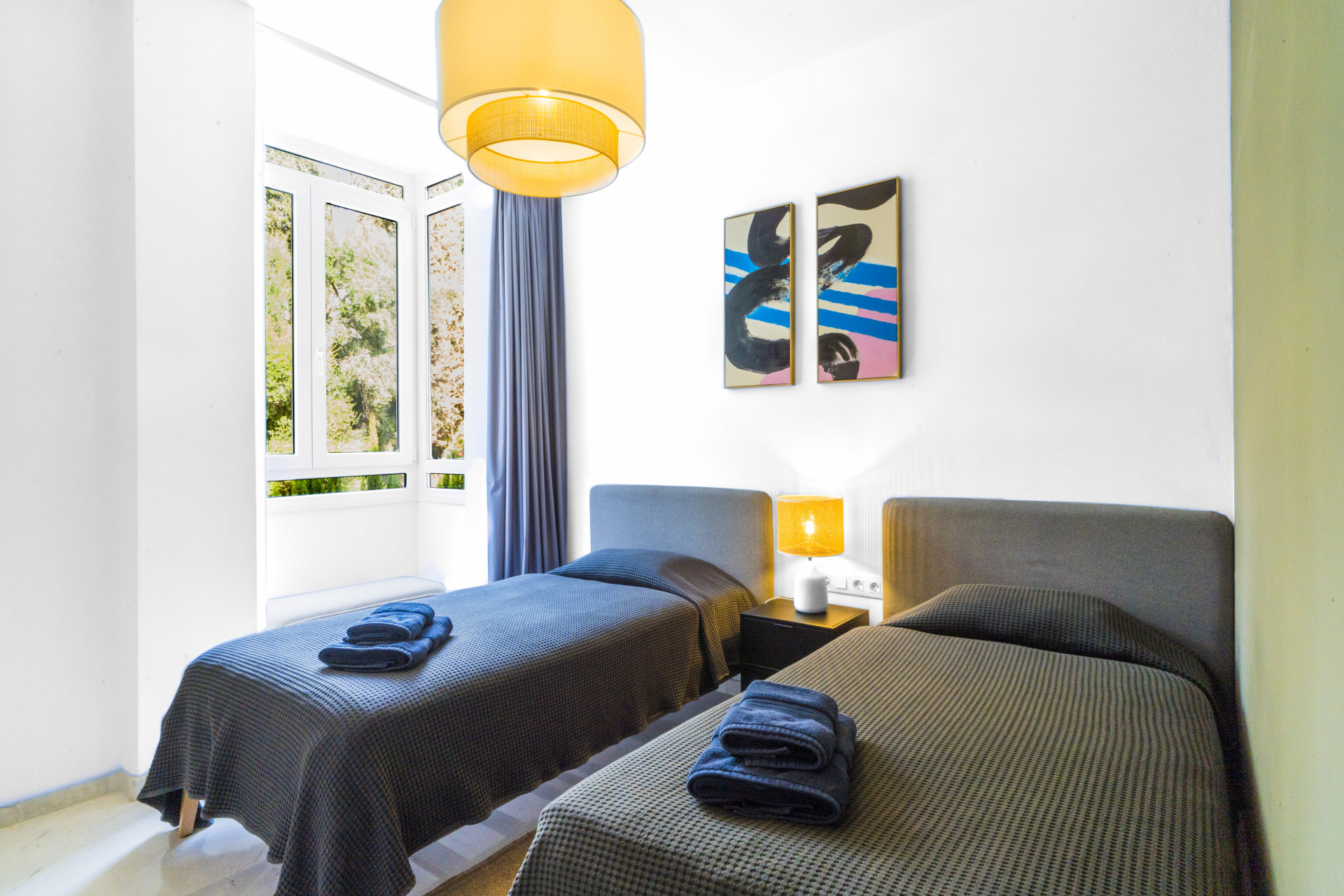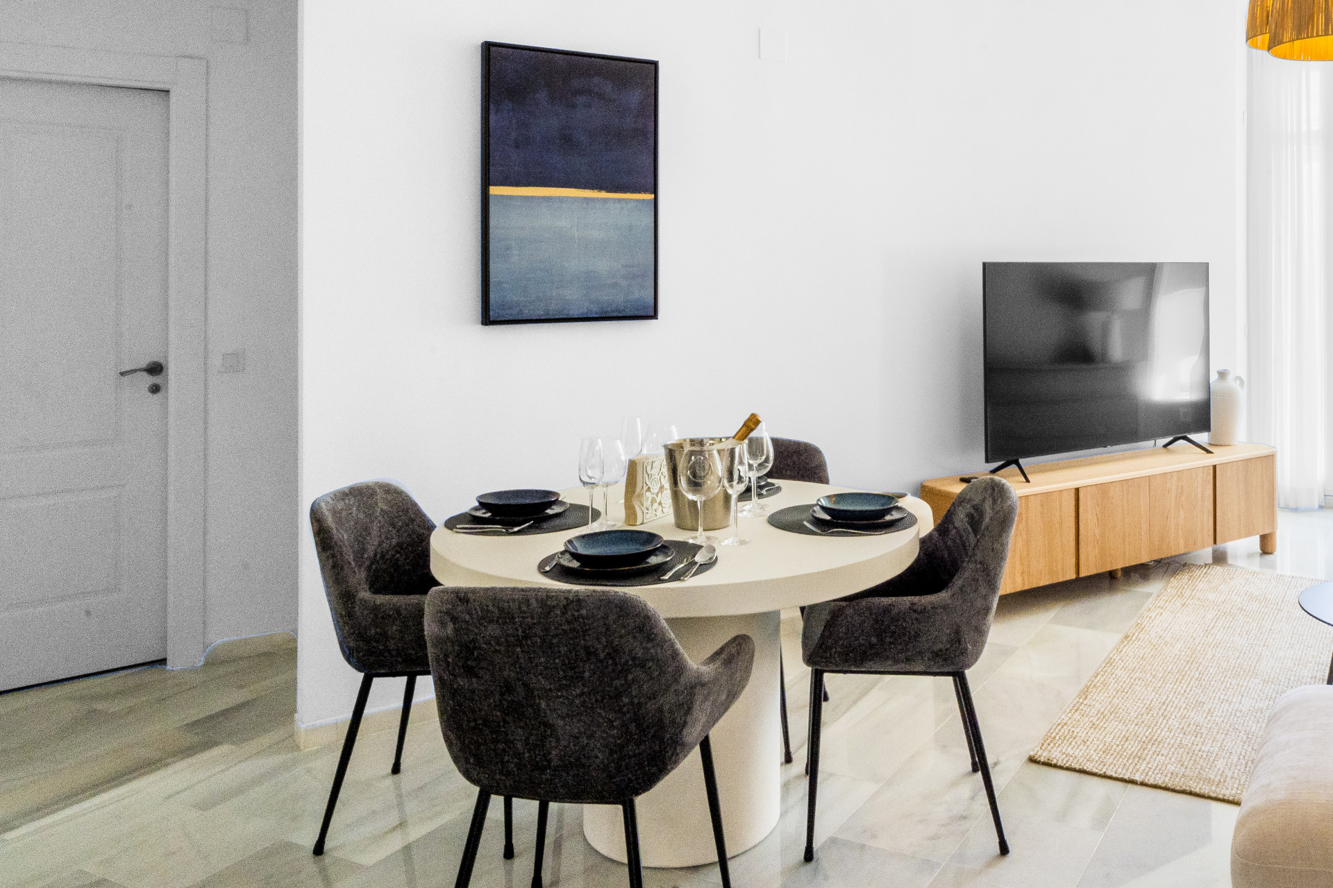 El apartamento consta de un salón abierto, cocina y comedor, con muebles y electrodomésticos nuevos en todas partes. Todo el espacio es luminoso y abierto, perfecto para socializar y relajarse con la familia en el cómodo sofá. El pasillo lo lleva a una habitación con dos camas individuales, un baño familiar y el dormitorio principal con cama tamaño king y baño en suite.