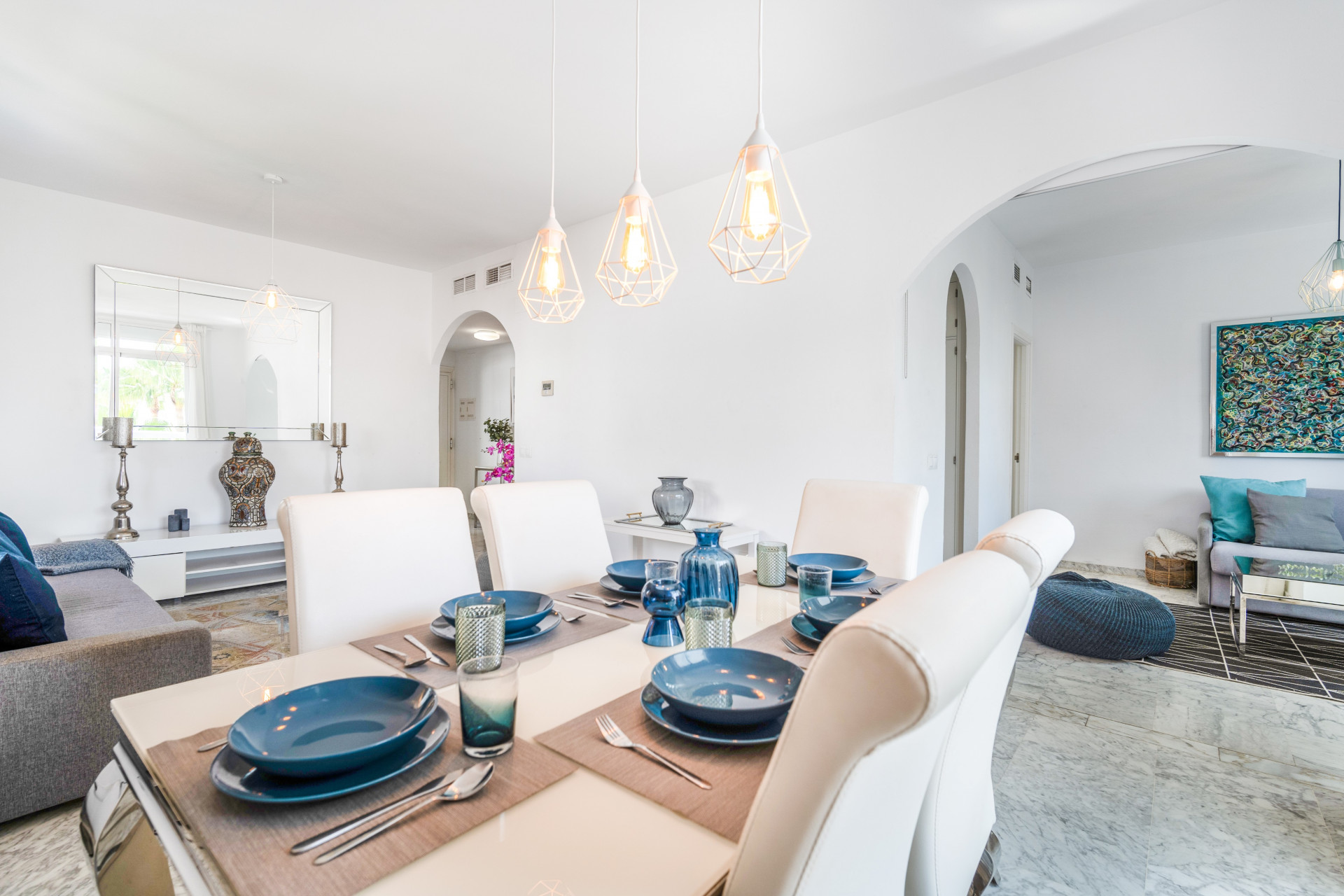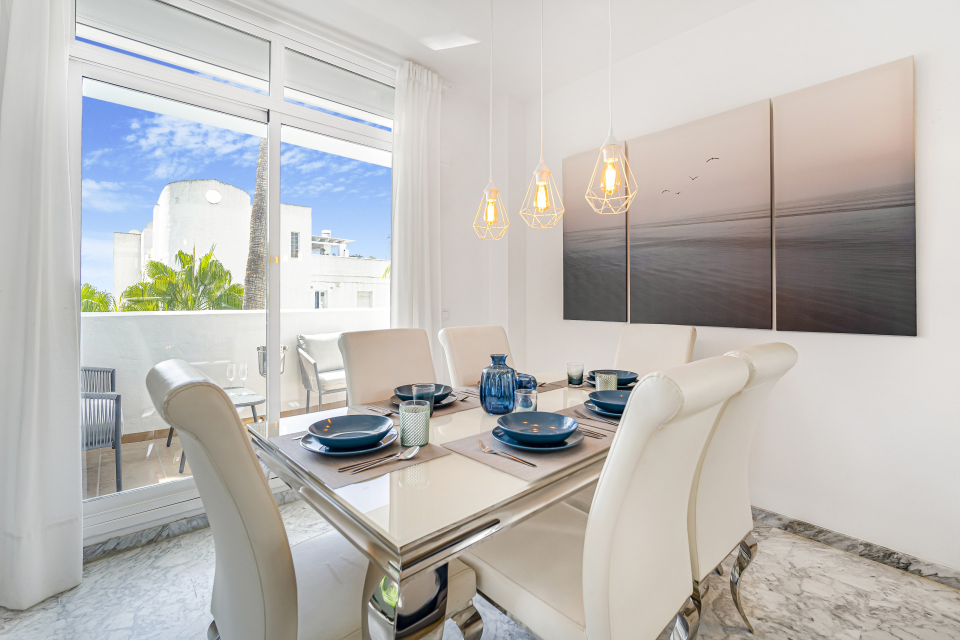 El apartamento consta de un salón y un comedor abiertos, todos ellos decorados con buen gusto para que sean prácticos y confortables para seis personas. Todo el espacio es luminoso y abierto, perfecto para socializar y relajarse en familia en los cómodos sofás o en el comedor con vistas al mar. El pasillo te lleva a los 3 dormitorios diferentes, todos amueblados con camas tamaño king.