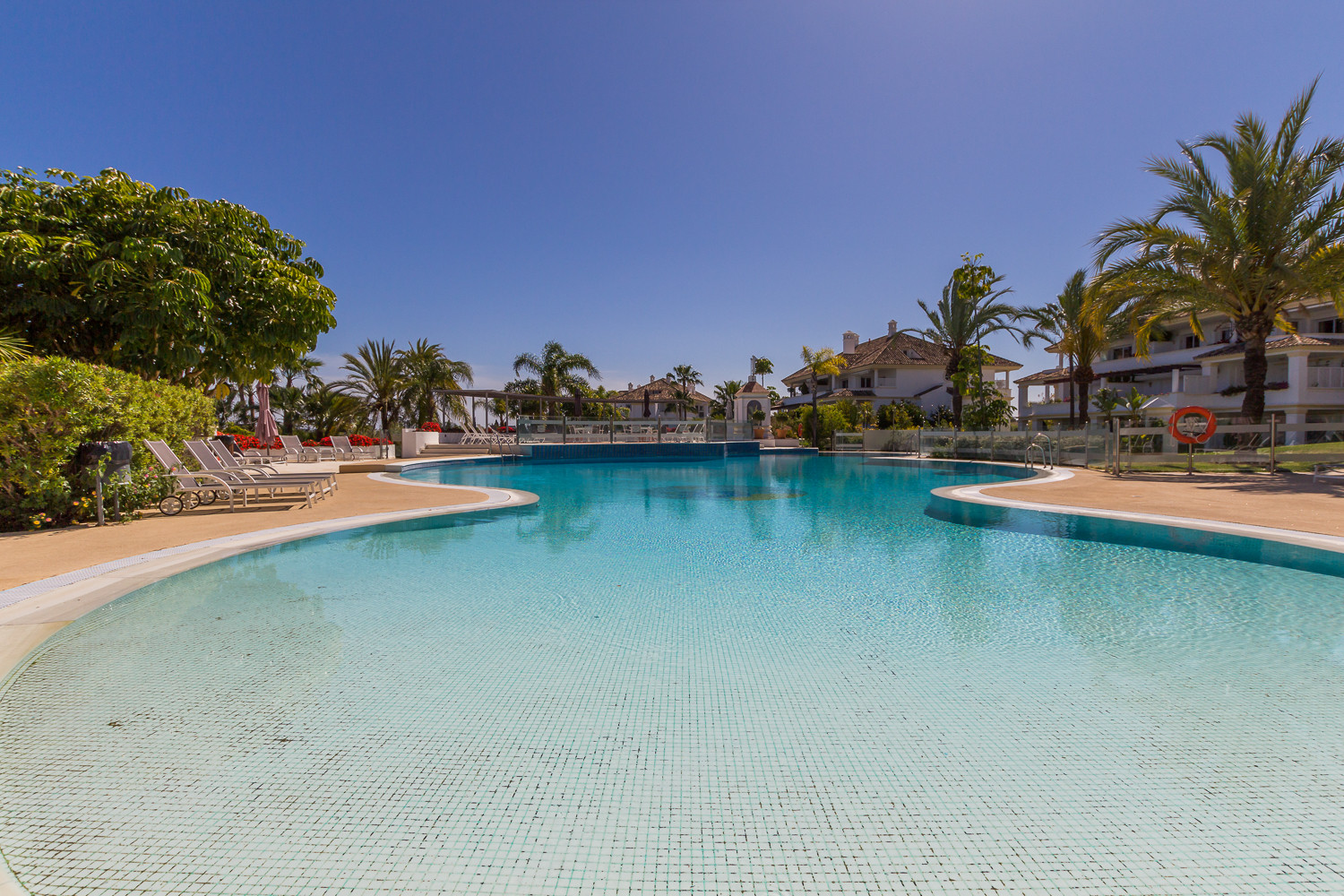 Ubicado en la exclusiva urbanización Monte Paraíso, en la Milla de Oro de Marbella, este impresionante apartamento orientado al sur ofrece la combinación perfecta de lujo, privacidad y comodidad. Situado dentro de una comunidad cerrada con seguridad las 24 horas, los residentes disfrutan de hermosos jardines tropicales, cinco piscinas (incluida una cubierta y climatizada), gimnasio, saunas, pista de squash, área de juegos infantiles y una cafetería de verano. Ahora completamente renovado, el apartamento presenta interiores modernos y refinados con acabados de alta gama, carpintería a medida, electrodomésticos Miele, calefacción por suelo radiante y aire acondicionado por zonas. Su elegante distribución de concepto abierto fluye perfectamente hacia una amplia y soleada terraza y un jardín semi-privado, creando un espacio ideal para relajarse y recibir invitados. Se ofrece completamente amueblado, este excepcional hogar estará listo para entrar a vivir en julio de 2025, a solo unos minutos del Puente Romano, la playa y las mejores comodidades de Marbella.