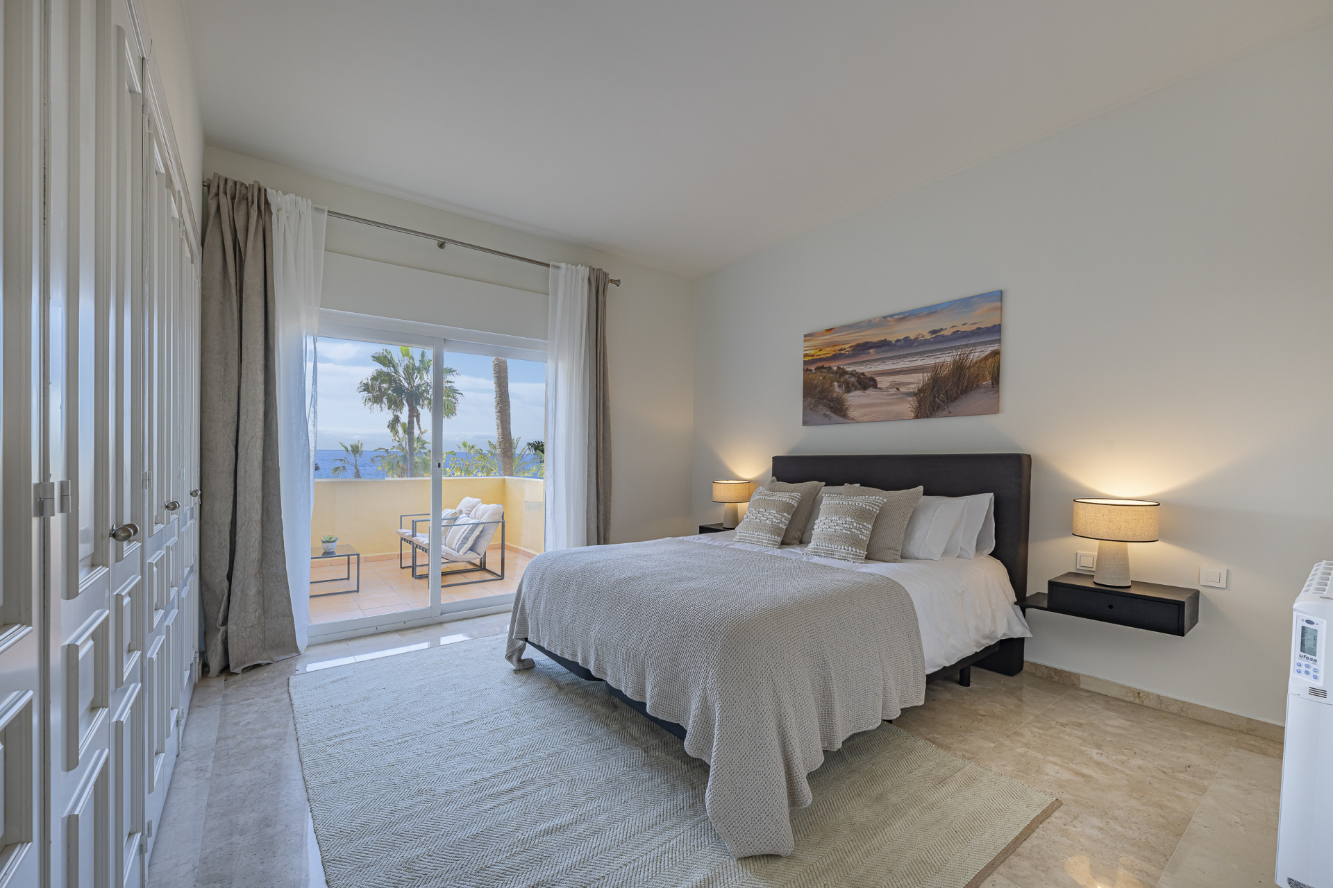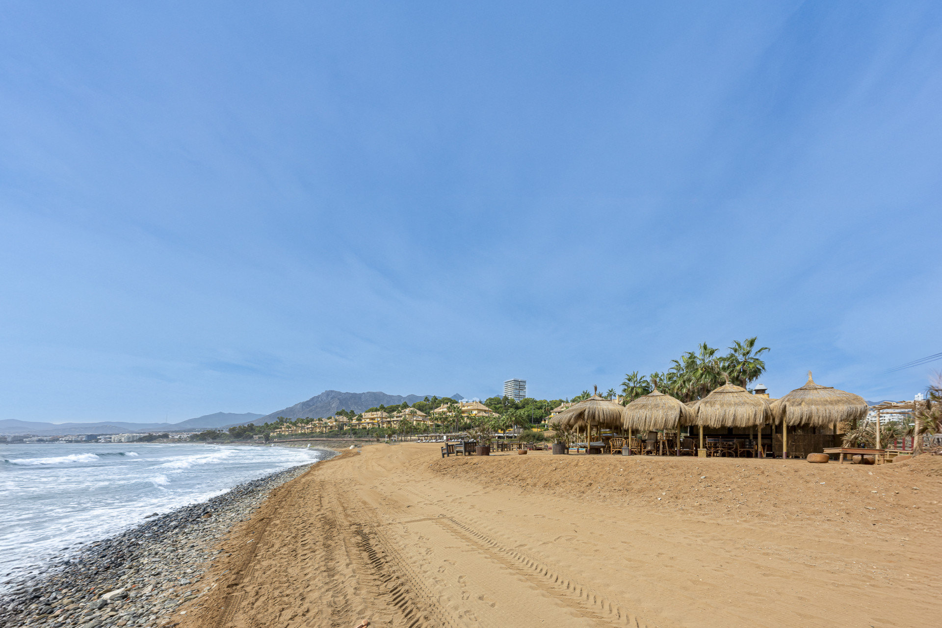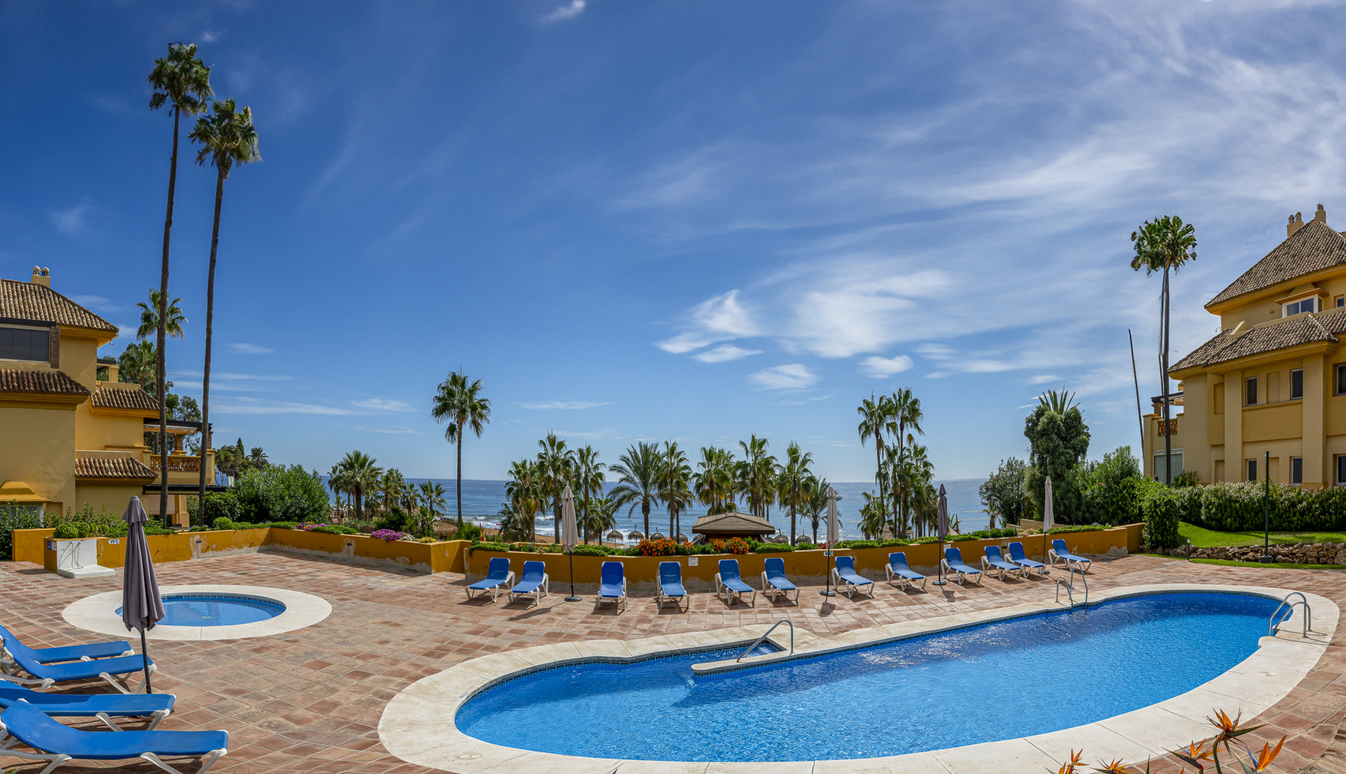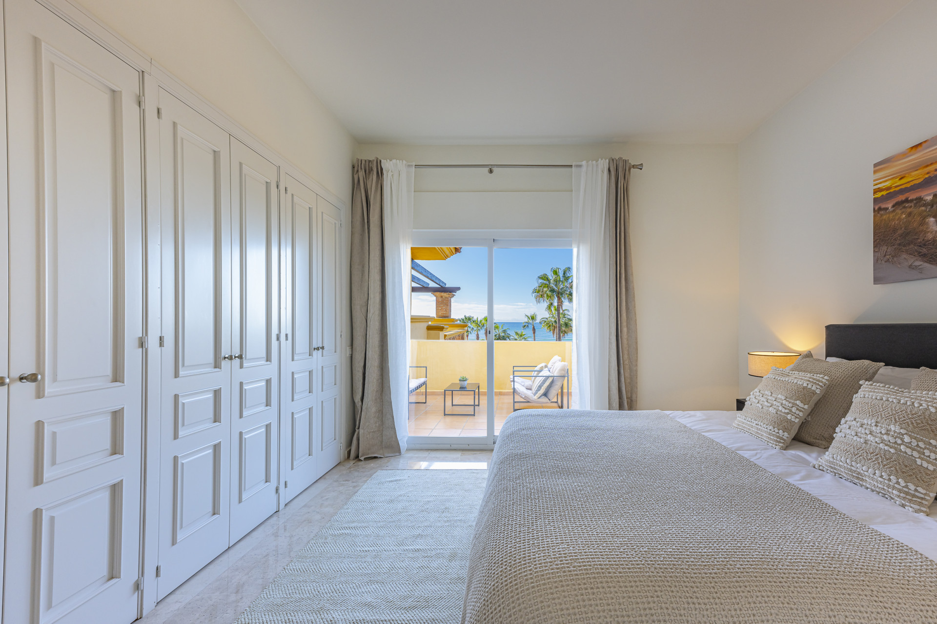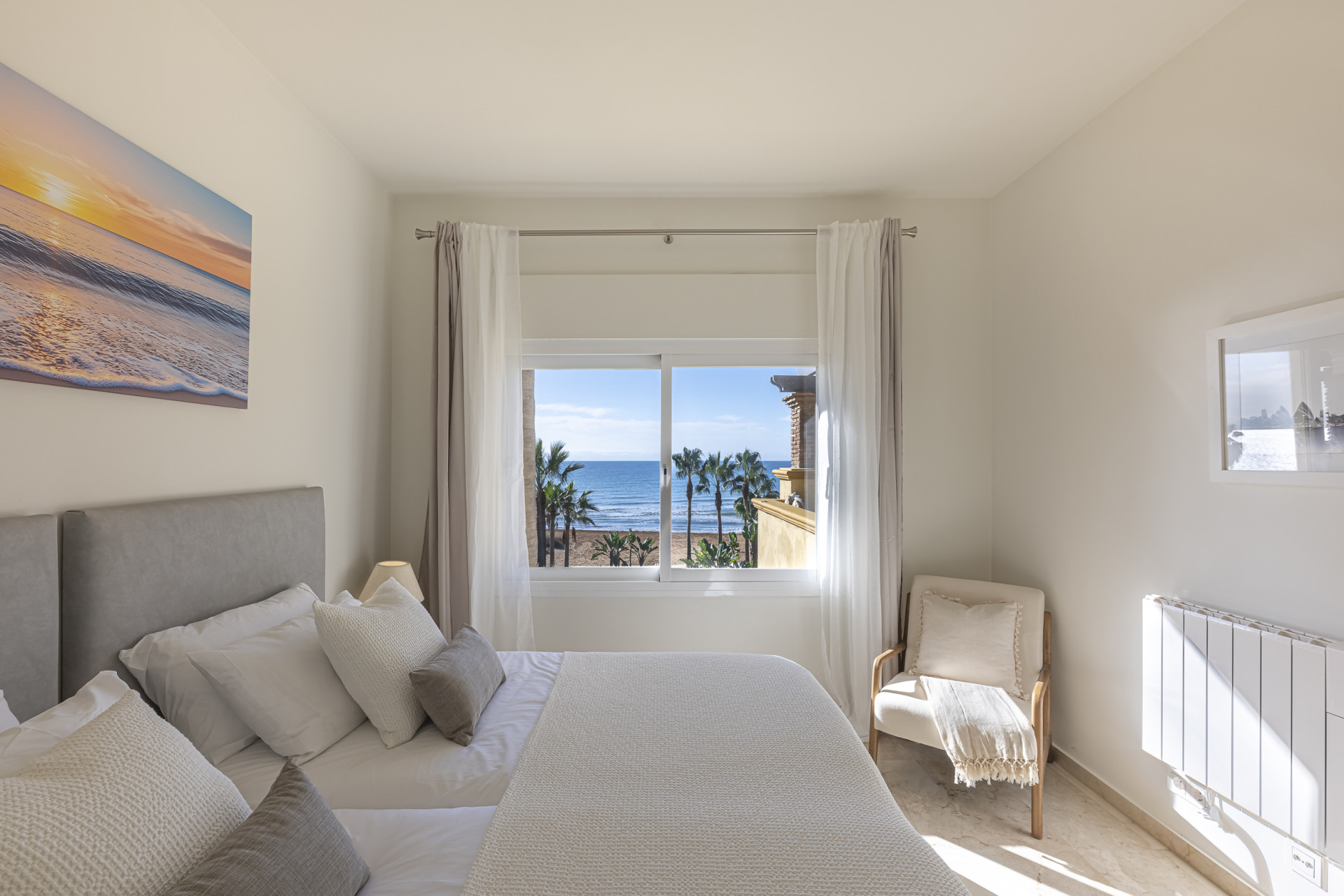 Experimente el mejor estilo de vida frente a la playa en este impresionante apartamento de tres dormitorios situado en Rio Real, Marbella. Con amplias vistas al mar y encanto mediterráneo ambientando la escena. Baño con luz natural, la entrada invitada conduce a una cocina moderna y totalmente equipada y un amplio salón comedor que se abre a una hermosa terraza orientada al sur, ideal para cenar al aire libre y disfrutar de vistas panorámicas. Dos de los dormitorios bien equipados cuentan con vistas directas al mar con baños en suite, mientras que el tercero ofrece su propia terraza privada. Otras comodidades incluyen aparcamiento seguro y dos salas de almacenamiento. El complejo Rio Real Playa mejora su experiencia de vida con exuberantes jardines, dos piscinas comunitarias (una climatizada), y aparcamiento de cortesía para huéspedes, a solo cinco minutos a pie del icónico Trocadero Beach Club y cerca de las exclusivas comodidades del Rio Real Hotel & Golf Club, con el Aeropuerto Internacional de Málaga a solo 30 minutos en coche.
