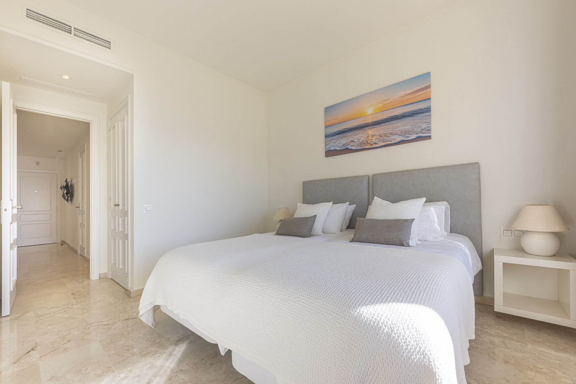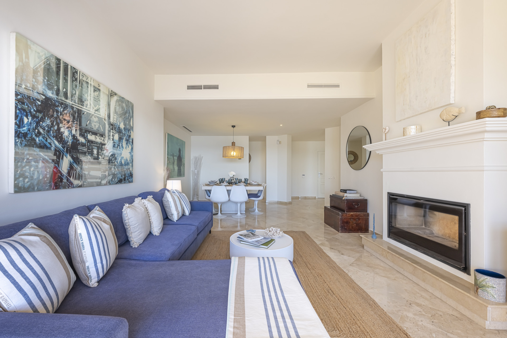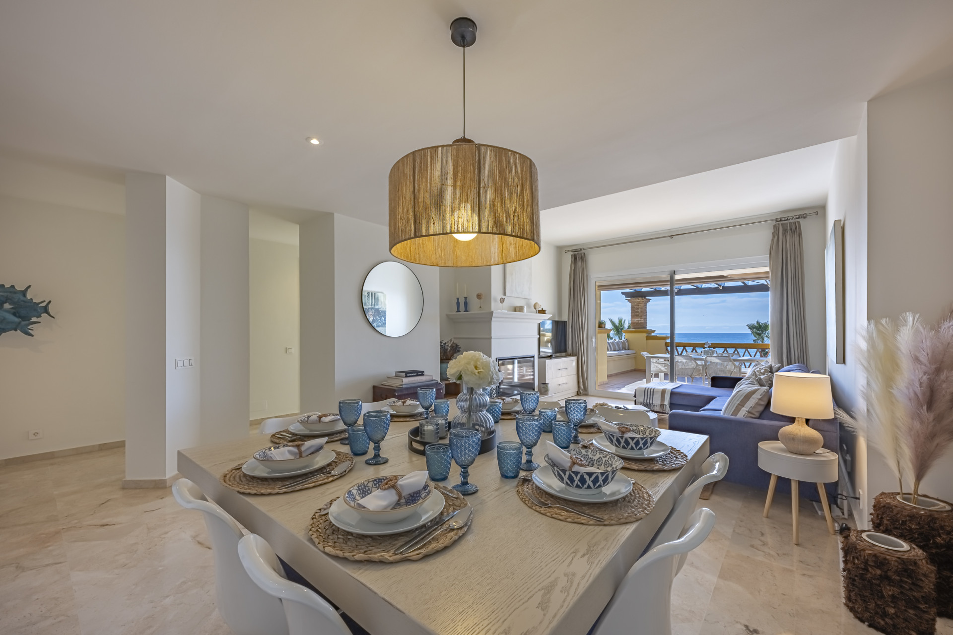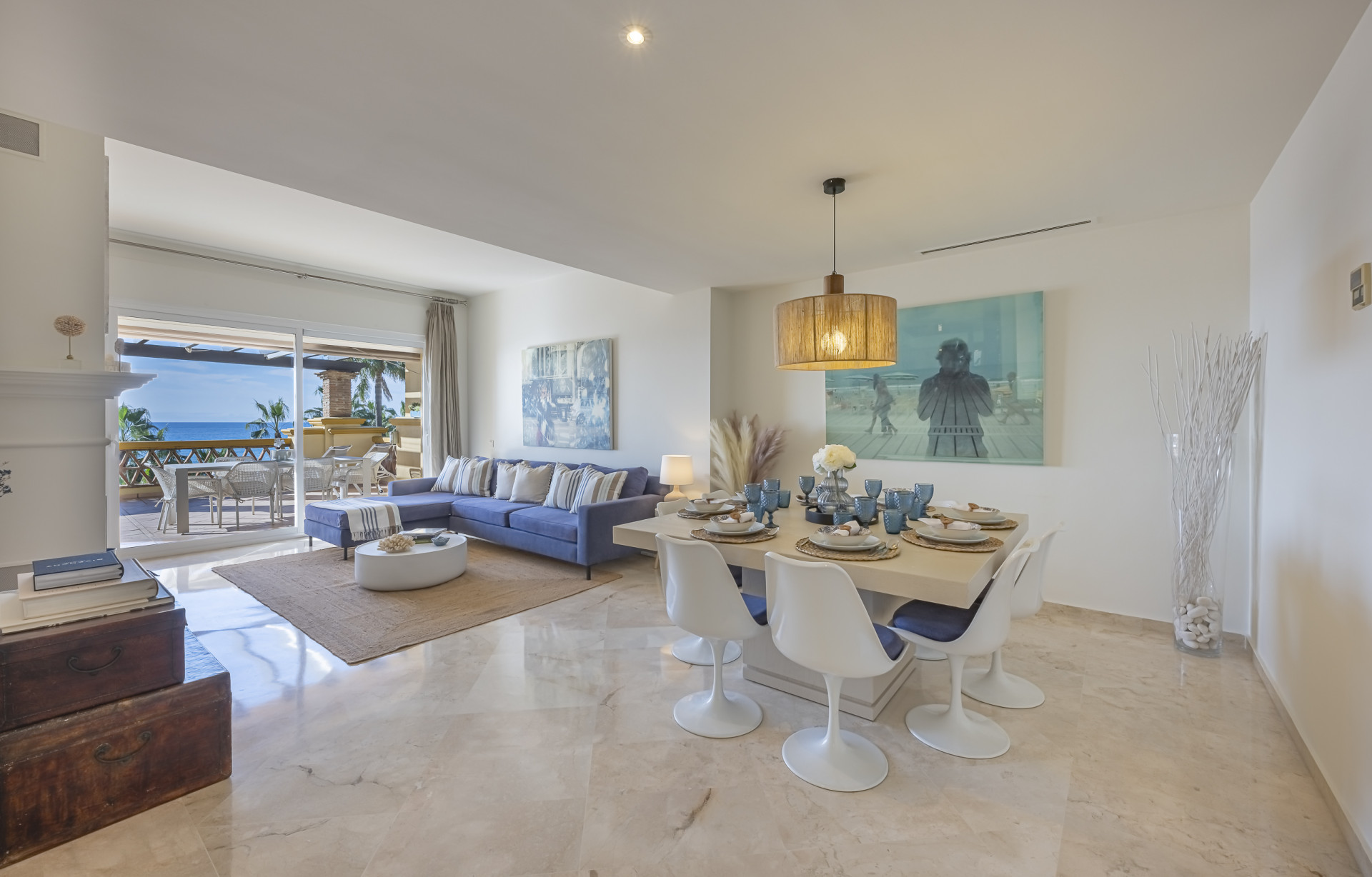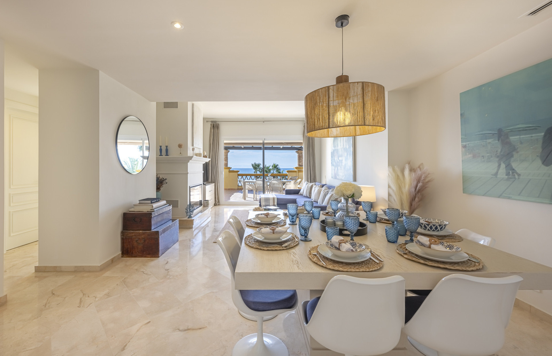 Experimente el mejor estilo de vida frente a la playa en este impresionante apartamento de tres dormitorios situado en Rio Real, Marbella. Con amplias vistas al mar y encanto mediterráneo ambientando la escena. Baño con luz natural, la entrada invitada conduce a una cocina moderna y totalmente equipada y un amplio salón comedor que se abre a una hermosa terraza orientada al sur, ideal para cenar al aire libre y disfrutar de vistas panorámicas. Dos de los dormitorios bien equipados cuentan con vistas directas al mar con baños en suite, mientras que el tercero ofrece su propia terraza privada. Otras comodidades incluyen aparcamiento seguro y dos salas de almacenamiento. El complejo Rio Real Playa mejora su experiencia de vida con exuberantes jardines, dos piscinas comunitarias (una climatizada), y aparcamiento de cortesía para huéspedes, a solo cinco minutos a pie del icónico Trocadero Beach Club y cerca de las exclusivas comodidades del Rio Real Hotel & Golf Club, con el Aeropuerto Internacional de Málaga a solo 30 minutos en coche.