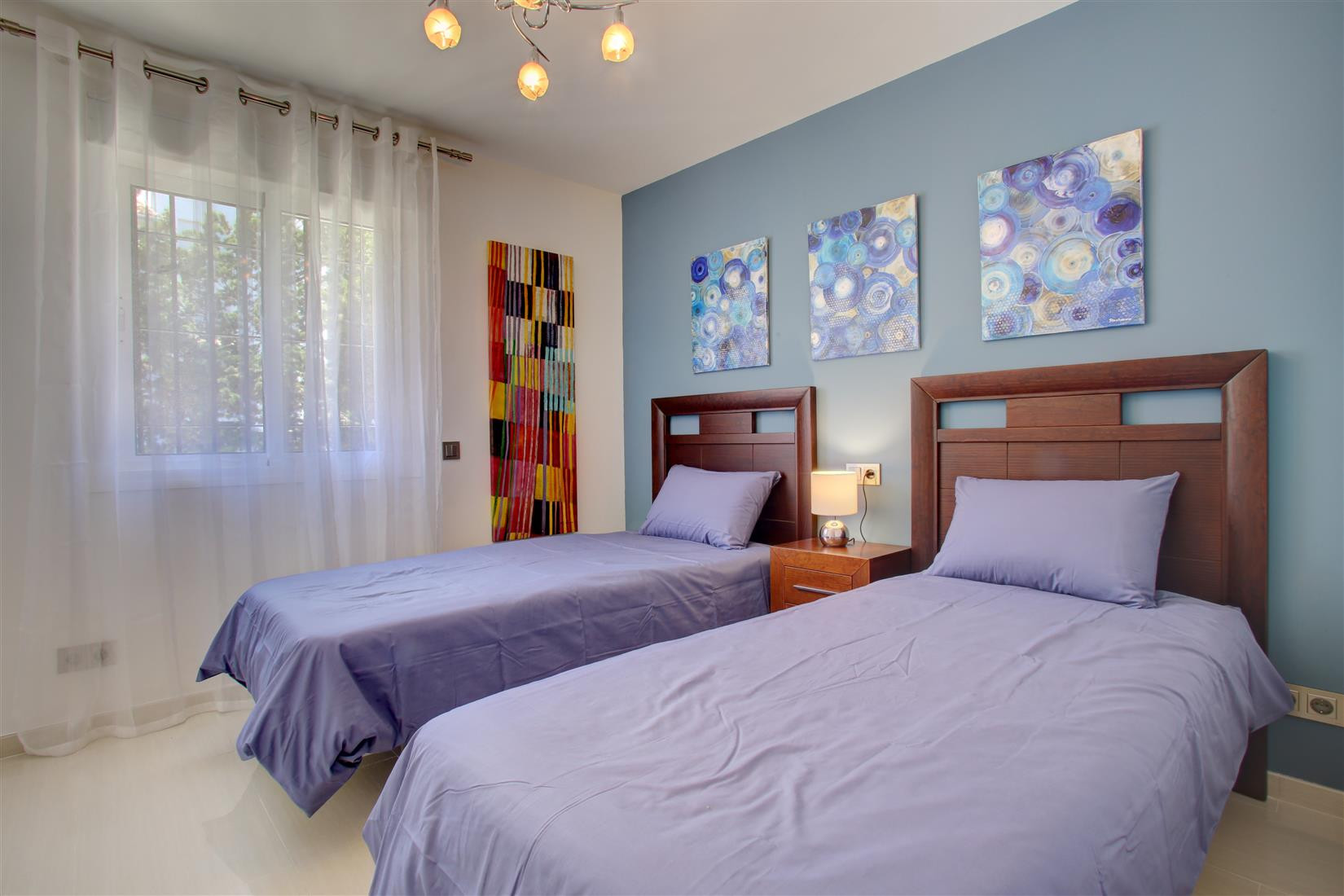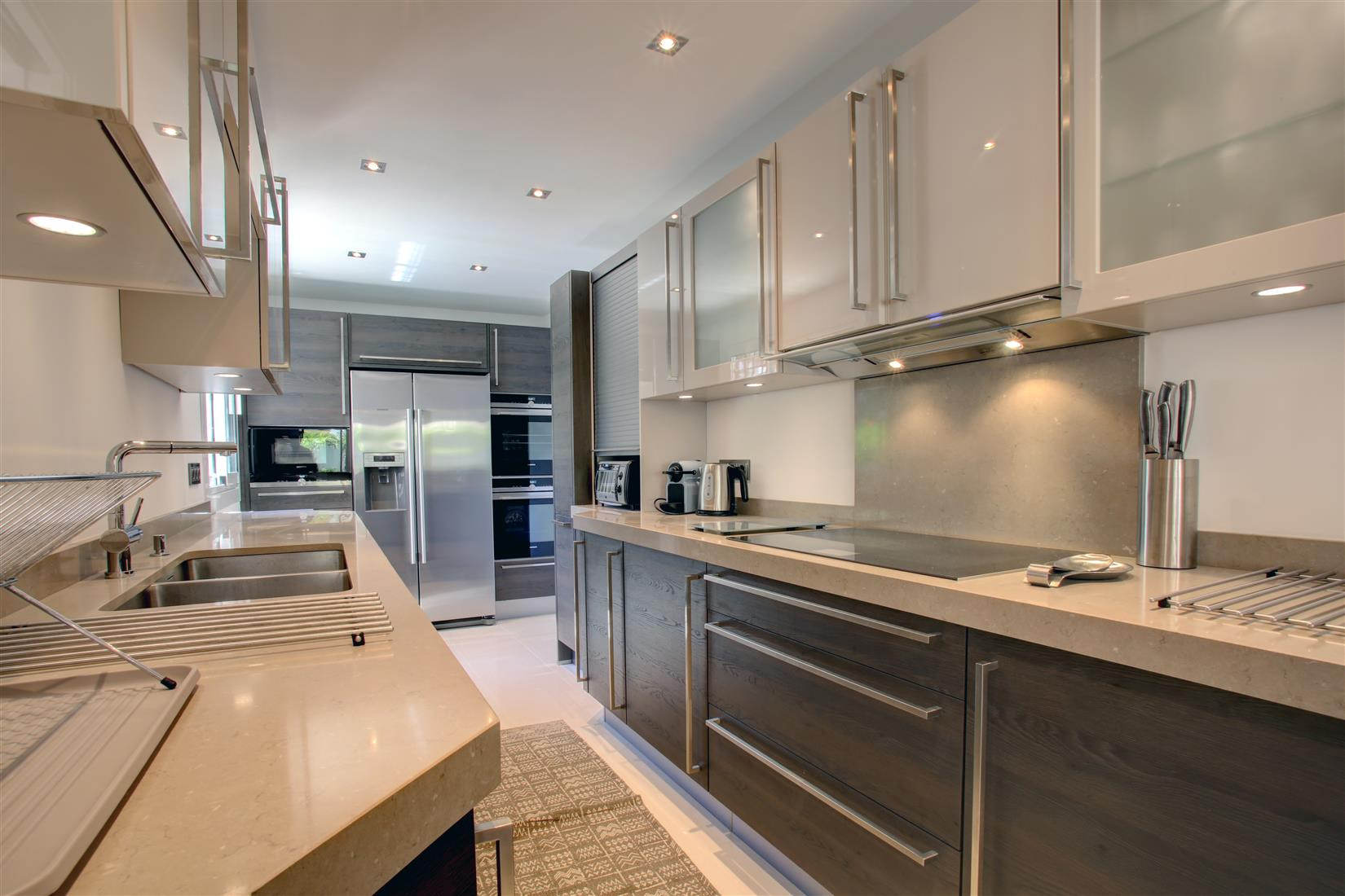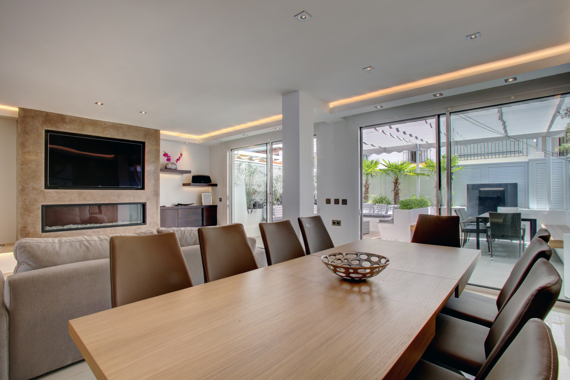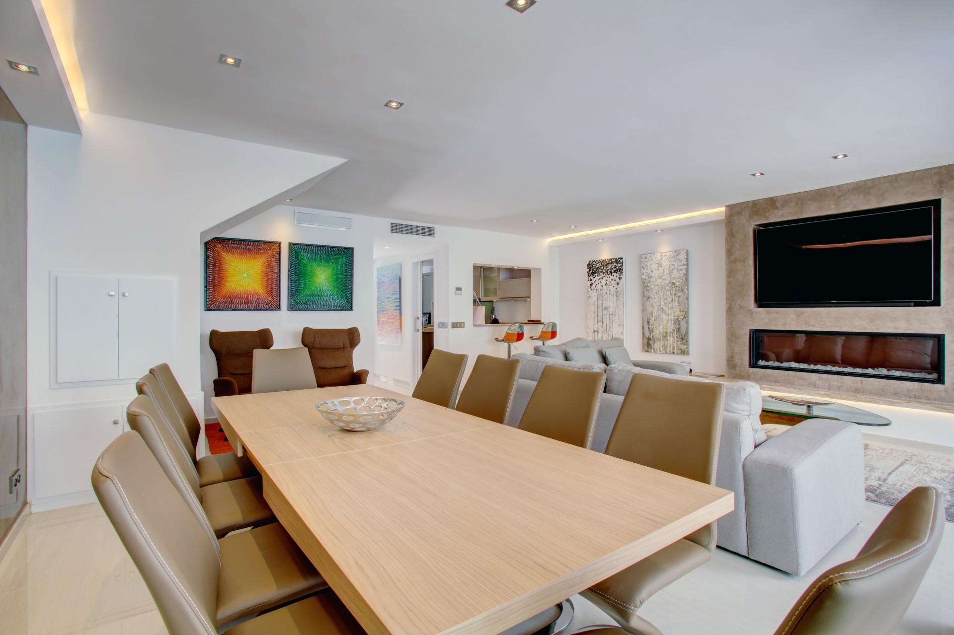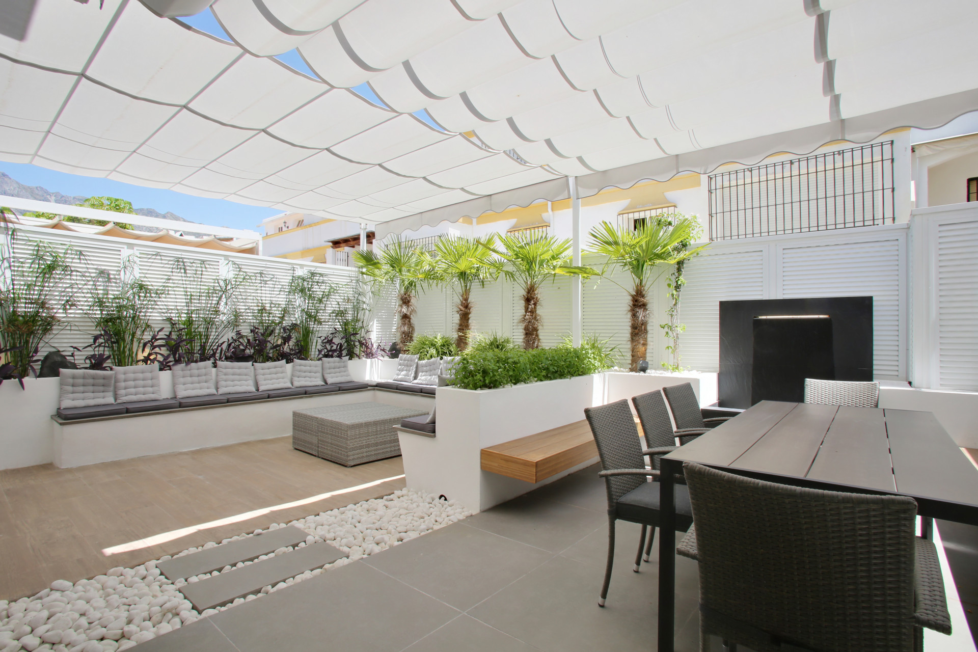 La propiedad acaba de ser completamente renovada por sus nuevos propietarios y el alojamiento es cómodo y lujoso. Hay una cocina magníficamente equipada con todas las instalaciones posibles, incluso hasta una máquina de café Nespresso. El salón y el comedor separado son cómodos y elegantes, con puertas francesas que conducen a una terraza privada orientada al este con una elegante zona de estar, fuente de agua y mesa y sillas de comedor al aire libre. También hay un sistema de sonido exterior de alta calidad al que puede vincular su dispositivo. La terraza se puede cubrir si se requiere sombra. También en la planta baja hay un aseo de invitados. Fuera de la cocina hay un patio separado con área de servicio para lavar y secar y más área de almacenamiento.