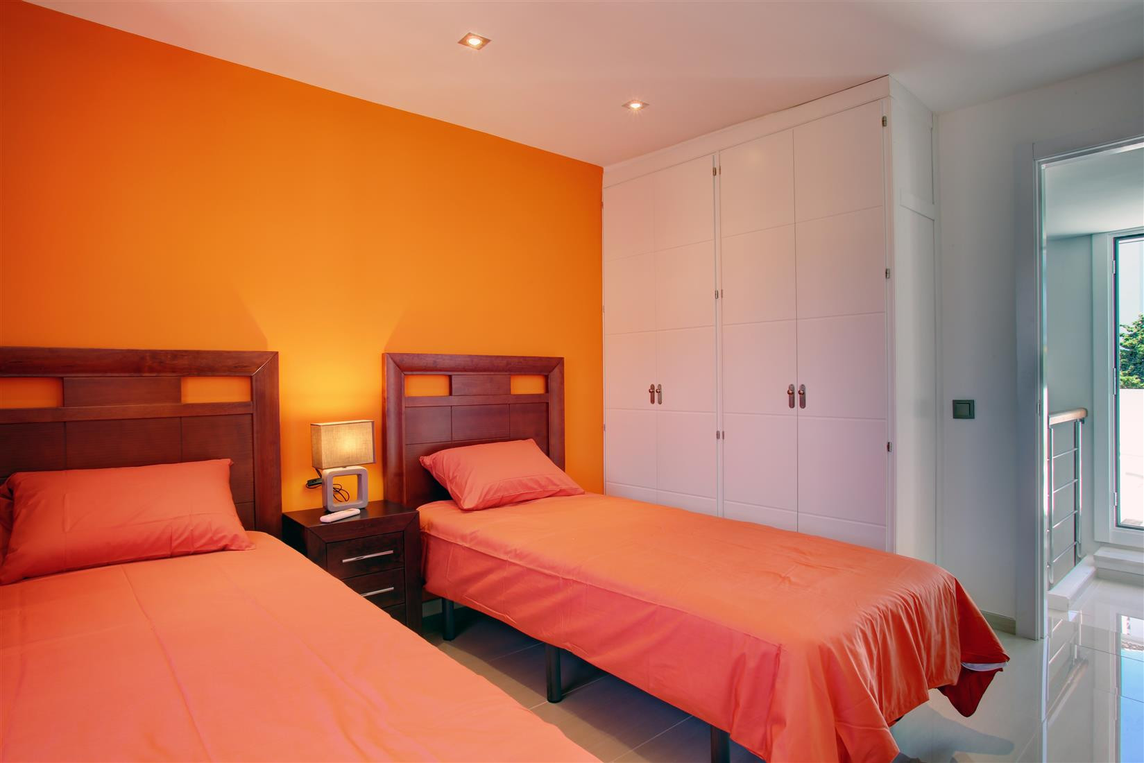 En la parte superior hay dos habitaciones adicionales con baño, una con dos camas individuales y la otra con una cama tamaño Queen. Ambos han sido amueblados con la más alta calidad, con muebles y muebles nuevos. También hay una terraza para tomar el sol en esta planta con hamacas nuevas y una sombrilla si es necesario. Se puede acceder a la terraza en el rellano o en la habitación doble.