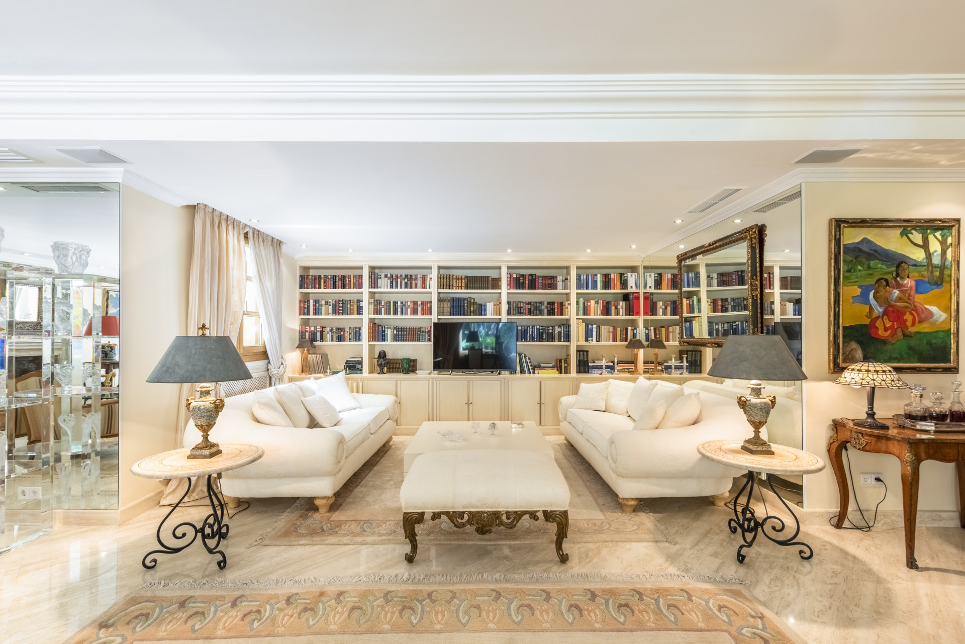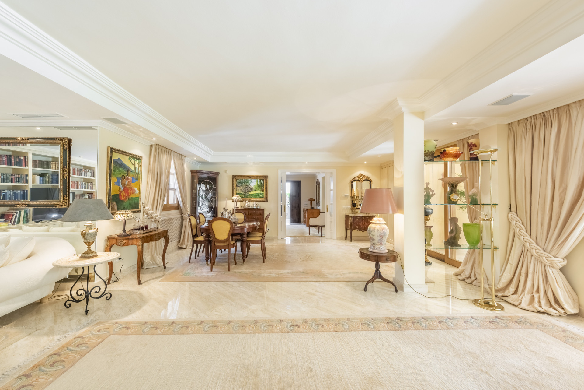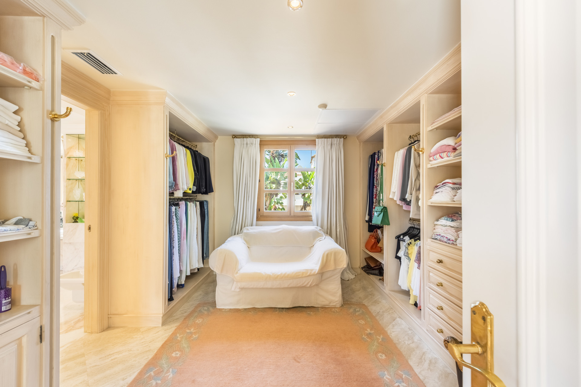 Villa clásica de cinco dormitorios, orientada al suroeste, en medio de la exuberante vegetación de los campos de golf más importantes de Nueva Andalucía. Situado a pocos minutos de los famosos restaurantes de Aloha, bares vibrantes, icónico Puerto Banús y playas. Entra en una entrada expansiva con suelos de mármol y una gran escalera, estableciendo el tono para la elegancia refinada. El nivel principal muestra un impresionante diseño de planta abierta, mezclando perfectamente los espacios de vida, comedor y entretenimiento formal acentuado por una chimenea acogedora. Ventanas de piso a techo con vistas al jardín meticuloso y una piscina acogedora del amplio porche cubierto con un bar y zona de comedor. Una cocina gourmet con una cómoda sala de estar, reuniones y delicias culinarias, mientras que una entrada independiente conduce a las instalaciones de lavandería, oficina y una suite de invitados con baño. En la segunda planta, consta de tres amplios y luminosos dormitorios, incluyendo la gran suite principal con baño en suite y walk-in closet. Cada dormitorio cuenta con un balcón generoso con toldos retráctil, invitando a los residentes a disfrutar del estilo de vida interior y admirar las puestas de sol de Marbella. El nivel inferior ofrece una gran cantidad de potencial con una zona multiusos, sauna, baño, amplios espacios de almacenamiento y cuartos de personal. Esta planta es el lienzo perfecto para instalaciones de entretenimiento y bienestar a medida, como gimnasio, cine o sala de juegos. La villa es un refugio para familias, gracias a su proximidad a las principales instituciones educativas. Situado al alcance de las escuelas estimadas, es la residencia ideal para aquellos que priorizan la educación para sus hijos.