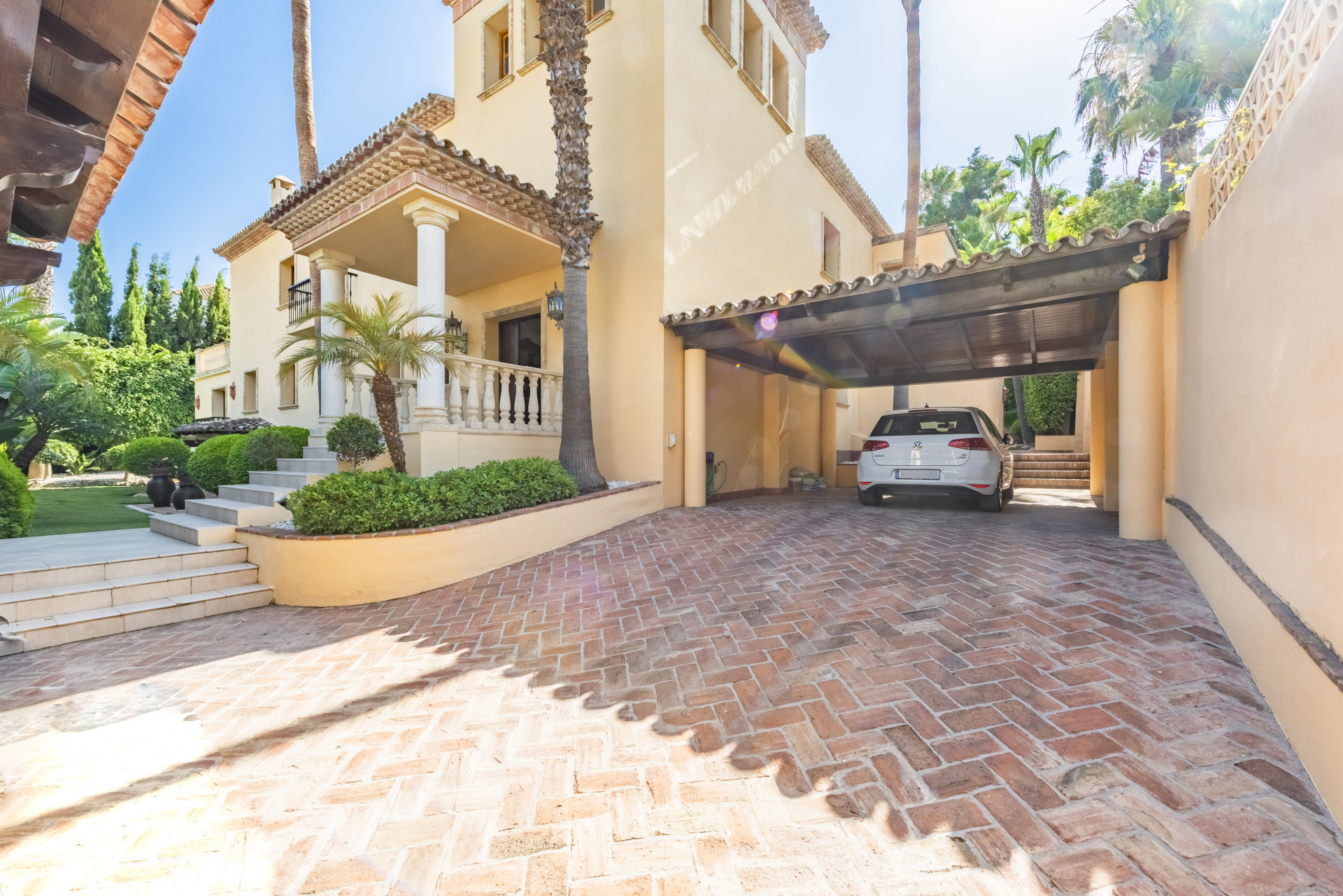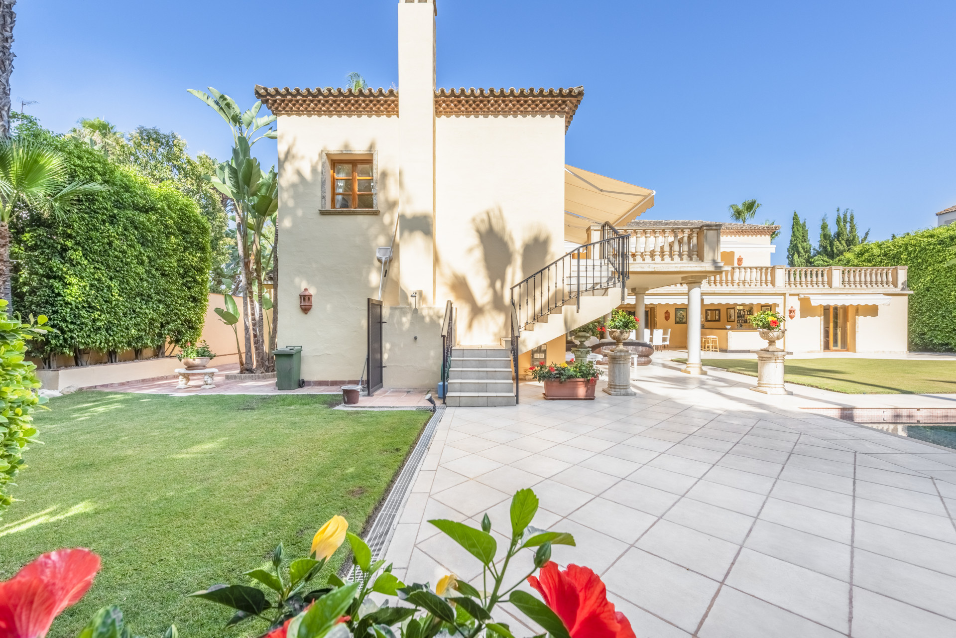 Villa clásica de cinco dormitorios, orientada al suroeste, en medio de la exuberante vegetación de los campos de golf más importantes de Nueva Andalucía.