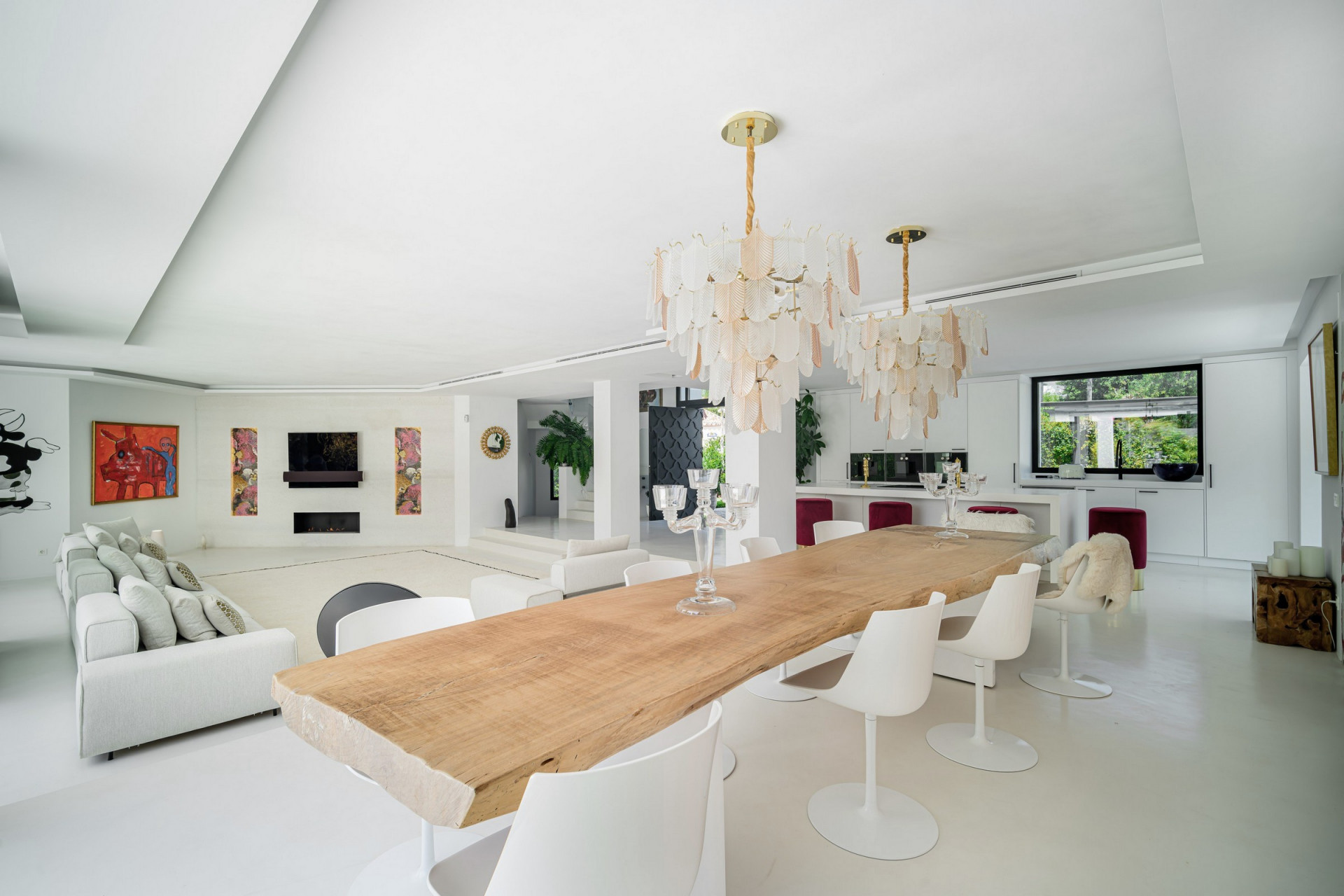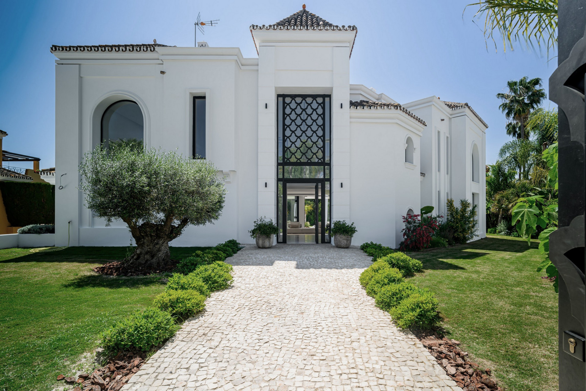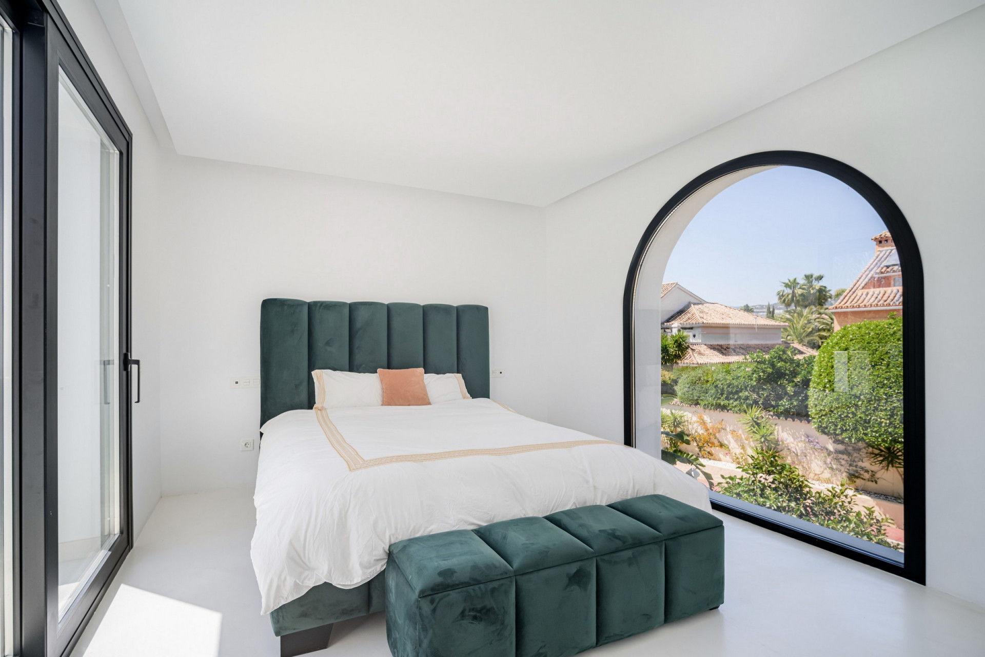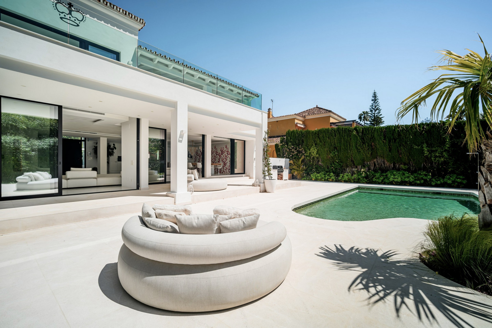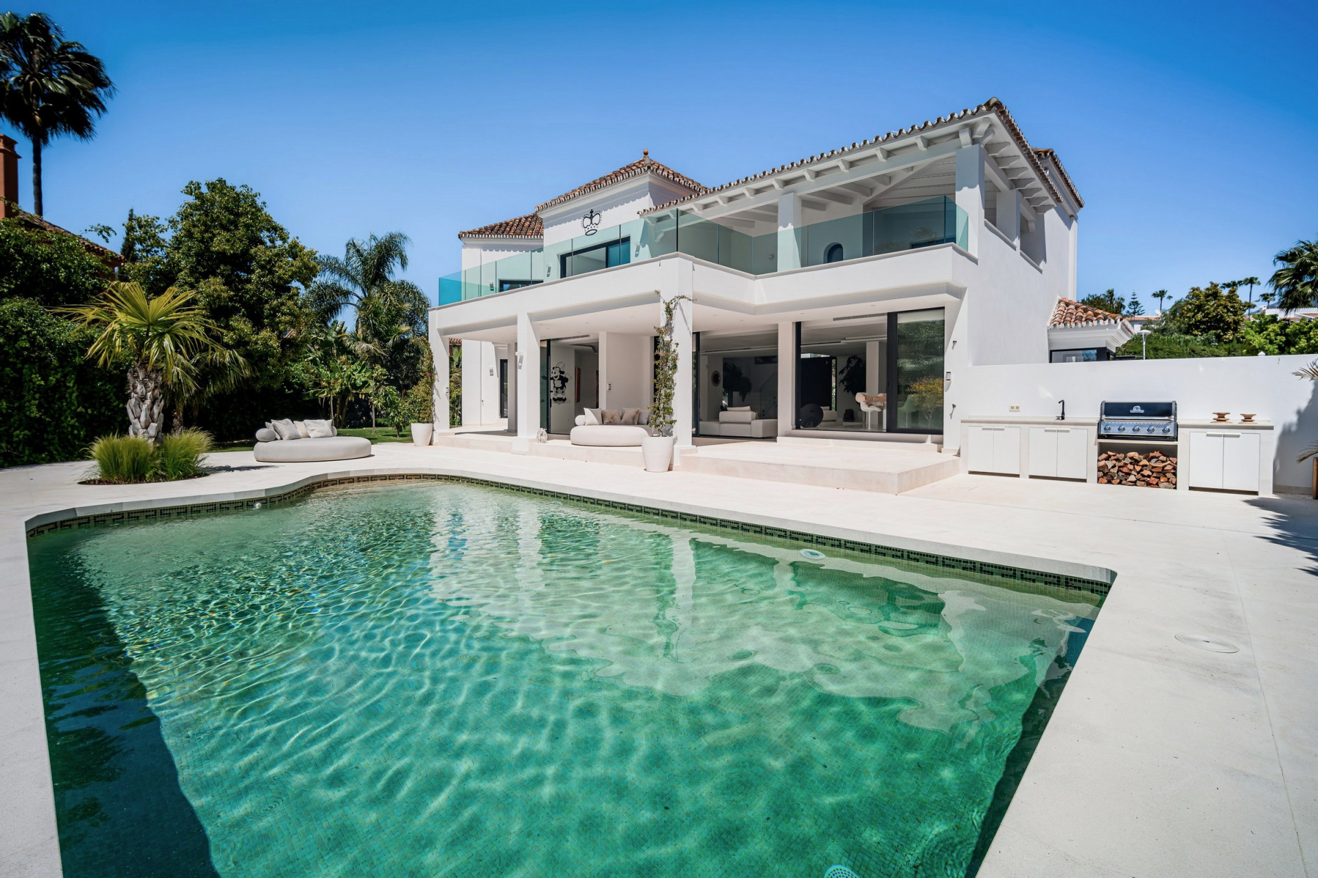 Totalmente reformado de cuatro dormitorios, villa orientada al sur en la comunidad cerrada de Parcelas del Golf, esta lujosa casa está enclavada justo en el corazón la ubicación más exclusiva, con el 3 famoso campo de golf de Las Brisas, Los Naranjos y Aloha dentro de un corto paseo en buggy, así como estar cerca de todas las comodidades de ocio. Construido en una parcela de esquina dentro de la comunidad, la primera impresión de esta casa es el maravilloso detalle arabesco adornando las puertas delanteras y la ventana de doble altura que se coloca en la fachada frontal de la villa, con acceso al carport a través de puertas automatizadas. Una cocina abierta muy funcional pero muy elegante ha sido diseñada empleando lo mejor en electrodomésticos con maravillosa atención al detalle. Desde aquí se pasa por alto el gran comedor elevado, que conduce a la zona de salón de nivel inferior. Integrablemente, esta residencia de plan abierto es perfecta para que una familia disfrute o para las mejores reuniones y fiestas sociales. En la planta baja hay un dormitorio completo con baño en suite, que incorpora un pasillo equipado con elegantes armarios de madera; y acceso directo al jardín. Arriba encontramos otros tres dormitorios. La suite principal es, por supuesto, la más impresionante, accediendo al impresionante balcón cubierto que abarca la anchura de esta villa. Además hay un potencial maravilloso y sin explotar con la parte cubierta de esta terraza. Situado con auténtico techo de madera, la zona podría ser designada para relajarse, gimnasio al aire libre o cualquier otro uso. En el exterior, descubra su oasis privado con una gran piscina de agua salada, salón hundido y una acogedora chimenea, ideal para relajarse tardes o elegantes reuniones nocturnas. Los exuberantes jardines y la zona privada de barbacoa transforman la vida al aire libre en un estilo de vida, no sólo una opción. Esta villa está inmaculadamente diseñada y terminada artísticamente, con excelentes opciones de color que complementan el paladar de otro modo neutral. Sin embargo, como uno esperaría con cualquier hogar de lujo, la infraestructura oculta que hace de esta propiedad una gran oportunidad no ha sido delineada. Los paneles solares proporcionan energía sustancial, proporcionando eficiencia para el aire acondicionado independiente en cada habitación, incluyendo el sótano. Dentro del nivel del sótano se encuentra el espacio reformado con instalaciones de electricidad y agua, listo para ser transformado en un dormitorio más, o una sala de cine, gimnasio, spa. Siente la calidez debajo de tus pies con calefacción por suelo radiante en toda la villa. La seguridad es primordial, con un guardia de 24 horas y vigilancia avanzada que garantiza la paz mental en esta exclusiva comunidad cerrada. Propiedad totalmente reformada con doble drenaje y sistema de bombeo para proteger la villa contra la lluvia pesada o el exceso de agua. El agua de lluvia se bombea de los drenajes hasta el jardín para ser reciclado.