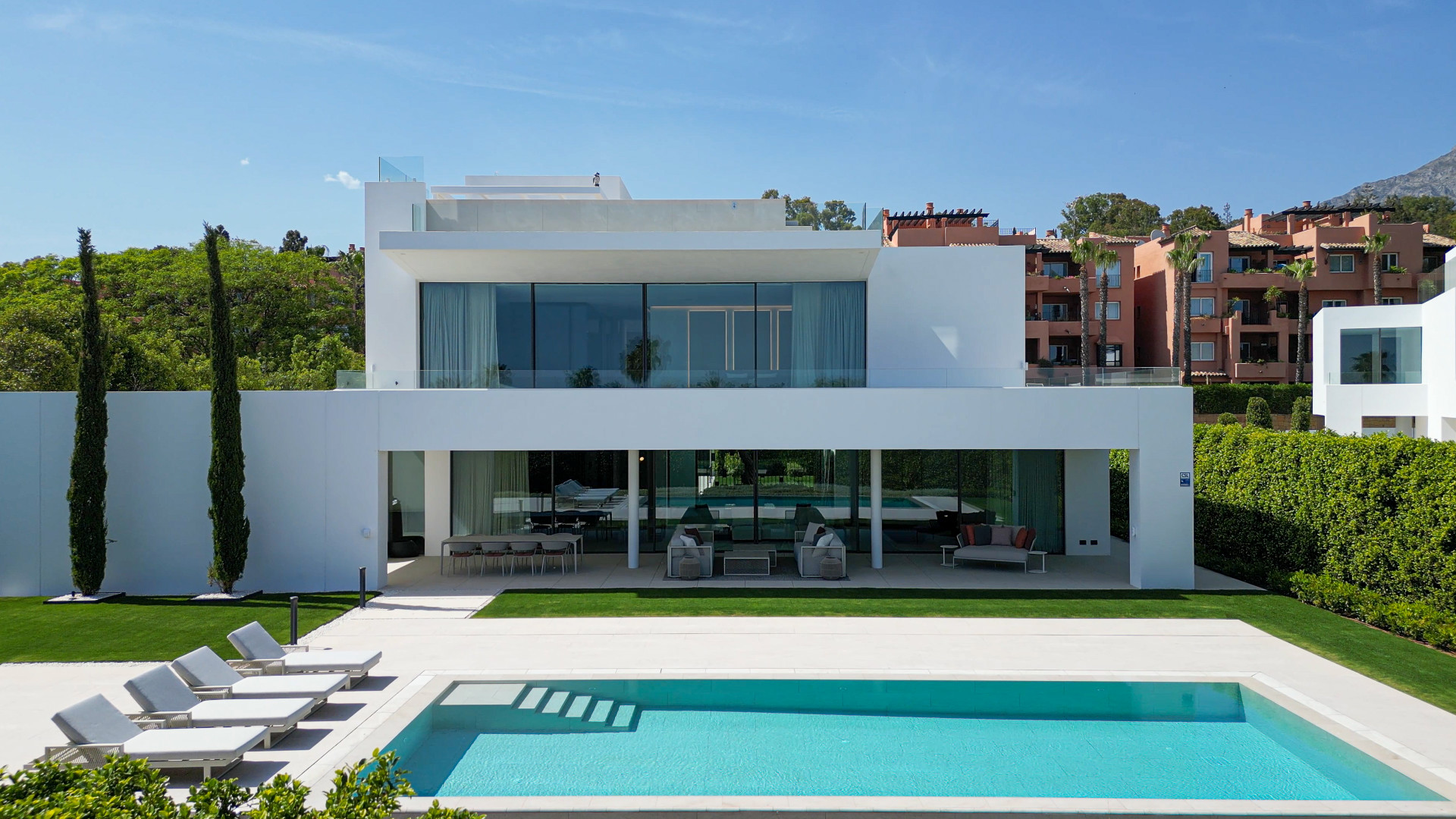 La villa está pensada para acomodar cinco amplios dormitorios, cada uno equipado con su propio baño en suite. Esto garantiza una amplia privacidad y comodidad para los residentes e invitados por igual. La integración perfecta de espacios interiores y exteriores es una característica destacada, con la villa que ofrece abundantes oportunidades para disfrutar del clima excepcional durante todo el año de Marbella. Los interiores fluyen sin esfuerzo a las amplias terrazas, creando un escenario ideal tanto para reuniones familiares íntimas como para eventos sociales más grandes.