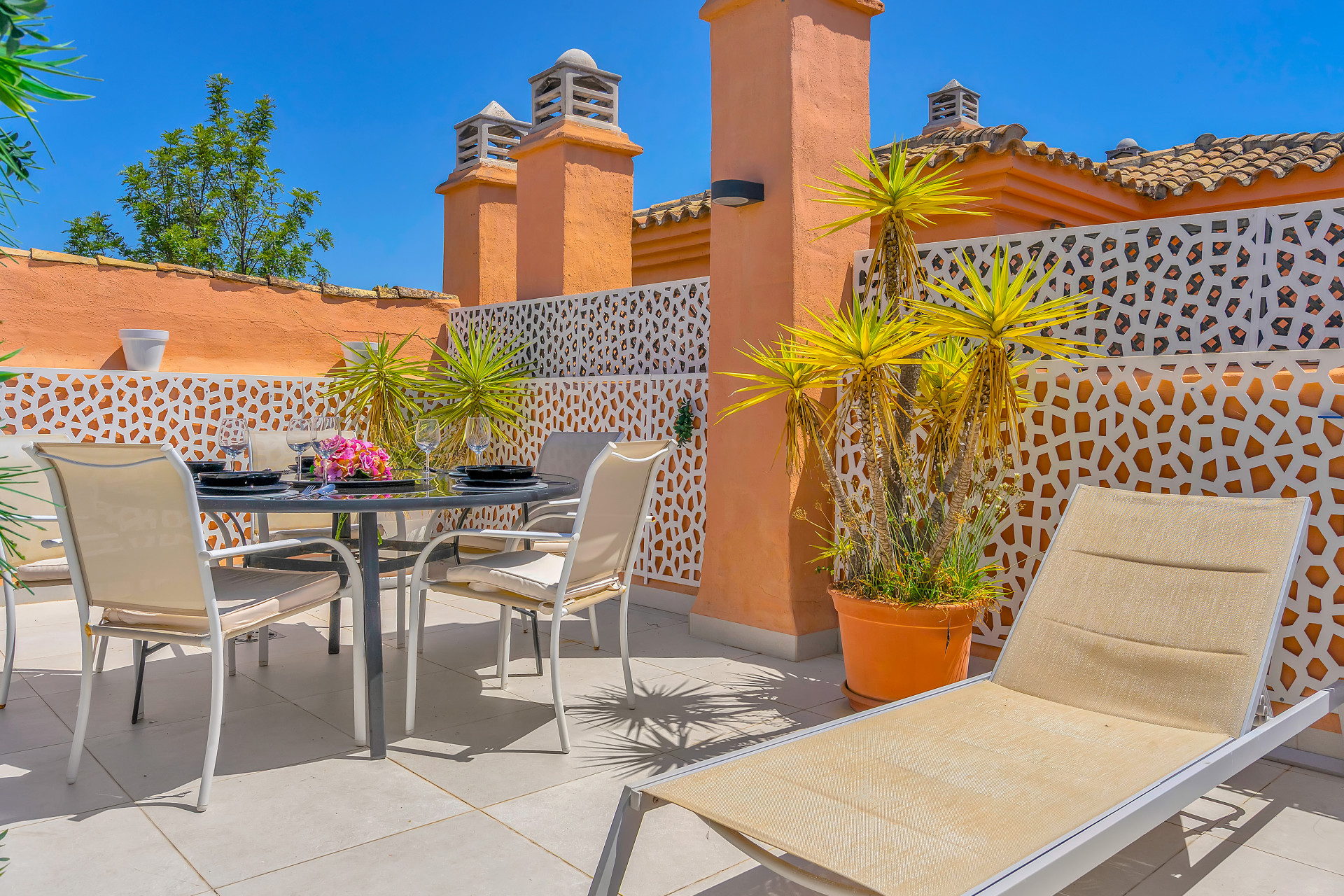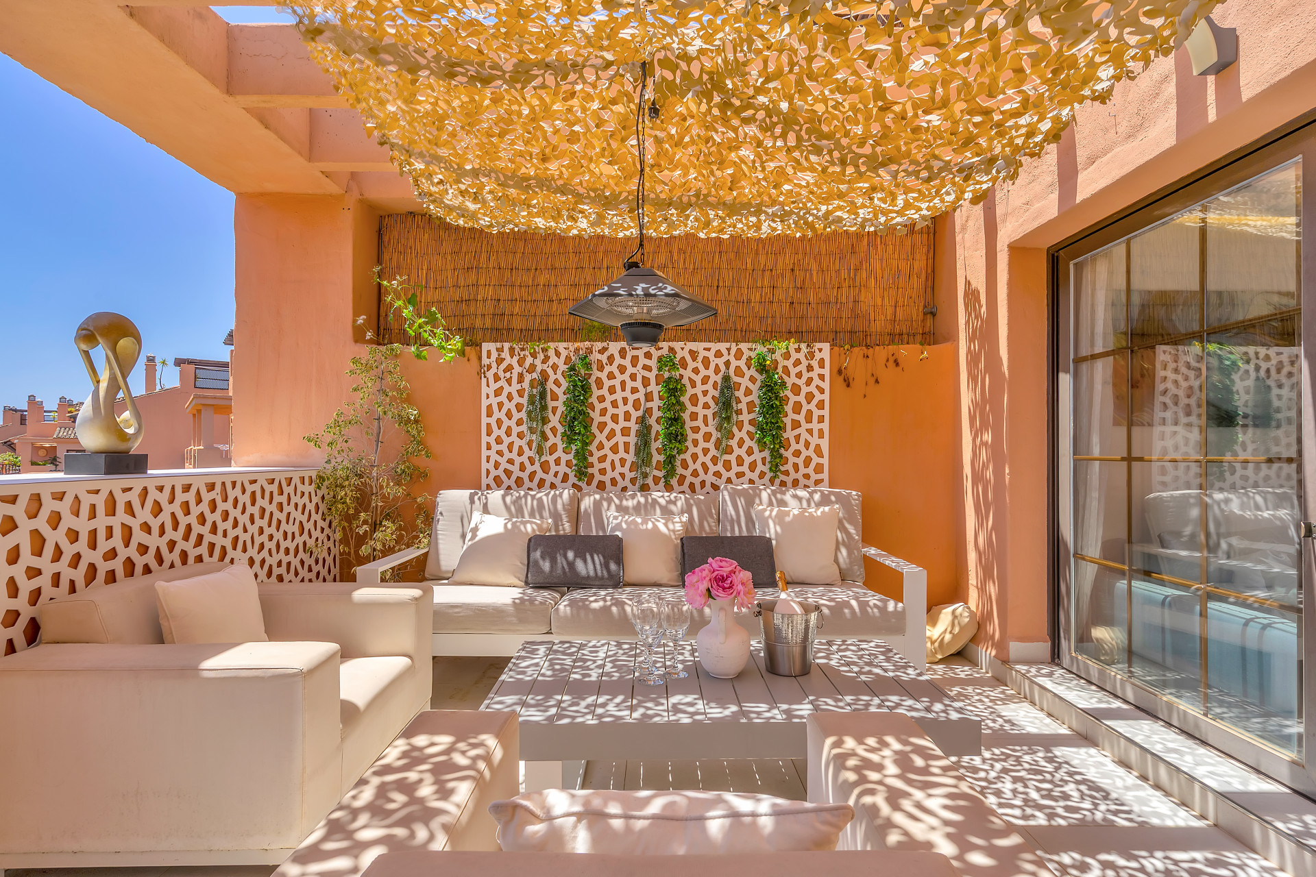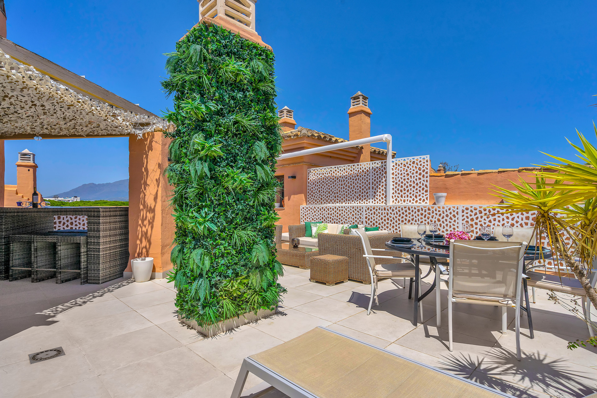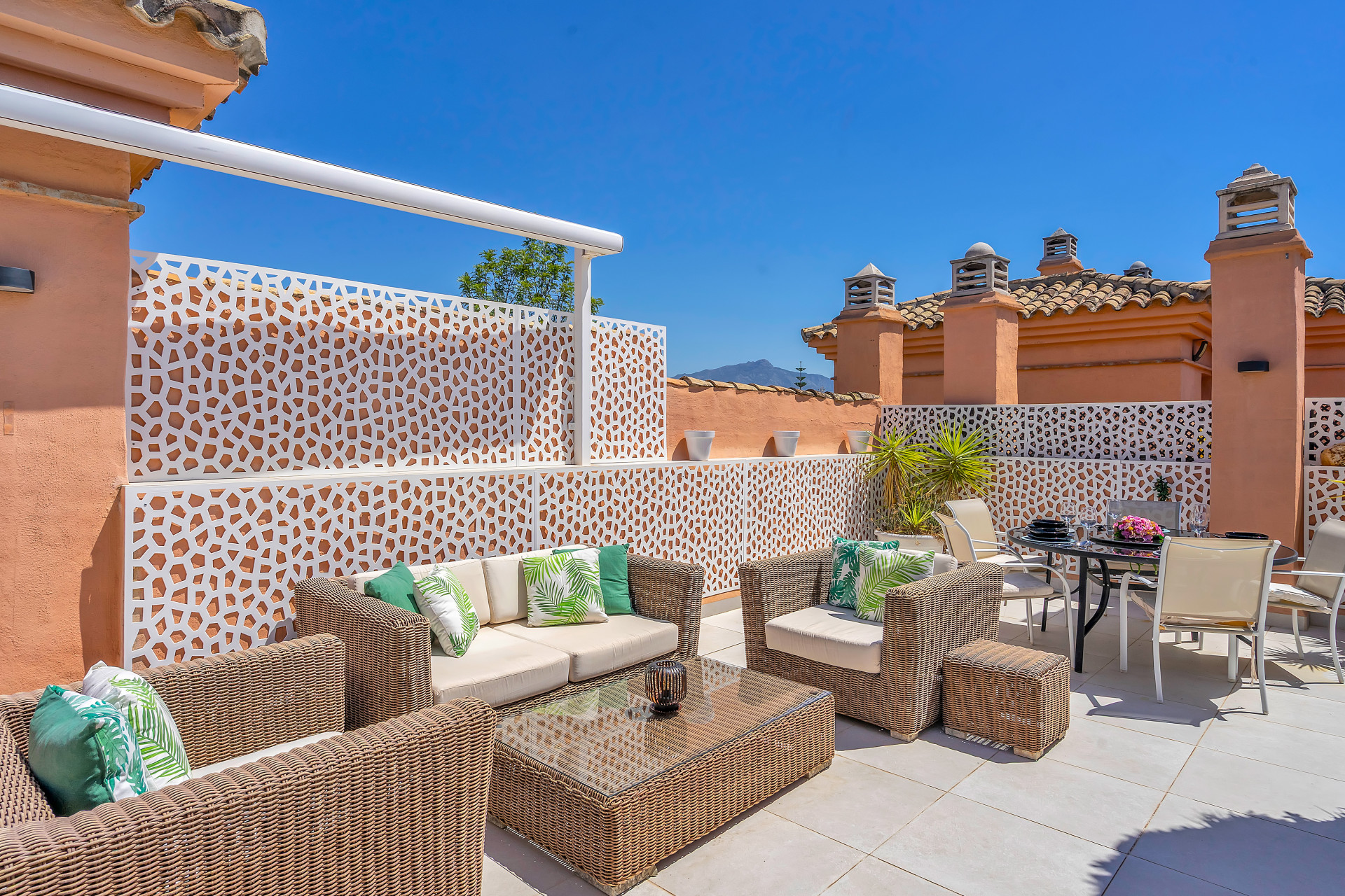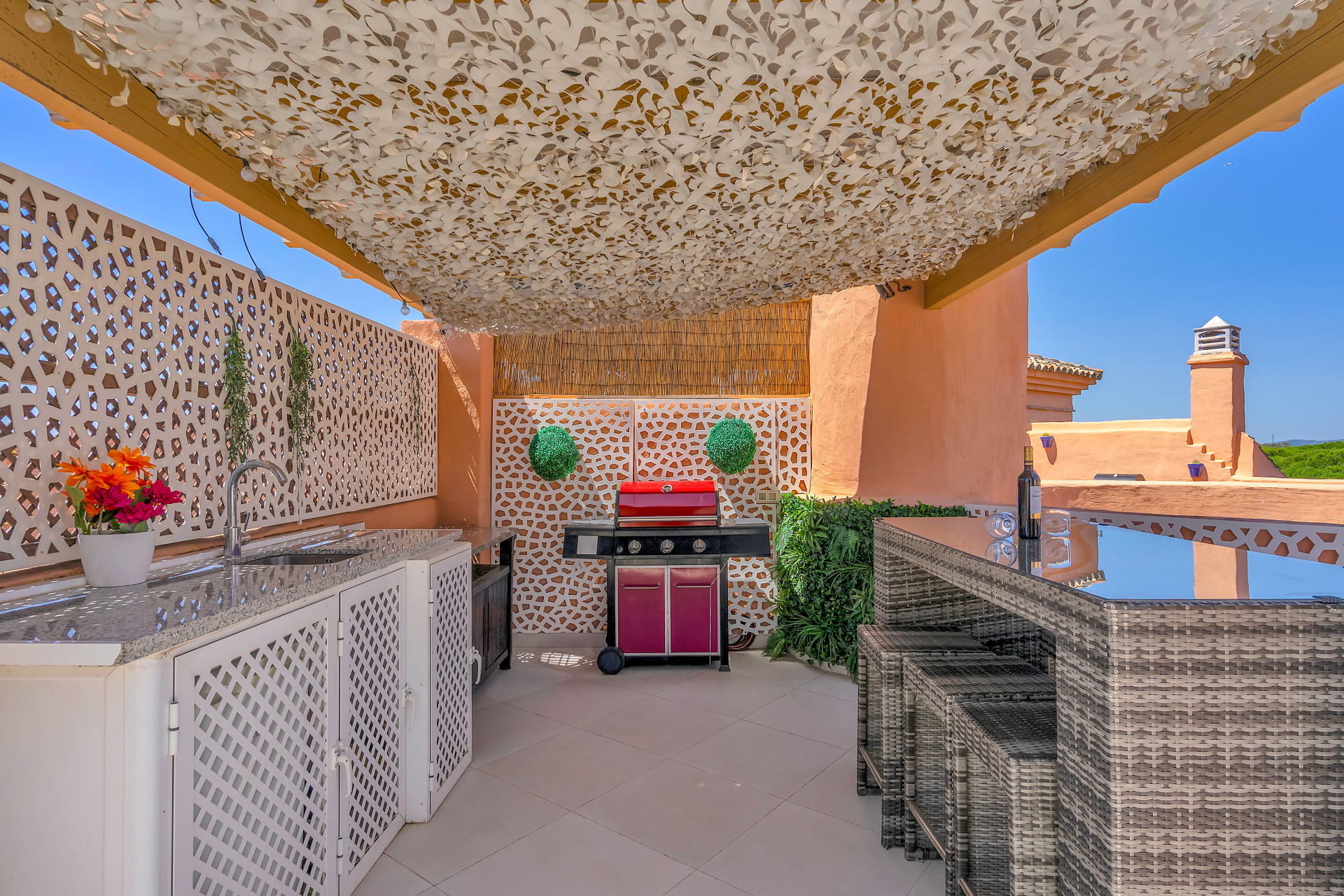A standout feature of this property is the expansive roof terrace, thoughtfully designed with a barbeque, dining area, and seating spaces—perfect for spending the days sunbathing or unwinding during warm summers evenings.