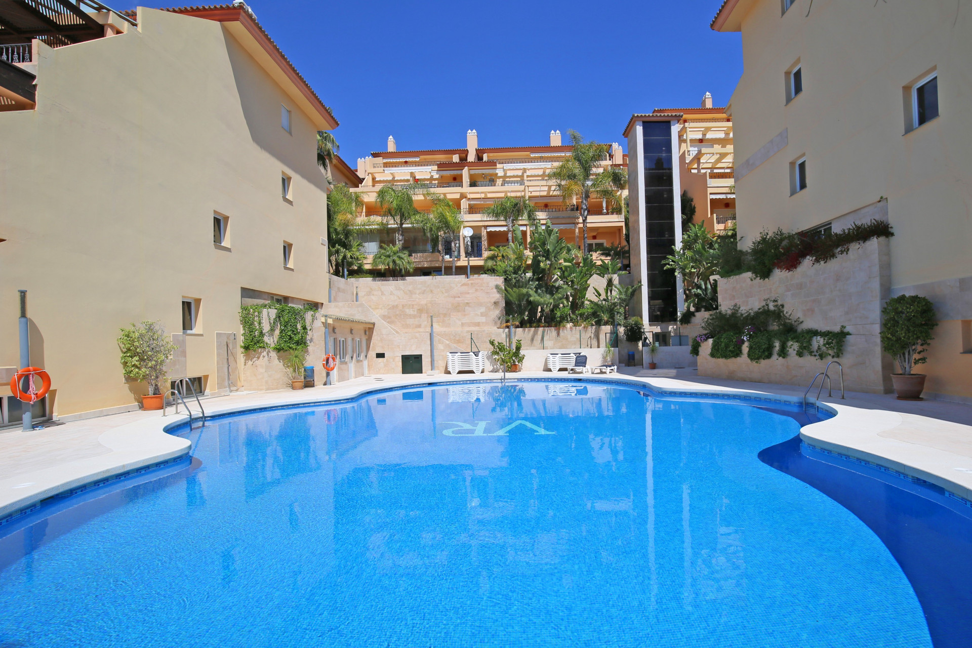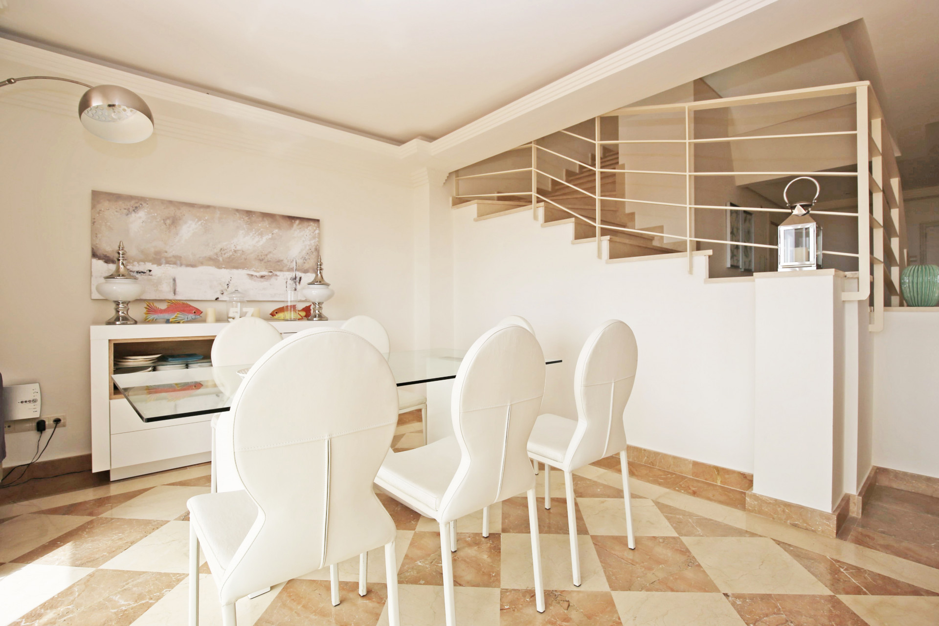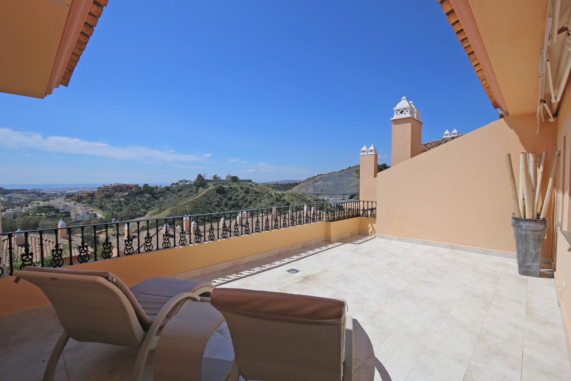 Luxurious two bedroom south facing duplex penthouse with amazing sea views in Vista Real, Nueva Andalucia just a short drive down the the best sandy beaches, gourmet restaurants, shops and other amenities. This apartment is situated in a gated complex with 24 hr security service and has a communal swimming pool. The property has on the main level a spacious entrance leading to the living-dining area with fire place offering direct access to the large terrace where you can enjoy the sea views; fully equipped kitchen with a separate laundry area; a spacious guest suite with an access to the terrace and a guest toilet. On the upper level you find the master suite with a walk-in shower and its own private terrace where you can sun bathe and enjoy the magnificent views. Other features include marble floors, fitted wardrobes, and underground parking space and air conditioning.