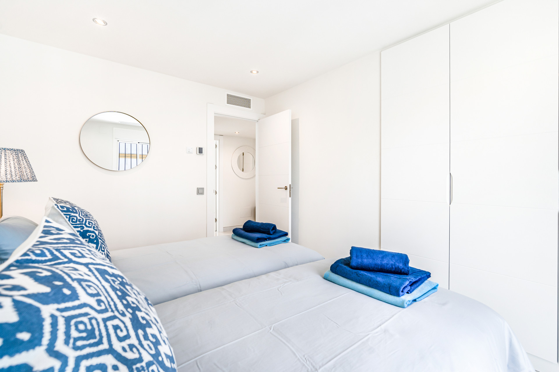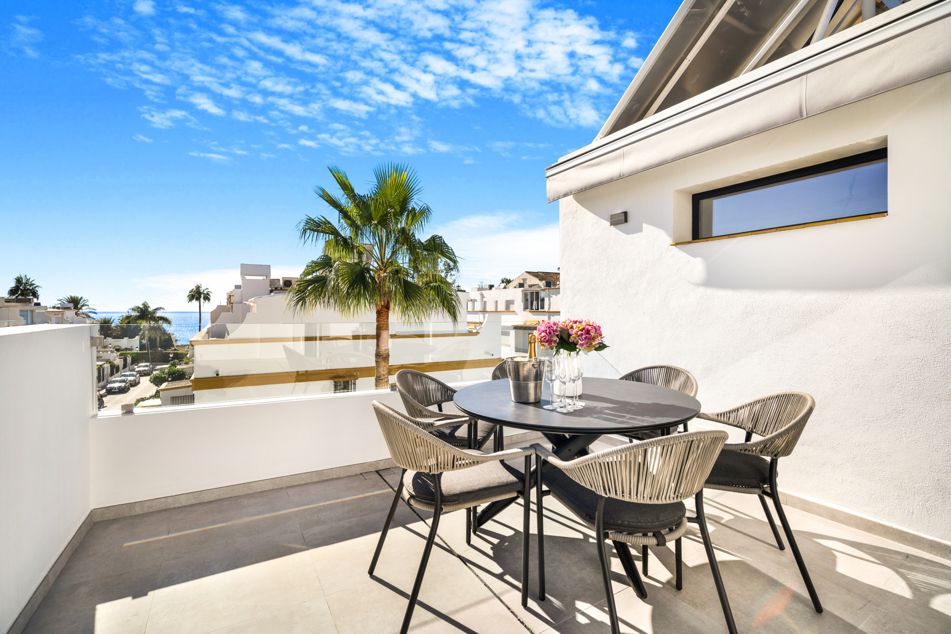 On the upper level is another double guest bedroom with its own bathroom and an upper living room with a kitchenette, providing access to the roof terrace, where guests can enjoy amazing views of the beach and sea, as well as a comfortable dining area.