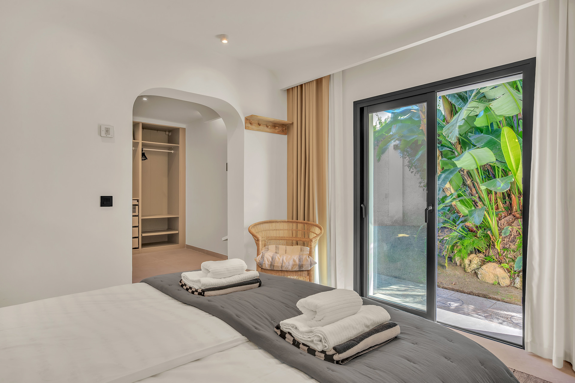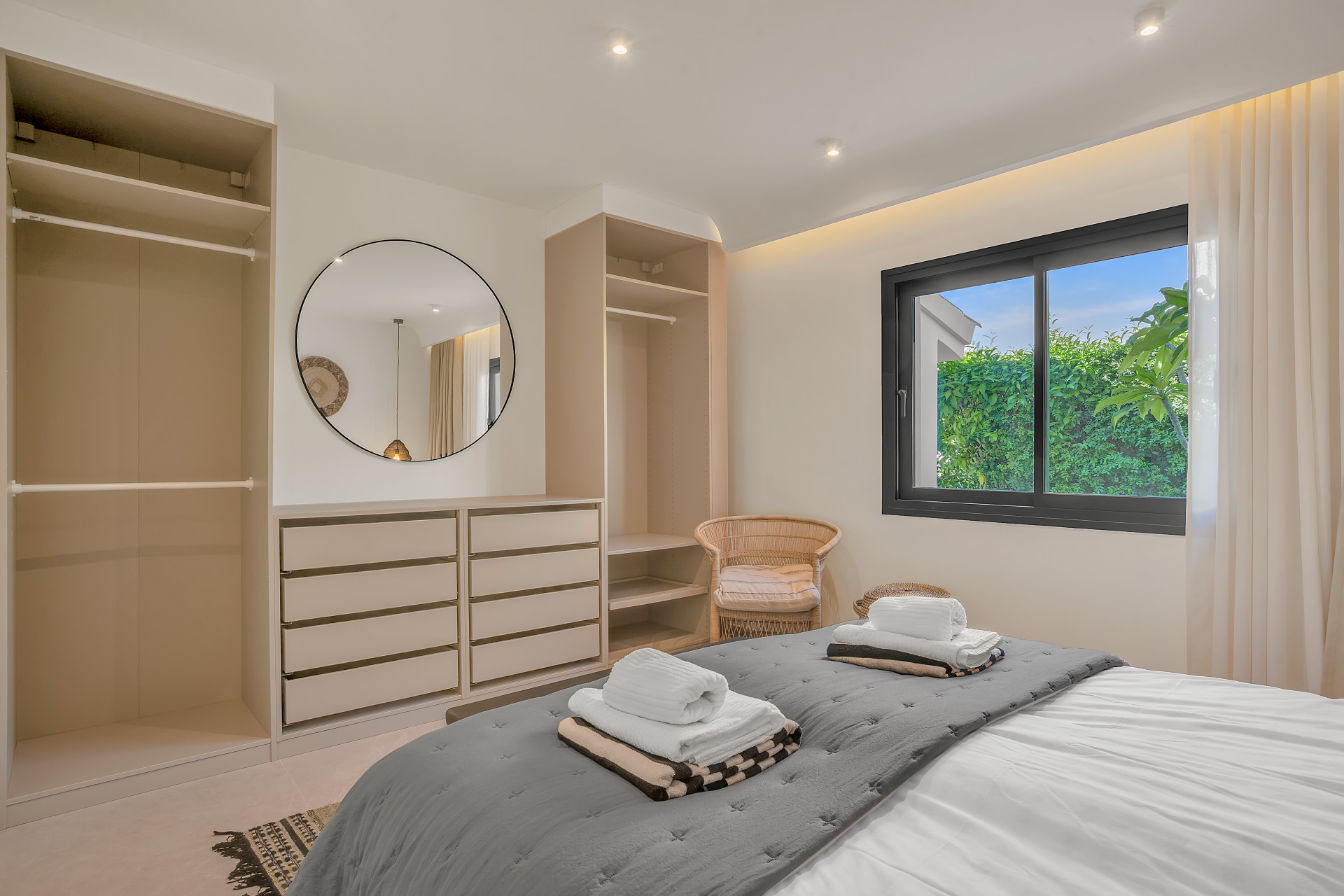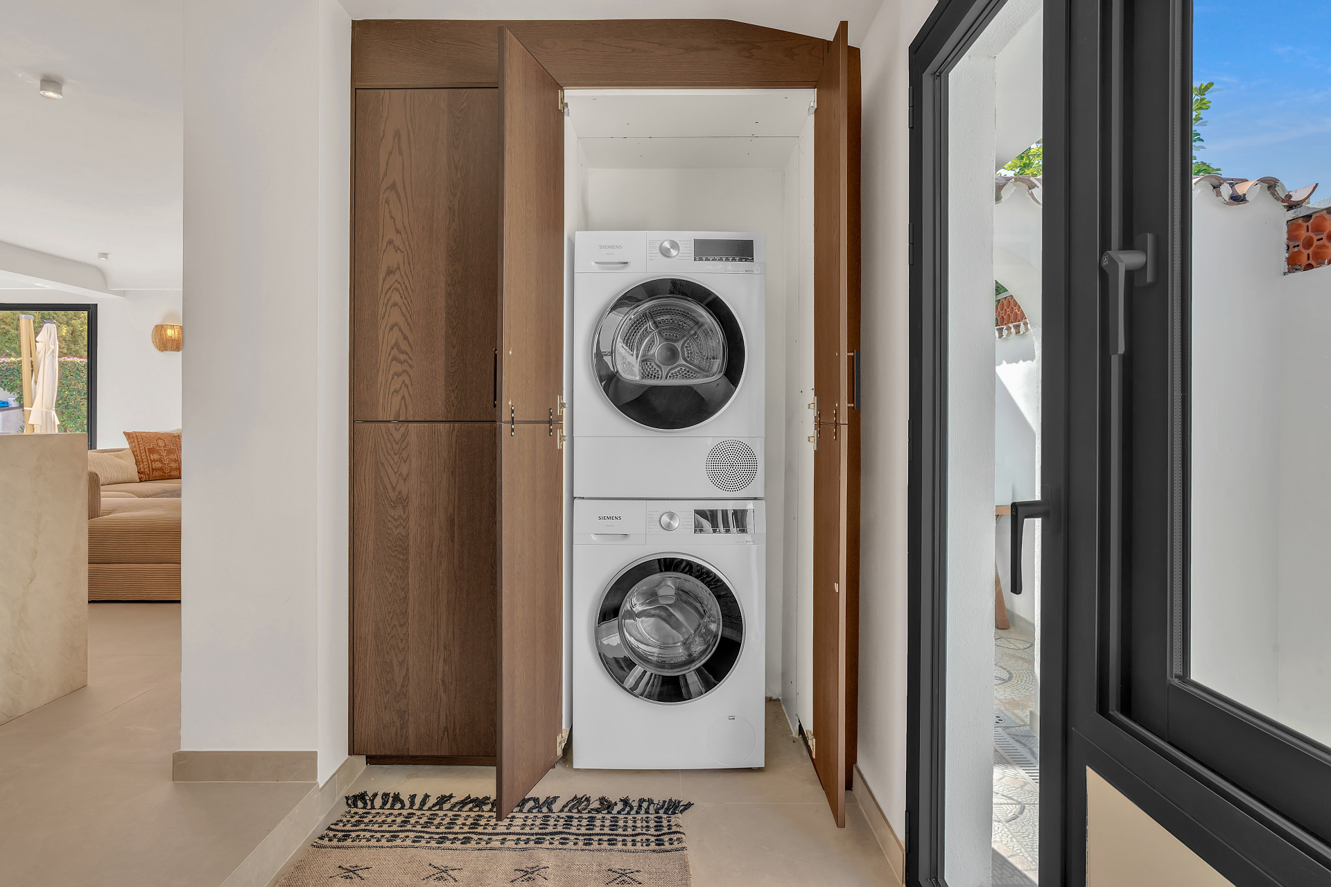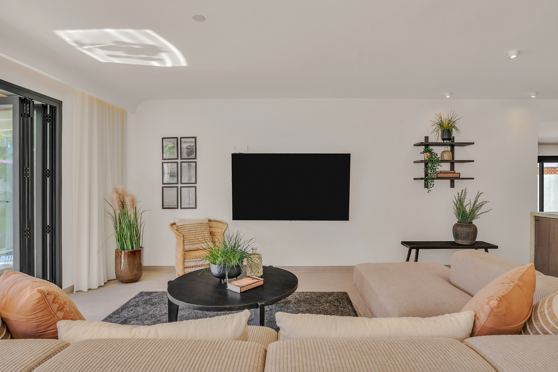 A unique home with contemporary style and a warm, welcoming feel, the villa has been newly furnished and thoughtfully decorated throughout. Fresh interiors, quality finishes, and elegant design details elevate the home while still keeping it practical and inviting for families and groups alike. The open-plan living and dining area is bright and airy, with large windows filling the space with natural light. Double doors connect this space to the garden and pool, creating a seamless indoor–outdoor flow ideal for Mediterranean living. The modern kitchen is fully equipped with induction cooking and state-of-the-art appliances, offering everything needed for preparing meals at home.