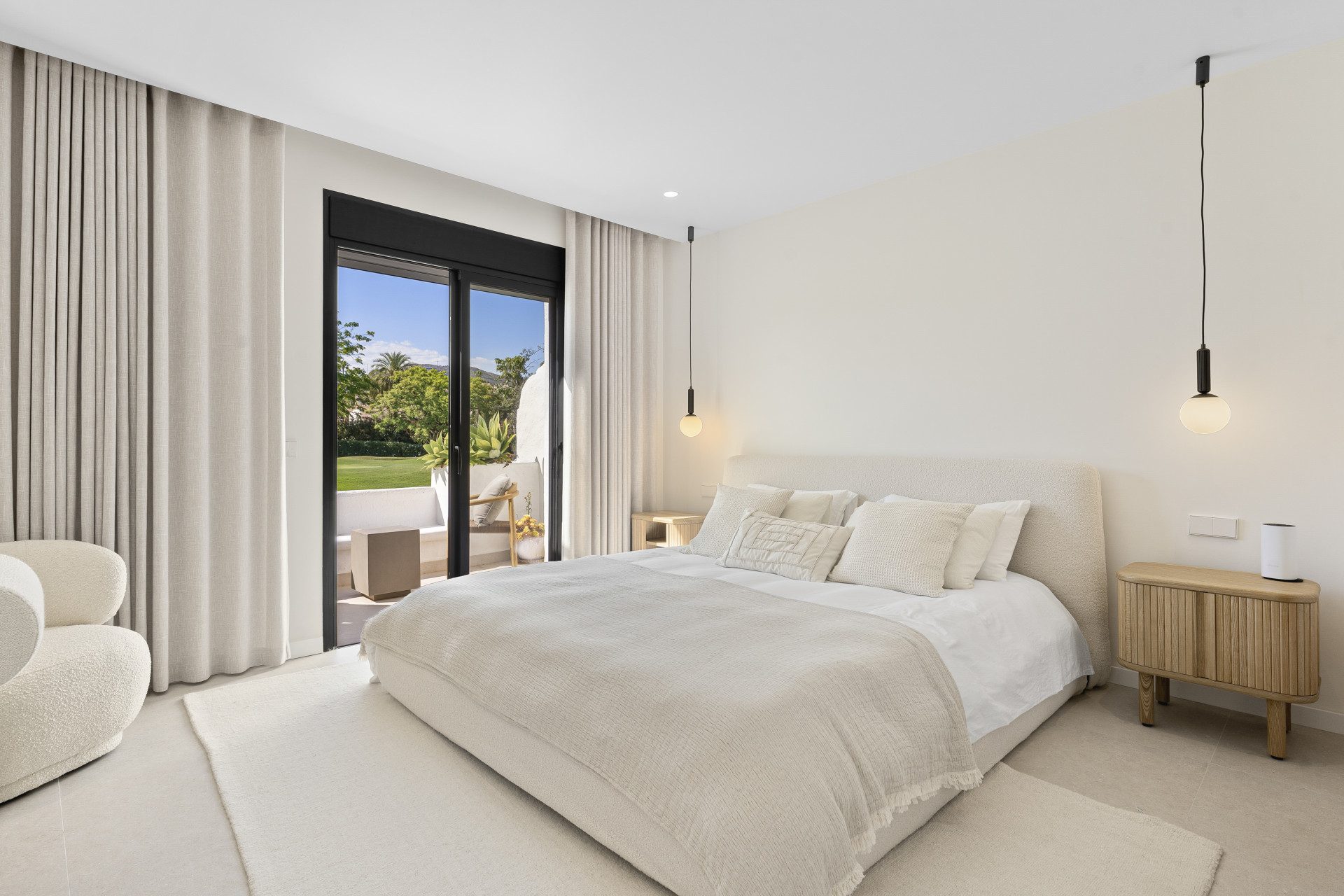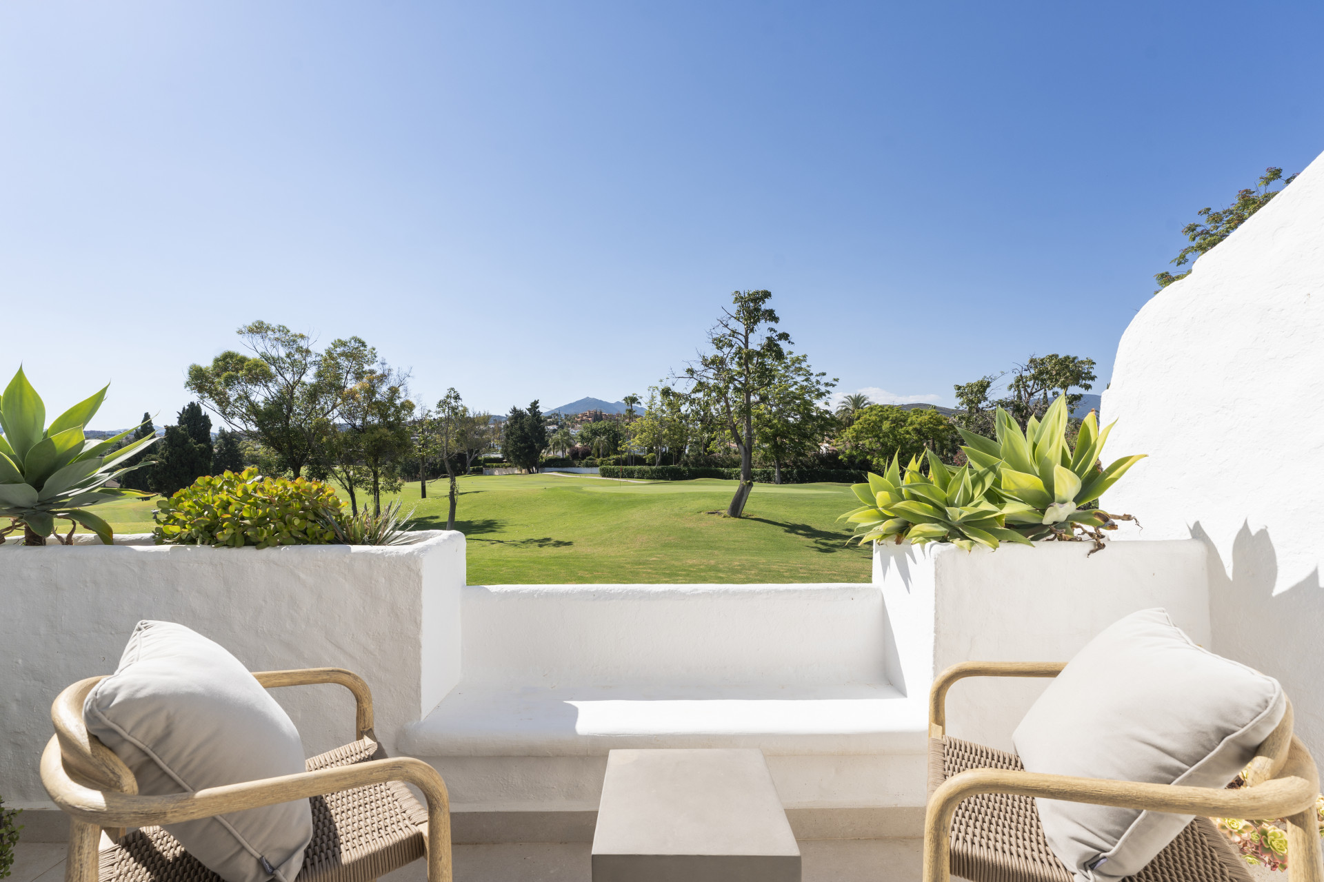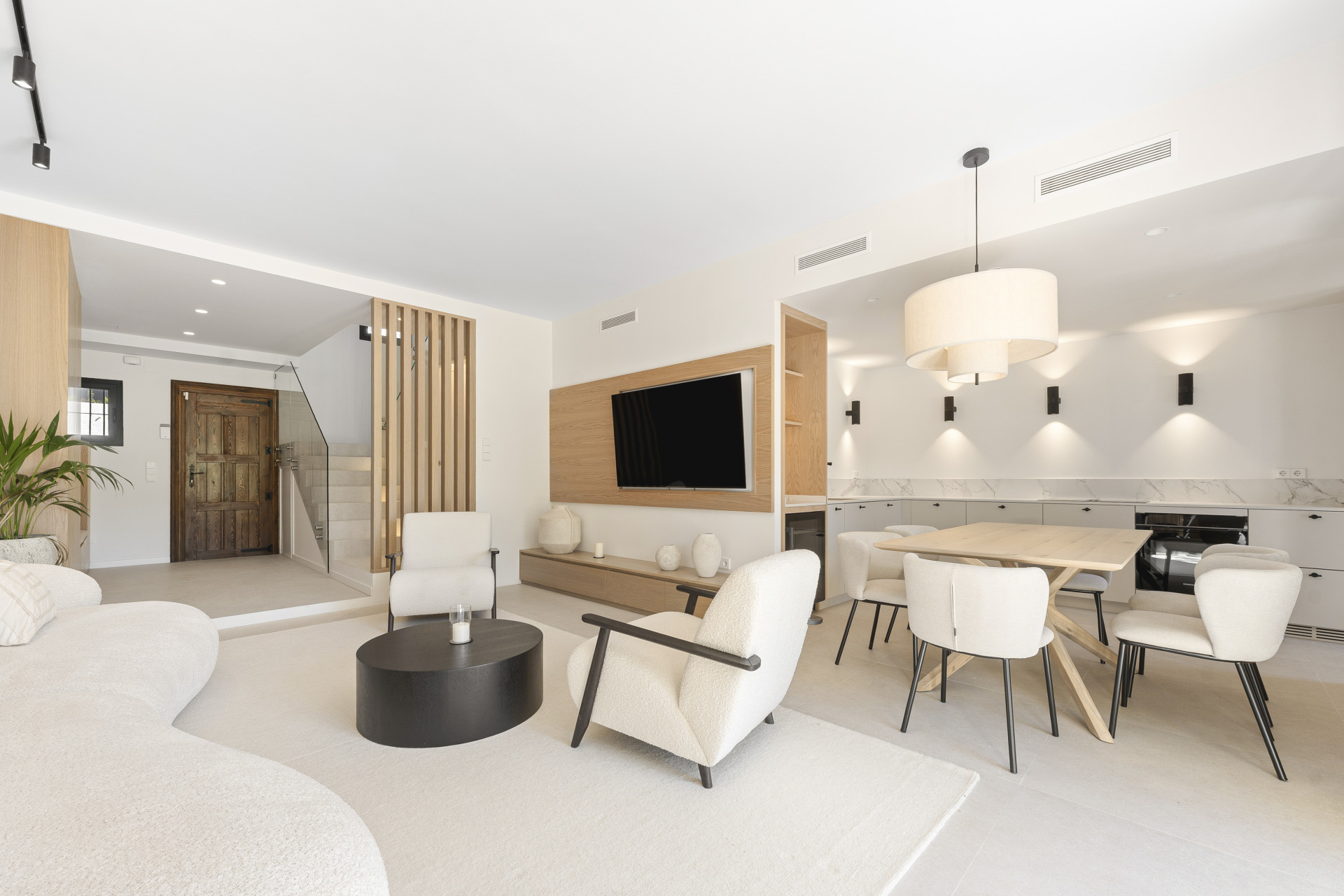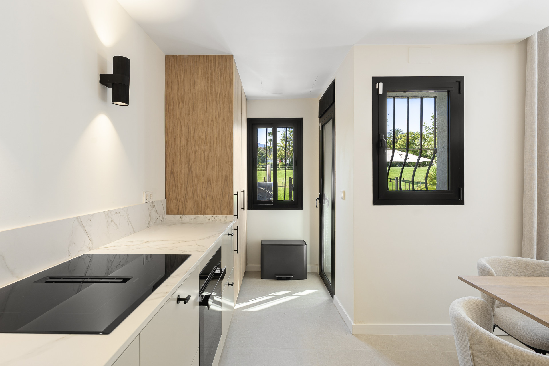 Beautifully renovated townhouse located in the exclusive gated community of Los Naranjos Country Club in Nueva Andalucía’s sought-after Golf Valley. Fully refurbished in 2023, the home showcases modern Scandinavian design with high-end finishes, including natural wood, matte black accents, and premium Miele appliances. This two-story property offers three bedrooms and three bathrooms with a smart layout that separates social and private spaces. The open-plan ground floor combines the kitchen, living, and dining areas, seamlessly connecting to a terrace with stunning views of the golf course and nearby mountains. Floor-to-ceiling glass doors fill the space with natural light, while double-glazed windows and electric blinds ensure comfort year-round. The master and guest bedrooms offer direct terrace access, ideal for peaceful mornings or evening relaxation. The northwest orientation provides soft afternoon light, enhancing the tranquil atmosphere. Set within a low-density community known for its serene environment, residents enjoy access to a large swimming pool, mature gardens, a communal outdoor kitchen, and ample parking. The area offers a perfect balance of privacy and lifestyle, attracting both full-time residents and holiday homeowners. The townhouse is just minutes from Centro Plaza, with its shops, cafés, and popular Saturday market. Puerto Banús, luxury shopping, and top restaurants like Mosh Fun Kitchen and La Sala are all nearby. Excellent international schools such as Aloha College and Swan School are easily accessible, and the area is well connected by public transport and major highways.