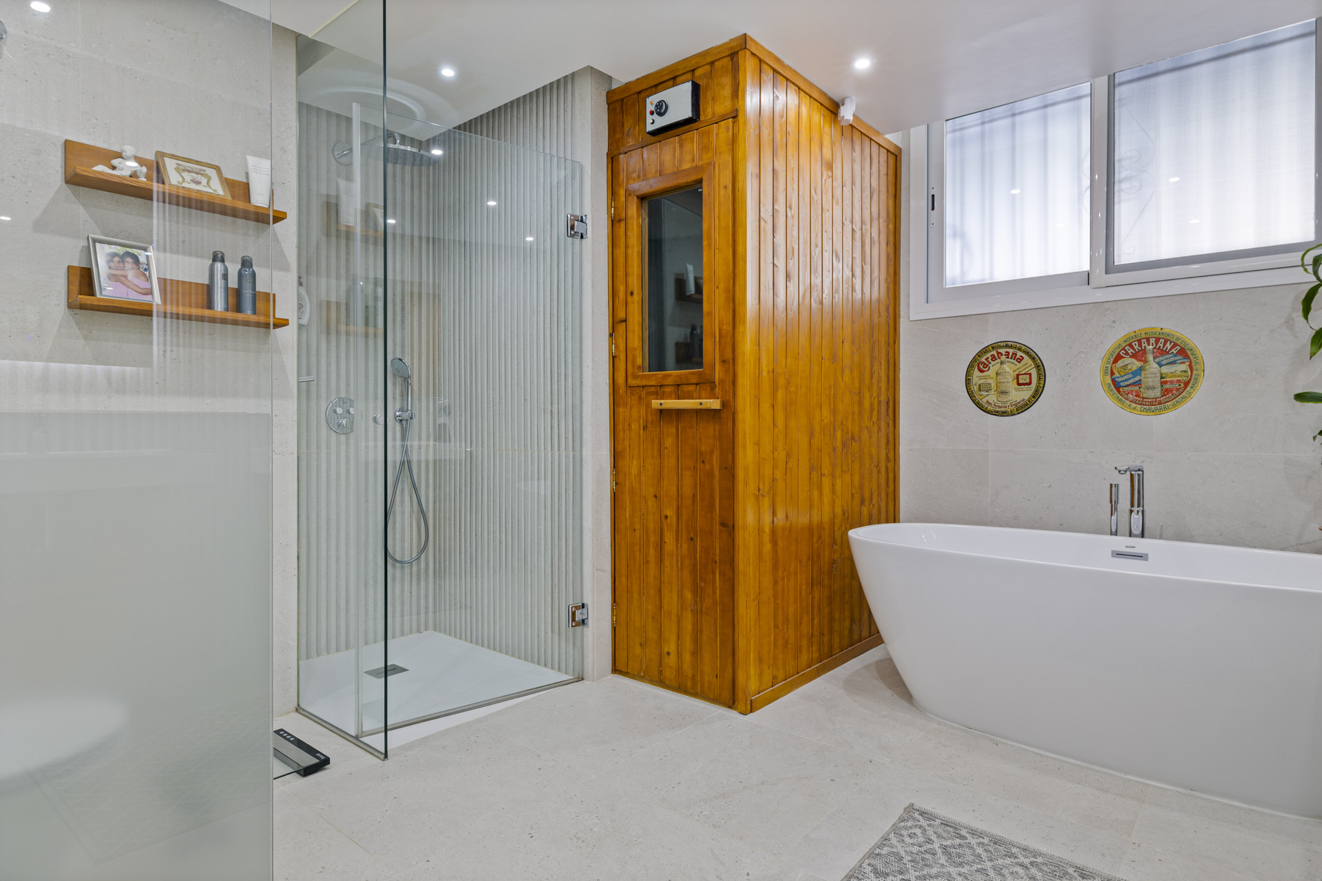 The main floor welcomes with an entrance hallway leading to a guest toilet, and a large living and dining area that features a charming fireplace. This expansive space boasts direct access to ample covered and open terraces, as well as a private garden, perfect for outdoor entertaining. The fully fitted new kitchen is equipped with top-of-the-line Bosch and Liebherr appliances and includes a breakfast area. Additionally, there is the potential to incorporate one or two guest bedrooms sharing a well-appointed bathroom on this level.